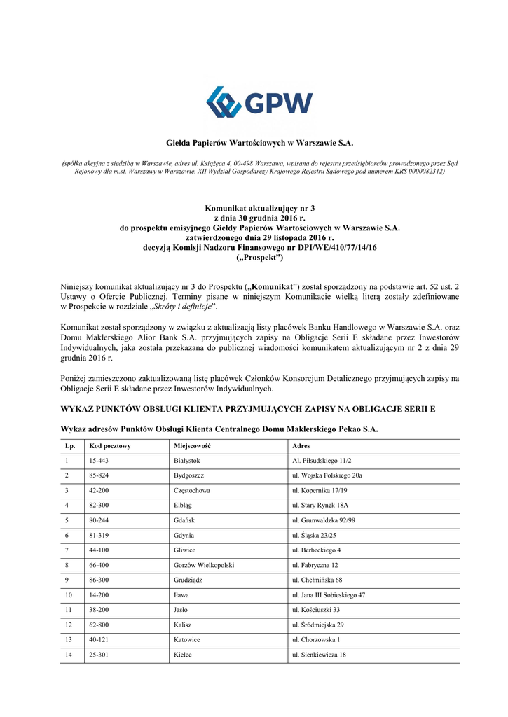 Giełda Papierów Wartościowych w Warszawie S.A. (spółka akcyjna z siedzibą w Warszawie, adres ul. Książęca 4, 00-498 Warszawa, wpisana do rejestru przedsiębiorców prowadzonego przez Sąd Rejonowy dla m.st. Warszawy w Warszawie, XII Wydział Gospodarczy Krajowego Rejestru Sądowego pod numerem KRS 0000082312) Komunikat aktualizujący nr 3 z dnia 30 grudnia 2016 r. do prospektu emisyjnego Giełdy Papierów Wartościowych w Warszawie S.A. zatwierdzonego dnia 29 listopada 2016 r. decyzją Komisji Nadzoru Finansowego nr DPI/WE/410/77/14/16 („Prospekt”) Niniejszy komunikat aktualizujący nr 3 do Prospektu („Komunikat”) został sporządzony na podstawie art. 52 ust. 2 Ustawy o Ofercie Publicznej. Terminy pisane w niniejszym Komunikacie wielką literą zostały zdefiniowane w Prospekcie w rozdziale „Skróty i definicje”. Komunikat został sporządzony w związku z aktualizacją listy placówek Banku Handlowego w Warszawie S.A. oraz Domu Maklerskiego Alior Bank S.A. przyjmujących zapisy na Obligacje Serii E składane przez Inwestorów Indywidualnych, jaka została przekazana do publicznej wiadomości komunikatem aktualizującym nr 2 z dnia 29 grudnia 2016 r. Poniżej zamieszczono zaktualizowaną listę placówek Członków Konsorcjum Detalicznego przyjmujących zapisy na Obligacje Serii E składane przez Inwestorów Indywidualnych. WYKAZ PUNKTÓW OBSŁUGI KLIENTA PRZYJMUJĄCYCH ZAPISY NA OBLIGACJE SERII E Wykaz adresów Punktów Obsługi Klienta Centralnego Domu Maklerskiego Pekao S.A. Lp. Kod pocztowy Miejscowość Adres 1 15-443 Białystok Al. Piłsudskiego 11/2 2 85-824 Bydgoszcz ul. Wojska Polskiego 20a 3 42-200 Częstochowa ul. Kopernika 17/19 4 82-300 Elbląg ul. Stary Rynek 18A 5 80-244 Gdańsk ul. Grunwaldzka 92/98 6 81-319 Gdynia ul. Śląska 23/25 7 44-100 Gliwice ul. Berbeckiego 4 8 66-400 Gorzów Wielkopolski ul. Fabryczna 12 9 86-300 Grudziądz ul. Chełmińska 68 10 14-200 Iława ul. Jana III Sobieskiego 47 11 38-200 Jasło ul. Kościuszki 33 12 62-800 Kalisz ul. Śródmiejska 29 13 40-121 Katowice ul. Chorzowska 1 14 25-301 Kielce ul. Sienkiewicza 18 15 46-203 Kluczbork ul. Grunwaldzka 13c 16 62-510 Konin ul. Kosmonautów 14 17 31-072 Kraków ul. Wielopole 1 18 30-960 Kraków Rynek Główny 47 19 38-400 Krosno ul. Powstańców Warszawskich 3 20 64-100 Leszno ul. Wróblewskiego 6 21 59-300 Lubin ul. Bankowa 16a 22 20-076 Lublin ul. Krakowskie Przedmieście 72 23 18-400 Łomża ul. Małachowskiego 1 24 90-361 Łódź ul. Piotrkowska 270 25 90-514 Łódź Al. Kościuszki 63 26 39-300 Mielec ul. Pisarka 10 27 48-300 Nysa ul. Marcinkowskiego 1 28 10-118 Olsztyn ul. 1-go Maja 10 29 45-027 Opole ul. Osmańczyka 15 30 64-920 Piła ul. Browarna 21 31 09-400 Płock ul. Tysiąclecia 10 32 61-807 Poznań ul. Św. Marcin 52/56 33 61-770 Poznań ul. Paderewskiego 3 34 37-700 Przemyśl ul. Mickiewicza 6 35 24-100 Puławy ul. Partyzantów 8 36 26-610 Radom ul. Piłsudskiego 15 37 35-959 Rzeszów Al. Cieplińskiego 1 38 27-600 Sandomierz ul. Kościuszki 4 39 76-200 Słupsk ul. Tuwima 30 40 81-874 Sopot ul. Mikołaja Reja 13/15 41 37-450 Stalowa Wola ul. Jana Pawła II 13 42 73-110 Stargard Szczeciński ul. Czarnieckiego 16 43 70-412 Szczecin Al. Papieża Jana Pawła II 5 44 70-405 Szczecin ul. Bogurodzicy 5 45 72-600 Świnoujście ul. Piłsudskiego 4 46 33-100 Tarnów Pl. Kazimierza Wielkiego 3a 47 87-100 Toruń ul. Grudziądzka 29 48 00-095 Warszawa Pl. Bankowy 2 49 02-675 Warszawa ul. Wołoska 18 50 00-043 Warszawa ul. Czackiego 21/23 51 98-300 Wieluń Pl. Kazimierza Wielkiego 3 52 87-800 Włocławek ul. Zduńska 6/8/12 53 50-125 Wrocław ul. Św. Mikołaja 8-11 54 50-111 Wrocław ul. Malarska 27/29 55 98-220 Zduńska Wola Al. Kościuszki 2 56 15-443 Białystok Al. Piłsudskiego 11/2 Wykaz adresów Punktów Usług Maklerskich Domu Maklerskiego Pekao Lp. Kod pocztowy Miejscowość Ulica 1 15-950 Białystok Rynek Kościuszki 7 2 17-100 Bielsk Podlaski Adama Mickiewicza 55 3 43-300 Bielsko-Biała R. Dmowskiego 16 4 32-700 Bochnia Kazimierza Wielkiego 9 5 85-097 Bydgoszcz Jagiellońska 34 6 32-500 Chrzanów Henryka 31 7 06-400 Ciechanów pl. Jana Pawła II 8 8 39-200 Dębica Tadeusza Kościuszki 6 9 13-200 Działdowo pl. Mickiewicza 2/3 10 80-237 Gdańsk Uphagena 27 11 44-100 Gliwice Prymasa Stefana Wyszyńskiego 6 12 40-161 Katowice al. Wojciecha Korfantego 56 13 25-519 Kielce al. 1000-lecia Państwa Polskiego 4 14 78-100 Kołobrzeg Ppor. Edmunda Łopuskiego 6 15 30-955 Kraków Józefińska 18 16 31-926 Kraków os. Centrum B 1 17 31-072 Kraków Starowiślna 2 18 20-076 Lublin Krakowskie Przedmieście 72 19 90-950 Łódź al. Tadeusza Kościuszki 63 20 41-400 Mysłowice Mikołowska 6 21 32-400 Myślenice Gałczyńskiego 9 22 33-300 Nowy Sącz Jagiellońska 26 23 32-300 Olkusz Króla Kazimierza Wielkiego 49 24 10-959 Olsztyn Dąbrowszczaków 11 25 45-027 Opole Osmańczyka 15 26 07-300 Ostrów Mazowiecka Grota Roweckiego 1 27 32-600 Oświęcim Władysława Jagiełły 12 28 09-400 Płock Tysiąclecia 10 29 61-738 Poznań pl. Wolności 18 30 05-800 Pruszków al. Wojska Polskiego 23 31 26-600 Radom Tadeusza Kościuszki 2 32 44-200 Rybnik 3 maja 10 33 35-017 Rzeszów Słowackiego 5 34 41-200 Sosnowiec Małachowskiego 3 35 70-560 Szczecin Grodzka 9 36 33-100 Tarnów Wałowa 10 37 34-100 Wadowice Lwowska 9 38 00-374 Warszawa Al. Jerozolimskie 2 39 00-958 Warszawa Towarowa 25 40 50-079 Wrocław Ruska 51 41 41-800 Zabrze pl. Warszawski 9 42 65-213 Zielona Góra Podgórna 9a 43 34-300 Żywiec Kościuszki 46 Wykaz adresów Punktów Obsługi Klienta Domu Inwestycyjnego Xelion Sp. z o.o. Lp. Kod pocztowy Miejscowość Adres 1 80-309 Gdańsk Al. Grunwaldzka 411 2 40-004 Katowice Al. Korfantego 2 3 31-503 Kraków Centrum Biurowe LUBICZ ul. Lubicz 23 4 61-831 Poznań Kupiec Poznański pl. Wiosny Ludów 2 5 02-595 Warszawa ul. Puławska 107 6 50-059 Wrocław ul. Ofiar Oświęcimskich 41/43 7 02-595 Kanał zdalny Internet ul. Puławska 107, Warszawa 8 02-595 Kanał zdalny Telefon ul. Puławska 10