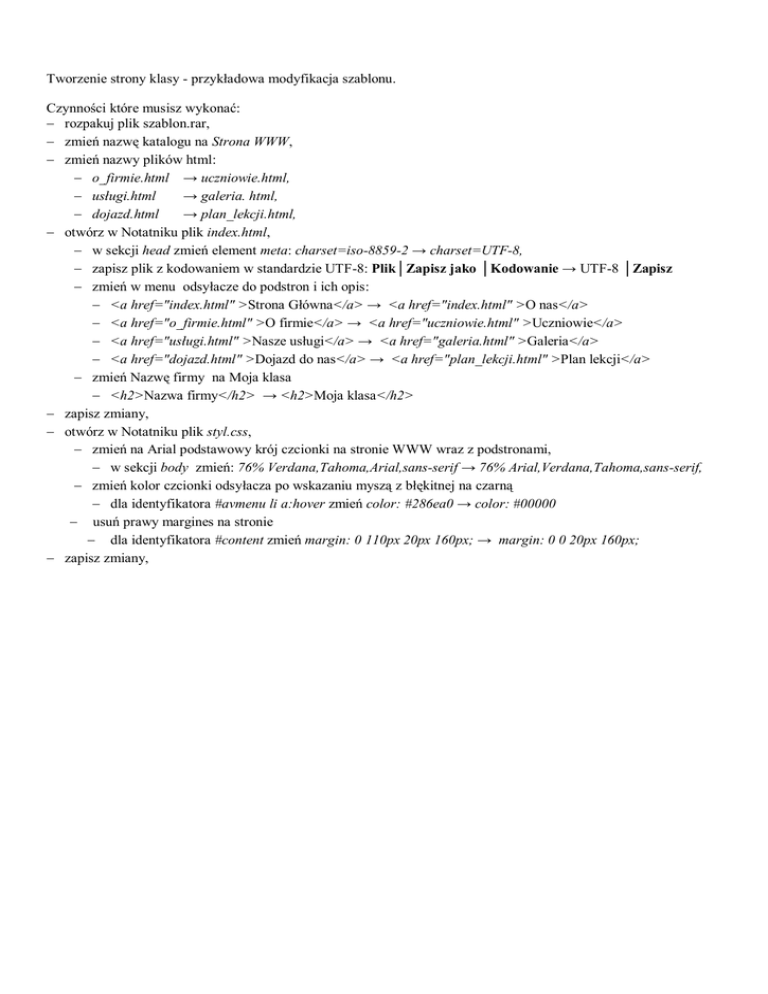 Tworzenie strony klasy - przykładowa modyfikacja szablonu. Czynności które musisz wykonać: rozpakuj plik szablon.rar, zmień nazwę katalogu na Strona WWW, zmień nazwy plików html: o_firmie.html → uczniowie.html, usługi.html → galeria. html, dojazd.html → plan_lekcji.html, otwórz w Notatniku plik index.html, w sekcji head zmień element meta: charset=iso-8859-2 → charset=UTF-8, zapisz plik z kodowaniem w standardzie UTF-8: Plik│Zapisz jako │Kodowanie → UTF-8 │Zapisz zmień w menu odsyłacze do podstron i ich opis: <a href="index.html" >Strona Główna</a> → <a href="index.html" >O nas</a> <a href="o_firmie.html" >O firmie</a> → <a href="uczniowie.html" >Uczniowie</a> <a href="usługi.html" >Nasze usługi</a> → <a href="galeria.html" >Galeria</a> <a href="dojazd.html" >Dojazd do nas</a> → <a href="plan_lekcji.html" >Plan lekcji</a> zmień Nazwę firmy na Moja klasa <h2>Nazwa firmy</h2> → <h2>Moja klasa</h2> zapisz zmiany, otwórz w Notatniku plik styl.css, zmień na Arial podstawowy krój czcionki na stronie WWW wraz z podstronami, w sekcji body zmień: 76% Verdana,Tahoma,Arial,sans-serif → 76% Arial,Verdana,Tahoma,sans-serif, zmień kolor czcionki odsyłacza po wskazaniu myszą z błękitnej na czarną dla identyfikatora #avmenu li a:hover zmień color: #286ea0 → color: #00000 usuń prawy margines na stronie dla identyfikatora #content zmień margin: 0 110px 20px 160px; → margin: 0 0 20px 160px; zapisz zmiany,