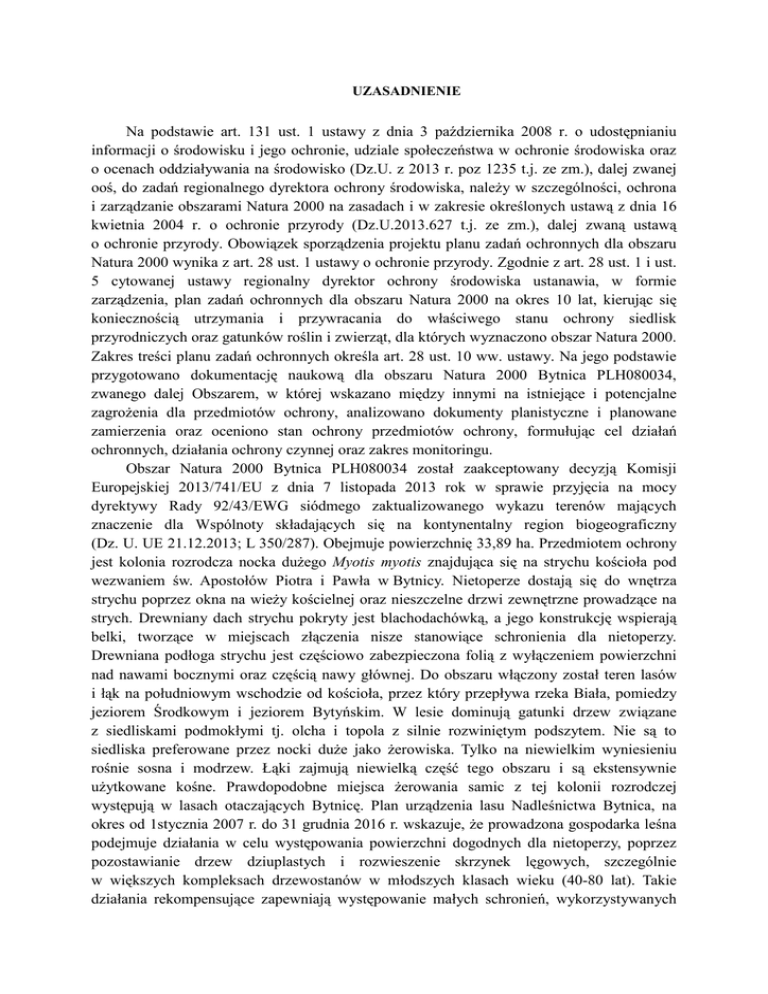 UZASADNIENIE Na podstawie art. 131 ust. 1 ustawy z dnia 3 października 2008 r. o udostępnianiu informacji o środowisku i jego ochronie, udziale społeczeństwa w ochronie środowiska oraz o ocenach oddziaływania na środowisko (Dz.U. z 2013 r. poz 1235 t.j. ze zm.), dalej zwanej ooś, do zadań regionalnego dyrektora ochrony środowiska, należy w szczególności, ochrona i zarządzanie obszarami Natura 2000 na zasadach i w zakresie określonych ustawą z dnia 16 kwietnia 2004 r. o ochronie przyrody (Dz.U.2013.627 t.j. ze zm.), dalej zwaną ustawą o ochronie przyrody. Obowiązek sporządzenia projektu planu zadań ochronnych dla obszaru Natura 2000 wynika z art. 28 ust. 1 ustawy o ochronie przyrody. Zgodnie z art. 28 ust. 1 i ust. 5 cytowanej ustawy regionalny dyrektor ochrony środowiska ustanawia, w formie zarządzenia, plan zadań ochronnych dla obszaru Natura 2000 na okres 10 lat, kierując się koniecznością utrzymania i przywracania do właściwego stanu ochrony siedlisk przyrodniczych oraz gatunków roślin i zwierząt, dla których wyznaczono obszar Natura 2000. Zakres treści planu zadań ochronnych określa art. 28 ust. 10 ww. ustawy. Na jego podstawie przygotowano dokumentację naukową dla obszaru Natura 2000 Bytnica PLH080034, zwanego dalej Obszarem, w której wskazano między innymi na istniejące i potencjalne zagrożenia dla przedmiotów ochrony, analizowano dokumenty planistyczne i planowane zamierzenia oraz oceniono stan ochrony przedmiotów ochrony, formułując cel działań ochronnych, działania ochrony czynnej oraz zakres monitoringu. Obszar Natura 2000 Bytnica PLH080034 został zaakceptowany decyzją Komisji Europejskiej 2013/741/EU z dnia 7 listopada 2013 rok w sprawie przyjęcia na mocy dyrektywy Rady 92/43/EWG siódmego zaktualizowanego wykazu terenów mających znaczenie dla Wspólnoty składających się na kontynentalny region biogeograficzny (Dz. U. UE 21.12.2013; L 350/287). Obejmuje powierzchnię 33,89 ha. Przedmiotem ochrony jest kolonia rozrodcza nocka dużego Myotis myotis znajdująca się na strychu kościoła pod wezwaniem św. Apostołów Piotra i Pawła w Bytnicy. Nietoperze dostają się do wnętrza strychu poprzez okna na wieży kościelnej oraz nieszczelne drzwi zewnętrzne prowadzące na strych. Drewniany dach strychu pokryty jest blachodachówką, a jego konstrukcję wspierają belki, tworzące w miejscach złączenia nisze stanowiące schronienia dla nietoperzy. Drewniana podłoga strychu jest częściowo zabezpieczona folią z wyłączeniem powierzchni nad nawami bocznymi oraz częścią nawy głównej. Do obszaru włączony został teren lasów i łąk na południowym wschodzie od kościoła, przez który przepływa rzeka Biała, pomiedzy jeziorem Środkowym i jeziorem Bytyńskim. W lesie dominują gatunki drzew związane z siedliskami podmokłymi tj. olcha i topola z silnie rozwiniętym podszytem. Nie są to siedliska preferowane przez nocki duże jako żerowiska. Tylko na niewielkim wyniesieniu rośnie sosna i modrzew. Łąki zajmują niewielką część tego obszaru i są ekstensywnie użytkowane kośne. Prawdopodobne miejsca żerowania samic z tej kolonii rozrodczej występują w lasach otaczających Bytnicę. Plan urządzenia lasu Nadleśnictwa Bytnica, na okres od 1stycznia 2007 r. do 31 grudnia 2016 r. wskazuje, że prowadzona gospodarka leśna podejmuje działania w celu występowania powierzchni dogodnych dla nietoperzy, poprzez pozostawianie drzew dziuplastych i rozwieszenie skrzynek lęgowych, szczególnie w większych kompleksach drzewostanów w młodszych klasach wieku (40-80 lat). Takie działania rekompensujące zapewniają występowanie małych schronień, wykorzystywanych przez samice w okresach nagłego załamania się pogody. Mając na uwadze powyższe oraz zróżnicowanie klas wieku powierzchni leśnych otaczających Bytnicę i wzrost liczebności populacji nietoperzy, szanse zachowania kolonii rozrodczej nocków dużych w zakresie występowania obszarów żerowiskowych oceniono jako pewne (stan właściwy - FV). Populacja rozrodcza w czasie powołania Obszaru określona została na 200-250 osobników. Liczenie nietoperzy, prowadzone w 2014 roku dla dokumentacji planu zadań ochronnych, wykazało populację rozrodczą w liczbie 360 samic. Prawie 40-to procentowy wzrost liczebność, w odniesieniu do ostatnich badań tej kolonii z lat 2007-2008, potwierdza obserwowaną w Polsce tendencję wzrostową tego gatunku. Właściwą ocenę posiada także parametr siedliska gatunku. Cała powierzchnia strychu jest dostępna dla nietoperzy i zabezpieczona przed wchodzeniem osób postronnych. Zapewniona jest dostępność wlotów dla nietoperzy. Bryła kościoła jest nieoświetlona i nie planuje się jej oświetlenia. Nie są planowane także zmiany użytkowania strychu. Stan ochrony populacji rozrodczej nocka dużego Myotis myotis został oceniony na właściwy (FV) stąd celem działań ochronnych jest utrzymanie tego stanu. Zidentyfikowane istniejące zagrożenie to nagromadzenie materii organicznej (odchodów nietoperzy). Choć przebywanie kolonii nietoperzy nie stanowi przeszkody bądź uciążliwości dla wykorzystania kościoła w celach sprawowania liturgii, ich siedliskiem jest użytkowany obiekt sakralny, w którym należy utrzymywać porządek, w celu akceptacji społecznej przedmiotu ochrony. Ponadto nagromadzone odchody mają negatywny wpływ na drewniane elementy konstrukcji stropu i więźby dachowej strychu kościoła, a tym samym na siedlisko nietoperzy. Planowane działania ochronne związane są głównie z zachowaniem trwałości siedliska nocka dużego – w tym przypadku struktury budowli i obejmują usunięcie zgromadzonych odchodów nietoperzy (guana), ochronę podłogi strychu kościoła poprzez rozłożenie folii paroprzepuszczalnej bądź innego materiału zabezpieczającego drewniane elementy strychu. Zidentyfikowane zagrożenie potencjalne dotyczy dokonywania remontu kościoła. W szczególności