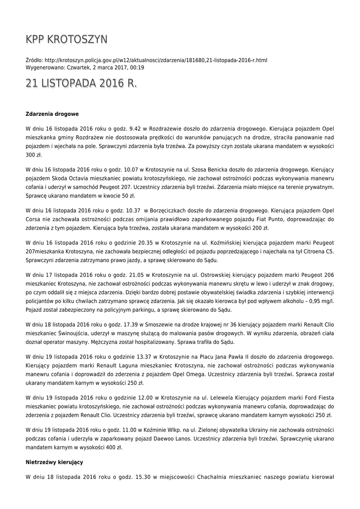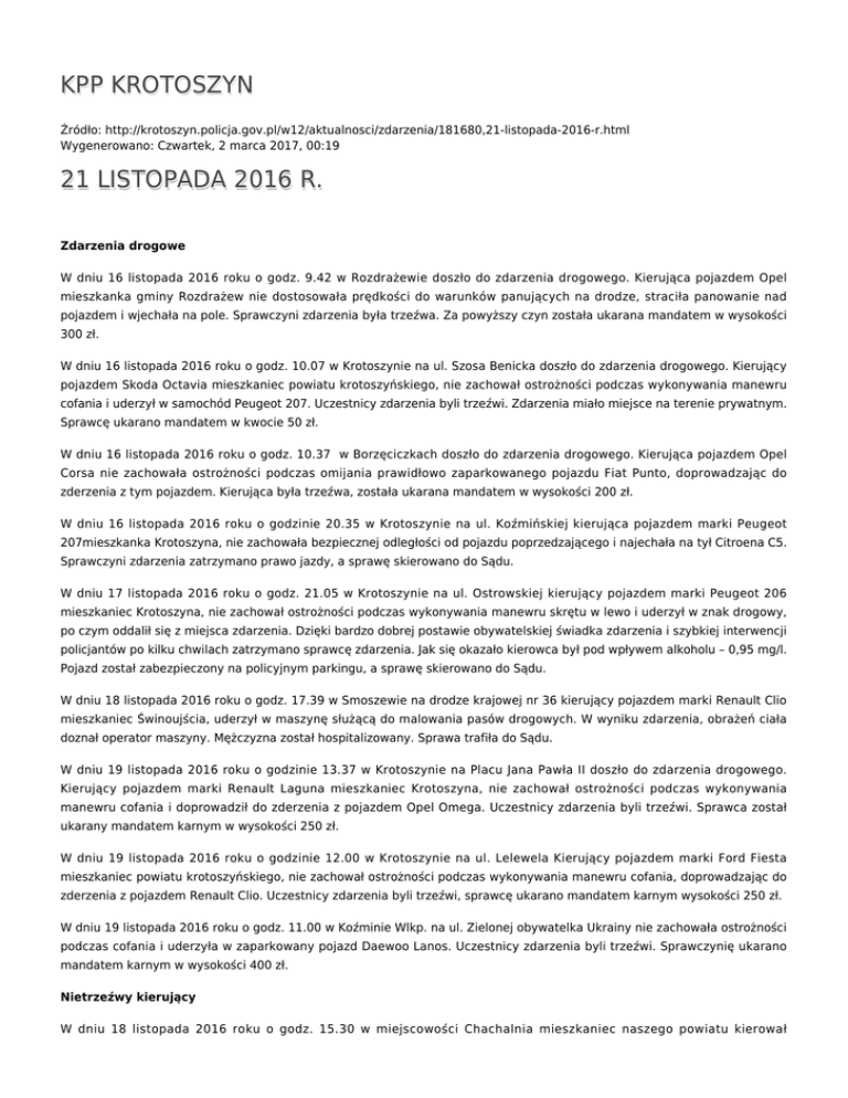 KPP KROTOSZYN Źródło: http://krotoszyn.policja.gov.pl/w12/aktualnosci/zdarzenia/181680,21-listopada-2016-r.html Wygenerowano: Czwartek, 2 marca 2017, 00:19 21 LISTOPADA 2016 R. Zdarzenia drogowe W dniu 16 listopada 2016 roku o godz. 9.42 w Rozdrażewie doszło do zdarzenia drogowego. Kierująca pojazdem Opel mieszkanka gminy Rozdrażew nie dostosowała prędkości do warunków panujących na drodze, straciła panowanie nad pojazdem i wjechała na pole. Sprawczyni zdarzenia była trzeźwa. Za powyższy czyn została ukarana mandatem w wysokości 300 zł. W dniu 16 listopada 2016 roku o godz. 10.07 w Krotoszynie na ul. Szosa Benicka doszło do zdarzenia drogowego. Kierujący pojazdem Skoda Octavia mieszkaniec powiatu krotoszyńskiego, nie zachował ostrożności podczas wykonywania manewru cofania i uderzył w samochód Peugeot 207. Uczestnicy zdarzenia byli trzeźwi. Zdarzenia miało miejsce na terenie prywatnym. Sprawcę ukarano mandatem w kwocie 50 zł. W dniu 16 listopada 2016 roku o godz. 10.37 w Borzęciczkach doszło do zdarzenia drogowego. Kierująca pojazdem Opel Corsa nie zachowała ostrożności podczas omijania prawidłowo zaparkowanego pojazdu Fiat Punto, doprowadzając do zderzenia z tym pojazdem. Kierująca była trzeźwa, została ukarana mandatem w wysokości 200 zł. W dniu 16 listopada 2016 roku o godzinie 20.35 w Krotoszynie na ul. Koźmińskiej kierująca pojazdem marki Peugeot 207mieszkanka Krotoszyna, nie zachowała bezpiecznej odległości od pojazdu poprzedzającego i najechała na tył Citroena C5. Sprawczyni zdarzenia zatrzymano prawo jazdy, a sprawę skierowano do Sądu. W dniu 17 listopada 2016 roku o godz. 21.05 w Krotoszynie na ul. Ostrowskiej kierujący pojazdem marki Peugeot 206 mieszkaniec Krotoszyna, nie zachował ostrożności podczas wykonywania manewru skrętu w lewo i uderzył w znak drogowy, po czym oddalił się z miejsca zdarzenia. Dzięki bardzo dobrej postawie obywatelskiej świadka zdarzenia i szybkiej interwencji policjantów po kilku chwilach zatrzymano sprawcę zdarzenia. Jak się okazało kierowca był pod wpływem alkoholu – 0,95 mg/l. Pojazd został zabezpieczony na policyjnym parkingu, a sprawę skierowano do Sądu. W dniu 18 listopada 2016 roku o godz. 17.39 w Smoszewie na drodze krajowej nr 36 kierujący pojazdem marki Renault Clio mieszkaniec Świnoujścia, uderzył w maszynę służącą do malowania pasów drogowych. W wyniku zdarzenia, obrażeń ciała doznał operator maszyny. Mężczyzna został hospitalizowany. Sprawa trafiła do Sądu. W dniu 19 listopada 2016 roku o godzinie 13.37 w Krotoszynie na Placu Jana Pawła II doszło do zdarzenia drogowego. Kierujący pojazdem marki Renault Laguna mieszkaniec Krotoszyna, nie zachował ostrożności podczas wykonywania manewru cofania i doprowadził do zderzenia z pojazdem Opel Omega. Uczestnicy zdarzenia byli trzeźwi. Sprawca został ukarany mandatem karnym w wysokości 250 zł. W dniu 19 listopada 2016 roku o godzinie 12.00 w Krotoszynie na ul. Lelewela Kierujący pojazdem marki Ford Fiesta mieszkaniec powiatu krotoszyńskiego, nie zachował ostrożności podczas wykonywania manewru cofania, doprowadzając do zderzenia z pojazdem Renault Clio. Uczestnicy zdarzenia byli trzeźwi, sprawcę ukarano mandatem karnym wysokości 250 zł. W dniu 19 listopada 2016 roku o godz. 11.00 w Koźminie Wlkp. na ul. Zielonej obywatelka Ukrainy nie zachowała ostrożności podczas cofania i uderzyła w zaparkowany pojazd Daewoo Lanos. Uczestnicy zdarzenia byli trzeźwi. Sprawczynię ukarano mandatem karnym w wysokości 400 zł. Nietrzeźwy kierujący W dniu 18 listopada 2016 roku o godz. 15.30 w miejscowości Chachalnia mieszkaniec naszego powiatu kierował samochodem osobowym będąc w stanie nietrzeźwości – 1,15 mg/l alkoholu w wydychanym powietrzu. Kierowcy zatrzymano prawo jazdy, a sprawę skierowano do Sądu. Kradzież W dniu 17 listopada 2016 roku o godzinie 14.53 pracownik ochrony jednego z krotoszyńskich marketów powiadomił o ujęciu sprawcy kradzieży. Policjanci po przybyciu na miejsce ustalili, że sprawcą kradzieży artykułów spożywczych była osoba nieletnia. Towar nieuszkodzony o wartości 7,38 zł wrócił do dalszej sprzedaży, a sprawę skierowano do Sądu Rodzinnego. W dniu 17 listopada 2016 roku o godzinie 20.00 pracownik jednego z krotoszyńskich sklepów powiadomił o ujęciu sprawcy kradzieży. Mieszkanka naszego powiatu dokonała kradzieży napojów alkoholowych. Towar nieuszkodzony wrócił do dalszej sprzedaży, a sprawczynię ukarano mandatem w wysokości 500 zł. Ocena: 0/5 (0) Tweetnij