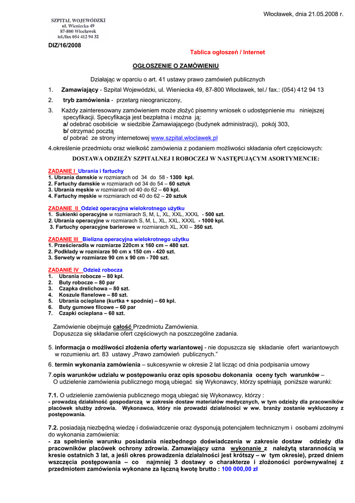 Włocławek, dnia 21.05.2008 r. DIZ/16/2008 Tablica ogłoszeń / Internet OGŁOSZENIE O ZAMÓWIENIU Działając w oparciu o art. 41 ustawy prawo zamówień publicznych 1. Zamawiający - Szpital Wojewódzki, ul. Wieniecka 49, 87-800 Włocławek, tel./ fax.: (054) 412 94 13 2. tryb zamówienia - przetarg nieograniczony, 3. Każdy zainteresowany zamówieniem może złożyć pisemny wniosek o udostępnienie mu niniejszej specyfikacji. Specyfikacja jest bezpłatna i można ją: a/ odebrać osobiście w siedzibie Zamawiającego (budynek administracji), pokój 303, b/ otrzymać pocztą c/ pobrać ze strony internetowej www.szpital.wloclawek.pl 4.określenie przedmiotu oraz wielkość zamówienia z podaniem możliwości składania ofert częściowych: DOSTAWA ODZIEŻY SZPITALNEJ I ROBOCZEJ W NASTĘPUJĄCYM ASORTYMENCIE: ZADANIE I Ubrania i fartuchy 1. Ubrania damskie w rozmiarach od 34 do 58 - 1300 kpl. 2. Fartuchy damskie w rozmiarach od 34 do 54 – 60 sztuk 3. Ubrania męskie w rozmiarach od 40 do 62 – 60 kpl. 4. Fartuchy męskie w rozmiarach od 40 do 62 – 20 sztuk ZADANIE II Odzież operacyjna wielokrotnego użytku 1. Sukienki operacyjne w rozmiarach S, M, L, XL, XXL, XXXL - 500 szt. 2. Ubrania operacyjne w rozmiarach S, M, L, XL, XXL, XXXL - 1000 kpl. 3. Fartuchy operacyjne barierowe w rozmiarach XL, XXl – 350 szt. ZADANIE III Bielizna operacyjna wielokrotnego użytku 1. Prześcieradła w rozmiarze 220cm x 160 cm – 480 szt. 2. Podkłady w rozmiarze 90 cm x 150 cm - 420 szt. 3. Serwety w rozmiarze 90 cm x 90 cm - 700 szt. ZADANIE IV Odzież robocza 1. Ubrania robocze – 80 kpl. 2. Buty robocze – 80 par 3. Czapka drelichowa – 80 szt. 4. Koszule flanelowe – 80 szt. 5. Ubrania ocieplane (kurtka + spodnie) – 60 kpl. 6. Buty gumowe filcowe – 60 par 7. Czapki ocieplana – 60 szt. Zamówienie obejmuje całość Przedmiotu Zamówienia. Dopuszcza się składanie ofert częściowych na poszczególne zadania. 5. informacja o możliwości złożenia oferty wariantowej - nie dopuszcza się składanie ofert wariantowych w rozumieniu art. 83 ustawy „Prawo zamówień publicznych.” 6. termin wykonania zamówienia – sukcesywnie w okresie 2 lat licząc od dnia podpisania umowy 7.opis warunków udziału w postępowaniu oraz opis sposobu dokonania oceny tych warunków – O udzielenie zamówienia publicznego mogą ubiegać się Wykonawcy, którzy spełniają poniższe warunki: 7.1. O udzielenie zamówienia publicznego mogą ubiegać się Wykonawcy, którzy : - prowadzą działalność gospodarczą w zakresie dostaw materiałów medycznych, w tym odzieży dla pracowników placówek służby zdrowia. Wykonawca, który nie prowadzi działalności w ww. branży zostanie wykluczony z postępowania. 7.2. posiadają niezbędną wiedzę i doświadczenie oraz dysponują potencjałem technicznym i osobami zdolnymi do wykonania zamówienia: - za spełnienie warunku posiadania niezbędnego doświadczenia w zakresie dostaw odzieży dla pracowników placówek ochrony zdrowia. Zamawiający uzna wykonanie z należytą starannością w kresie ostatnich 3 lat, a jeśli okres prowadzenia działalności jest krótszy – w tym okresie), przed dniem wszczęcia postępowania – co najmniej 3 dostawy o charakterze i złożoności porównywalnej z przedmiotem zamówienia wykonane za łączną kwotę brutto : 100 000,00 zł 3. nie podlegają wykluczeniu z postępowania o udzielenie zamówienia publicznego na podstawie art. 24 ust. 1 i 2 ustawy pzp. 8. informacja na temat wadium – Zamawiający nie wymaga w niniejszym postępowaniu złożenia wadium . 9. kryteria oceny ofert i ich znaczenie – cena 100 %. 10. miejsce i termin składania ofert – 10.06.2008r. , godz. 1000 w siedzibie Zamawiającego, pokój 303. 11. termin związania ofertą – 30 dni od daty złożenia ofert, 12. informacja o zamiarze zawarcia umowy ramowej – nie przewiduje się, 13. informacja o zamiarze ustanowienia dynamicznego systemu zakupów –nie przewiduje się, 14. informacja o przewidywanym wyborze najkorzystniejszej oferty z zastosowaniem aukcji elektronicznej – nie przewiduje się. ZATWIERDZAM