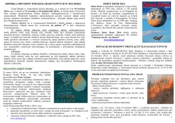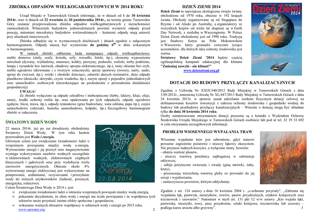 ZBIÓRKA ODPADÓW WIELKOGABARYTOWYCH W 2014 ROKU Urząd Miejski w Tarnowskich Górach informuje, Ŝe w dniach od 1 do 30 kwietnia 2014r. oraz w dniach od 22 września do 20 października 2014r., na terenie gminy Tarnowskie Góry zostanie przeprowadzona zbiórka odpadów wielkogabarytowych z nieruchomości zamieszkałych. Właściciele budynków jednorodzinnych powinni wystawić odpady przed posesję, natomiast mieszkańcy budynków wielorodzinnych – kamienic odpady mają ustawić przy altankach śmieciowych. Zbiórka odbędzie się w wyznaczonych dzielnicach i dniach zgodnie z załączonym harmonogramem. Odpady muszą być wystawione do godziny 600 w dniu wskazanym w harmonogramie. W ramach zbiórki odbierane będą następujące odpady wielkogabarytowe: meble domowe (stoły, szafy, krzesła, sofy, wersalki, fotele, itp.), elementy wyposaŜenia mieszkań (dywany, wykładziny, materace, kołdry, pierzyny, poduszki, walizki, torby podróŜne, lampy i Ŝyrandole bez Ŝarówek, obudowy sprzętu elektronicznego, itp.), ramy okienne bez szyb, meble ogrodowe (drewniane i z tworzyw sztucznych), sprzęt sportowy (rowery, narty, sanki, sprzęt do ćwiczeń, itp.), wózki i chodziki dziecięce, zabawki duŜych rozmiarów, duŜe odpady plastikowe (doniczki, skrzynki, czyste wiaderka, itp.), zuŜyte opony z pojazdów jednośladowych oraz samochodów osobowych (niewskazujące na pochodzenie z prowadzenia działalności gospodarczej). UWAGA! Ze zbiórki wyłączone są odpady szkodliwe i niebezpieczne (farby, lakiery, kleje, oleje, smary, środki ochrony roślin itp. oraz opakowania po tych odpadach), odpady ogrodowe (gałęzie, liście, trawa, itp.), odpady remontowe (gruz budowlany, wata szklana, papa itp.), części samochodowe (zderzaki, lusterka samochodowe, kołpaki, itp.). Szczegółowy harmonogram zbiórki w załączeniu. ŚWIATOWY DZIEŃ WODY 22 marca 2014r. juŜ po raz dwudziesty obchodzimy Światowy Dzień Wody. W tym roku hasłem przewodnim jest Woda i energia. Głównym celem jest zwiększenie świadomości ludzi o wzajemnym powiązaniu między wodą a energią. Wytwarzanie energii i jej przesył oraz magazynowanie wymaga wykorzystania zasobów wodnych szczególnie w elektrowniach wodnych, elektrowniach cieplnych klasycznych i jądrowych oraz przy wydobyciu wielu surowców energetycznych. Obecnie około 8% wytworzonej energii elektrycznej jest wykorzystane na pompowanie, uzdatnianie, oczyszczanie i przesyłanie wody do róŜnych uŜytkowników (ludność, przemysł, energetyka, rolnictwo). Celem Światowego Dnia Wody w 2014 r. jest: • zwiększenie świadomości ludzi o istnieniu wzajemnych powiązań miedzy wodą energią, • pokazanie decydentom, Ŝe sfera wody i energii ma ścisłe powiązania i Ŝe współpraca tych sektorów moŜe przynieść istotne efekty społeczne i gospodarcze, • wskazanie waŜnych obszarów współpracy w sektorach wody i energii po 2015 roku. www.unwater.org 2 DZIEŃ ZIEMI 2014 Dzień Ziemi to największe ekologiczne święto świata, obchodzone od 1970 roku, obecnie w 192 krajach świata. Obchody organizowane są od Singapuru do Rzymu i od Alaski po Australię, a organizatorzy ze wszystkich krajów od wielu lat skupieni są w Earth Day Network, z siedzibą w Waszyngtonie. W Polsce Dzień Ziemi obchodzony jest od 1990 roku. Tradycją jest finałowy festyn na Polu Mokotowskim w Warszawie, który gromadzi corocznie tysiące uczestników, dla których idea ochrony środowiska jest waŜna. Światowy Dzień Ziemi '2014 będzie częścią ogólnopolskiej kampanii edukacyjnej dla klimatu "Zmieniaj nawyki - nie klimat!" www.dzienziemi.org.pl DOTACJE DO BUDOWY PRZYŁĄCZY KANALIZACYJNYCH Zgodnie z Uchwałą Nr XXIX/340/2012 Rady Miejskiej w Tarnowskich Górach z dnia 5.09.2012r., zmienioną Uchwałą Nr XL/447/2013 Rady Miejskiej w Tarnowskich Górach z dnia 24 kwietnia 2013r. w sprawie zasad udzielania osobom fizycznym dotacji celowej na dofinansowanie kosztów inwestycji z zakresu ochrony środowiska i gospodarki wodnej do budowy lub przebudowy przyłączy kanalizacyjnych – Wnioski o dotację mogą być składane tylko do dnia 30 kwietnia 2014 roku. Osoby zainteresowane otrzymaniem dotacji proszone są o kontakt z Wydziałem Ochrony Środowiska Urzędu Miejskiego w Tarnowskich Górach osobiście lub pod nr tel. 32 39 33 692 w celu otrzymania szczegółowych informacji. PROBLEM WIOSENNEGO WYPALANIA TRAW Wiosenne wypalanie traw jest zabronione, gdyŜ stanowi powaŜne zagroŜenie poŜarowe i niszczy łąkowy ekosystem. Nie przynosi Ŝadnych korzyści, a wyłącznie straty, bowiem: - obniŜa wartość plonów, - niszczy warstwę próchnicy najbogatszą w substancje odŜywcze, - zabija poŜyteczne zwierzęta i owady (giną mrówki, Ŝaby, krety), - przesuszają wierzchnią warstwę gleby co prowadzi do jej erozji i wyjaławiania, - zanieczyszcza powietrze, którym oddychamy. Zgodnie z art. 124 ustawy z dnia 16 kwietnia 2004 r. „o ochronie przyrody", ,,Zabrania się wypalania łąk, pastwisk, nieuŜytków, rowów, pasów przydroŜnych, szlaków kolejowych oraz trzcinowisk i szuwarów." Natomiast w myśl art. 131 pkt 12 w/w ustawy „Kto wypala łąki, pastwiska, nieuŜytki, rowy, pasy przydroŜne, szlaki kolejowe, trzcinowiska lub szuwary – podlega karze aresztu albo grzywny”. 3 EKO RADY - - - - - UŜywaj dwóch stron kartki papieru do pisania lub rysowania. W ten sposób chronisz drzewa (z których robiony jest papier) przed wycinaniem i wytwarzasz mniej śmieci! Gaś światło kiedy wychodzisz z pokoju, wyłączaj telewizor, radio, komputer, gdy juŜ nie będziesz z nich korzystał. W ten sposób oszczędzasz energię! Zakręcaj wodę w kranie kiedy myjesz zęby. Bierz raczej krótki prysznic niŜ kąpiel. Dokręcaj krany. W ten sposób oszczędzasz wodę! Zwracaj uwagę innym gdy śmiecą. Sprzątaj po swoim psie gdy wychodzisz z nim na spacer. W ten sposób dbasz o czystość swojego otoczenia! Zacznij segregować odpady w domu. Zaproponuj swojemu nauczyci