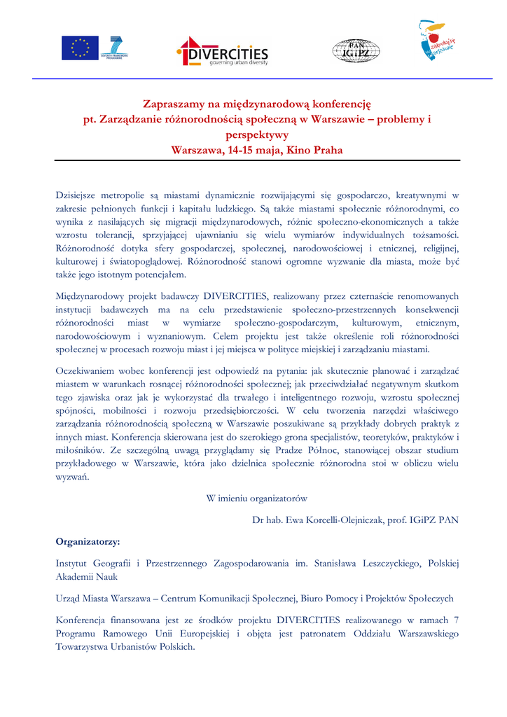 Zapraszamy na międzynarodową konferencję pt. Zarządzanie różnorodnością społeczną w Warszawie – problemy i perspektywy Warszawa, 14-15 maja, Kino Praha Dzisiejsze metropolie są miastami dynamicznie rozwijającymi się gospodarczo, kreatywnymi w zakresie pełnionych funkcji i kapitału ludzkiego. Są także miastami społecznie różnorodnymi, co wynika z nasilających się migracji międzynarodowych, różnic społeczno-ekonomicznych a także wzrostu tolerancji, sprzyjającej ujawnianiu się wielu wymiarów indywidualnych tożsamości. Różnorodność dotyka sfery gospodarczej, społecznej, narodowościowej i etnicznej, religijnej, kulturowej i światopoglądowej. Różnorodność stanowi ogromne wyzwanie dla miasta, może być także jego istotnym potencjałem. Międzynarodowy projekt badawczy DIVERCITIES, realizowany przez czternaście renomowanych instytucji badawczych ma na celu przedstawienie społeczno-przestrzennych konsekwencji różnorodności miast w wymiarze społeczno-gospodarczym, kulturowym, etnicznym, narodowościowym i wyznaniowym. Celem projektu jest także określenie roli różnorodności społecznej w procesach rozwoju miast i jej miejsca w polityce miejskiej i zarządzaniu miastami. Oczekiwaniem wobec konferencji jest odpowiedź na pytania: jak skutecznie planować i zarządzać miastem w warunkach rosnącej różnorodności społecznej; jak przeciwdziałać negatywnym skutkom tego zjawiska oraz jak je wykorzystać dla trwałego i inteligentnego rozwoju, wzrostu społecznej spójności, mobilności i rozwoju przedsiębiorczości. W celu tworzenia narzędzi właściwego zarządzania różnorodnością społeczną w Warszawie poszukiwane są przykłady dobrych praktyk z innych miast. Konferencja skierowana jest do szerokiego grona specjalistów, teoretyków, praktyków i miłośników. Ze szczególną uwagą przyglądamy się Pradze Północ, stanowiącej obszar studium przykładowego w Warszawie, która jako dzielnica społecznie różnorodna stoi w obliczu wielu wyzwań. W imieniu organizatorów Dr hab. Ewa Korcelli-Olejniczak, prof. IGiPZ PAN Organizatorzy: Instytut Geografii i Przestrzennego Zagospodarowania im. Stanisława Leszczyckiego, Polskiej Akademii Nauk Urząd Miasta Warszawa – Centrum Komunikacji Społecznej, Biuro Pomocy i Projektów Społeczych Konferencja finansowana jest ze środków projektu DIVERCITIES realizowanego w ramach 7 Programu Ramowego Unii Europejskiej i objęta jest patronatem Oddziału Warszawskiego Towarzystwa Urbanistów Polskich. Program konferencji Dzień 1 Recepcja 8:30 – 9:00 Sesja 1: Różnorodność społeczna w mieście – zjawisko i sposoby zarządzania Ewa Korcelli-Olejniczak - Przywitanie Gości 9:00-9:20 Ewa Korcelli-Olejniczak, IGiPZ PAN: Różnorodność społeczna – wyzwanie dla miasta. Ważkość projektu DIVERCITIES 9:20-9:40 Grzegorz Węcławowicz, IGiPZ PAN: Mechanizmy kształtowania się zróżnicowań i różnorodności w przestrzeni miast polskich 9:40-10:00 Magdalena Zagrzejewska-Fiedorowicz, Ministerstwo Infrastruktury i Rozwoju: Zarządzanie różnorodnością jako element Krajowej Polityki Miejskiej 10:20-10:40 Przerwa na kawę Sesja 2: Warszawa jako miasto hiper-różnorodne? Moderator: Mirosław Grochowski 10:40-11:10 Referat przewodni (keynote): Allan Cochrane, The Open University: Every day matters: rethinking public policy for a diverse society 11:00-11:30 Tomasz Pactwa, Biuro Pomocy i Projektów Społecznych UM Warszawy: Różnorodność a polityka społeczna – programy, działania, doświadczenia 11:30-11:50 Karolina Malczyk, Centrum Komunikacji Społecznej UM Warszawy: Polityka wobec różnorodności jako składnik polityki miasta Warszawy 11:50-12:10 Krzysztof Herbst, Marcin Świetlik, Towarzystwo Urbanistów Polskich: Planowanie przestrzenne a procesy wyrównywania szans społecznych w mieście 12:10-12:30 Ewa Leśnowolska, Forum Odpowiedzialnego Biznesu: Zarządzanie różnorodnością obszarem społecznej odpowiedzialności biznesu 12:30-13:00 Podsumowanie i dyskusja 13:00-14:00 Lunch Sesja 3: Różnorodność jako potencjał i zagrożenie Moderator: Ewa Korcelli-Olejniczak 14:20-14:50 Referat przewodni (keynote): Ronald van Kempen, Utrecht University: Living in Deprived, Diverse and Dynamic Urban Neighbourhoods: A Problem? 14:50-15:10 Christine Lelevrier, Paris School of Urban planning, University Paris-Est: How to govern diversity through housing policies? 15:10-15:30 14: Walter Schenkel: Urban Diversity in Zurich – Governing local integration in a federal state 15:30-15:45 Przerwa kawowa Sesja 3: ciąg dalszy 15:45-16:05 Anouk Tersteeg, Ronald van Kempen, Gideon Bolt, Utrecht University: Governing urban diversity: lessons from urban policy and local governance arrangements in Rotterdam 16:05-16:25 Mike Raco, Bartlett School of Planning, University College London: Social planning for hyper-diversity in a global city: The politics of diversity in London 16:25-16:45 Annegret Haase, Katharina Kullmann, Katrin Grossmann, Maria Budnik and Christoph Hedtke, Helmholtz Centre for Environmental Research – UFZ, Governance arrangements targeting diversity in Leipzig- structural conditions of work and institutional backgrounds 16:45-17.05 Özge Yersen, Nazda Güngőrdu, Ismail Demirdaĝ, Middle-East Technical University: Rethinking the impacts of neo-liberal urban policies and practices on diverse neighborhoods: the case of Tarlabaşi, İstanbul Dyskusja 17:30-19:30 Wycieczka – zwiedzanie obszaru badawczego projektu DIVERCITIES 20:00 Kolacja w Centrum Wielokulturowym – Praga Północ Dzień 2 Sesja 1: Lokalne zarządzanie różnorodnością społeczną. Moderator: Karolina Malczyk 9:00-9:20 Referat przewodni (keynote): Michał Olszewski, Wice-Prezydent Miasta Stołecznego Warszawa: Społeczna rewitalizacja – efektywność, szanse, zagrożenia 9:20-9:40 Julitta Grocholska, Paulina Sikorska, Towarzystwo Urbanistów Polskich: Programy rewitalizacji na Pradze – ocena i perspektyw