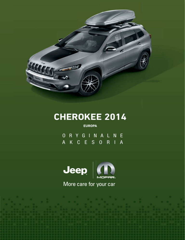 CHEROKEE 2014 EUROPA O R Y G I N A L N E A K C E S O R I A PERSONALIZACJA FELGA ALUMINIOWA 17” 17” ALLOY WHEEL W kolorze ciemnoszarym z polerowaną częścią przednią. Do wszystkich modeli z wyjątkiem Trailhawk. Wymiar: 17x7,0x39. Dark grey with polished face with Jeep center cap. For all models except Trailhawk. Available soon. Nr kat. K82213874 * FELGA ALUMINIOWA 18” * 18” ALLOY WHEEL Lakierowana na czarno z kapslem piasty z logo Jeep. Do wszystkich modeli z wyjątkiem Trailhawk. Wymiar: 18x7,0x41. Painted hyper black with Jeep center cap. For all models except Trailhawk. Available soon. Nr kat. K82213894AB NAKRĘTKI ZAWORÓW OPON TIRE VALVE STEM CAPS Satynowany chrom z logo Jeep. 4 sztuki w zestawie. In satin chrome with Jeep logo. Set of 4. Nr kat. K82213628 KAPSLE PIAST KÓŁ WHEEL CENTER CAPS FELGA ALUMINIOWA 17” 17” ALLOY WHEEL W kolorze czarnym z polerowaną częścią przednią, z kapslem piasty z logo Jeep. Do wszystkich modeli z wyjątkiem Trailhawk. Wymiar: 17x7,0x39. Black with polished face with Jeep center cap. For all models except Trailhawk. Available soon. Zestaw 4 kapsli z logo Mopar. Pasują do kół z otworem środkowym o średnicy 63 mm. Set of 4 with Mopar logo. Fits wheels with 63 mm center cap opening. Nr kat. K82212508 Nr kat. K82213873 ŚRUBY ZABEZPIECZAJĄCE WHEEL LOCKS Do stosowania wyłącznie z felgami aluminiowymi. Każdy zestaw obejmuje cztery chromowane śruby zabezpieczające i jeden specjalny klucz Mopar. Zestaw ten umożliwia zabezpieczenie kół i opon przed kradzieżą bez konieczności stosowania urządzeń na kole. For use with Alloy wheels only, bolt-type. Each wheel lock kit includes four chrome-plated locking bolts, and one exclusive Mopar key. Wheel Lock kits help protect against wheel and tire theft without affecting wheel. Nr kat. K82212978AB 2 NAKLEJKA NA POKRYWĘ KOMORY SILNIKA W KOLORZE CZARNYM MATOWYM HOOD DECAL IN MATTE BLACK FINISH Nr kat. K82213775 KOREK WLEWU PALIWA Z ZAMKIEM LOCKING GAS CAP Zestaw obejmuje czarny zamykany korek wlewu paliwa, zakręcany o jedną czwartą obrotu, dwa kluczyki. Wyłącznie do silników benzynowych. Kit includes a black quick on/off, quarter-turn, locking gas cap and two keys. Petrol engines only. Nr kat. K05278655AB * Brak zdjęcia w katalogu * Picture not present in the catalogue 3 PERSONALIZACJA CHROMOWANE OBUDOWY LUSTEREK CHROME MIRROR COVERS Górna część obudowy lusterka pasuje zarówno do lusterek z wbudowanym kierunkowskazem, jak i do tych bez niego. 2 sztuki w zestawie. Upper half of mirror housing fits with and without supplemental signals. Set of 2. Nr kat. K82213890 CHROMOWANE NAKŁADKI NA KLAMKI DRZWI CHROME DOOR HANDLE COVERS Chromowane nakładki na klamki drzwi nie zakładane w samochodach z opcją bezkluczykowego systemu zamykania ze względu na czujniki. 4 sztuki w zestawie. Kody sprzedaży: • Samochód nie może mieć opcji GXD i GX4 • GXD (system dostępu bezkluczykowego) • GX4 (system Passive Entry/Keyless Go) Set of 4. Nr kat. K82213129AB 4 CHROMOWANA APLIKACJA NA SŁUPEK B CHROME B-PILLAR APPLIQUE 6 sztuk w zestawie. Set of 6. Nr kat. K82213865 DOLNA OSŁONA ZBIORNIKA PALIWA FUEL TANK SKID PLATE 2 sztuki na lewą i prawą stronę. Nie dotyczy wersji z silnikiem Diesla. 2 pieces left and right. Not for Diesel version. Nr kat. K82214106 * DOLNA OSŁONA MISKI OLEJOWEJ SILNIKA * ENGINE OIL PAN SKID PLATE Nie dotyczy wersji z silnikiem Diesla. Not for Diesel version. Nr kat. K82214108 * DOLNA OSŁONA MISKI OLEJOWEJ SILNIKA * ENGINE OIL PAN SKID PLATE 2 sztuki na lewą i prawą stronę. Dostępne wkrótce. Underbody, 2 pieces left and right. Available soon. Nr kat. K82214107 * DOLNA OSŁONA UKŁADU KIEROWNICZEGO I PRZEDNIEGO ZAWIESZENIA * POWER STEERING AND FRONT SUSPENSION SKID PLATE Nr kat. K82214109 * Brak zdjęcia w katalogu * Picture not present in the catalogue 5 PERSONALIZACJA NAKŁADKA PROGOWA DOOR SILL GUARD Wykończenie szczotkowane z logo Cherokee. 2 sztuki w zestawie. Brushed finish with Cherokee logo. Set of 2. Nr kat. K82214008AB * CZARNE STALOWE LISTWY OCHRONNE LAKIEROWANE PROSZKOWO * BLACK POWDERCOAT STEEL ROCK RAILS Nr kat. K82213941 NAKŁADKI NA PEDAŁ HAMULCA I PRZYSPIESZENIA BRAKE AND ACCELERATOR PEDAL KIT Wyłącznie do samochodów z automatyczną skrzynią biegów. Dostępne wkrótce. For automatic transmission vehicles only. Available soon. Nr kat. K82214138 DODATKOWE PODŚWIETLENIE WNĘTRZA INTERIOR AMBIENT LIGHTING Delikatne podświetlenie wnętrza samochodu. Pokrętło obrotowe umożliwia wybór jednego z wielu kolorów diod podświetlających wnętrze. Podświetlana jest zarówno strona kierowcy, jak i strona pasażera. Gently illuminates the interior of the vehicle. A rotary knob allows to select one of the multi color LEDs to be used for the color of the ambient lighting. The lighting will be under both the driver and passenger side. Nr kat. K82212347 6 DYWANIKI PODŁOGOWE PREMIUM PREMIUM CARPET MATS W kolorze ciemnoszarym z logo Jeep. Zestaw 4 dywaników. Dark slate grey with Jeep logo. Set of 4. Nr kat. K82213946 * W kolorze ciemnoszarym z logo Jeep. Zestaw 4 dywaników. Tylko do samochodów z kierownicą z prawej strony. * Dark slate grey with Jeep logo. Set of 4. Right Hand Drive vehicles only. Nr kat. K82213741 DYWANIKI PODŁOGOWE PREMIUM PREMIUM CARPET MATS Czarne z logo Cherokee. Zestaw 4 dywaników. Black with Cherokee logo. Set of 4. Nr kat. K82213989 GUMOWE DYWANIKI PODŁOGOWE RUBBER FLOOR MATS Czarne z logo Jeep. Zestaw 4 dywaników. Tylko do samochodów z kierownicą z prawej strony. Black with Jeep logo. Set of 4. Right Hand Drive vehicles only. Nr kat. K82213985 * Czarne z logo Jeep. 3 dywaniki w zestawie. Dostępne wkrótce. * Black with Jeep logo. Set of 3. Available soon. Nr kat. K82214098 * Brak zdjęcia w katalogu * Picture not present in the catalogue 7 CZAS WOLNY WYKŁADZINA BAGAŻNIKA CARGO MAT Czarny dywanik typu Premium z logo Cherokee. Premium carpet, black with Cherokee logo. Nr kat. K82214007 MATA BAGAŻNIKA C