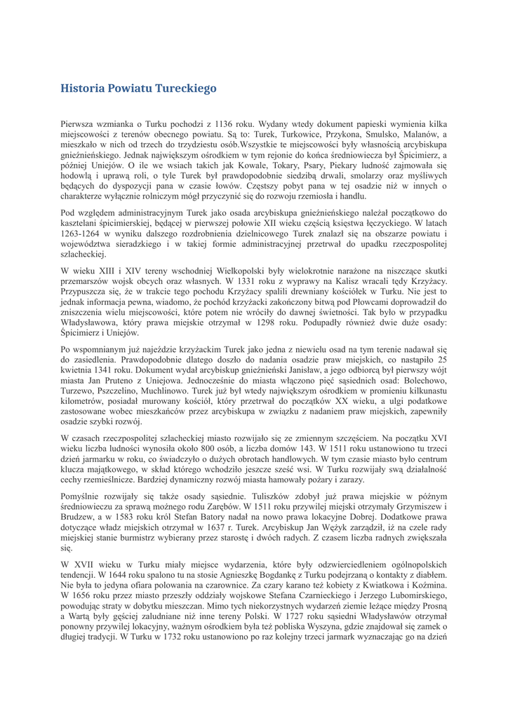 Historia Powiatu Tureckiego Pierwsza wzmianka o Turku pochodzi z 1136 roku. Wydany wtedy dokument papieski wymienia kilka miejscowości z terenów obecnego powiatu. Są to: Turek, Turkowice, Przykona, Smulsko, Malanów, a mieszkało w nich od trzech do trzydziestu osób.Wszystkie te miejscowości były własnością arcybiskupa gnieźnieńskiego. Jednak największym ośrodkiem w tym rejonie do końca średniowiecza był Śpicimierz, a później Uniejów. O ile we wsiach takich jak Kowale, Tokary, Psary, Piekary ludność zajmowała się hodowlą i uprawą roli, o tyle Turek był prawdopodobnie siedzibą drwali, smolarzy oraz myśliwych będących do dyspozycji pana w czasie łowów. Częstszy pobyt pana w tej osadzie niż w innych o charakterze wyłącznie rolniczym mógł przyczynić się do rozwoju rzemiosła i handlu. Pod względem administracyjnym Turek jako osada arcybiskupa gnieźnieńskiego należał początkowo do kasztelani śpicimierskiej, będącej w pierwszej połowie XII wieku częścią księstwa łęczyckiego. W latach 1263-1264 w wyniku dalszego rozdrobnienia dzielnicowego Turek znalazł się na obszarze powiatu i województwa sieradzkiego i w takiej formie administracyjnej przetrwał do upadku rzeczpospolitej szlacheckiej. W wieku XIII i XIV tereny wschodniej Wielkopolski były wielokrotnie narażone na niszczące skutki przemarszów wojsk obcych oraz własnych. W 1331 roku z wyprawy na Kalisz wracali tędy Krzyżacy. Przypuszcza się, że w trakcie tego pochodu Krzyżacy spalili drewniany kościółek w Turku. Nie jest to jednak informacja pewna, wiadomo, że pochód krzyżacki zakończony bitwą pod Płowcami doprowadził do zniszczenia wielu miejscowości, które potem nie wróciły do dawnej świetności. Tak było w przypadku Władysławowa, który prawa miejskie otrzymał w 1298 roku. Podupadły również dwie duże osady: Śpicimierz i Uniejów. Po wspomnianym już najeździe krzyżackim Turek jako jedna z niewielu osad na tym terenie nadawał się do zasiedlenia. Prawdopodobnie dlatego doszło do nadania osadzie praw miejskich, co nastąpiło 25 kwietnia 1341 roku. Dokument wydał arcybiskup gnieźnieński Janisław, a jego odbiorcą był pierwszy wójt miasta Jan Pruteno z Uniejowa. Jednocześnie do miasta włączono pięć sąsiednich osad: Bolechowo, Turzewo, Pszczelino, Muchlinowo. Turek już był wtedy największym ośrodkiem w promieniu kilkunastu kilometrów, posiadał murowany kościół, który przetrwał do początków XX wieku, a ulgi podatkowe zastosowane wobec mieszkańców przez arcybiskupa w związku z nadaniem praw miejskich, zapewniły osadzie szybki rozwój. W czasach rzeczpospolitej szlacheckiej miasto rozwijało się ze zmiennym szczęściem. Na początku XVI wieku liczba ludności wynosiła około 800 osób, a liczba domów 143. W 1511 roku ustanowiono tu trzeci dzień jarmarku w roku, co świadczyło o dużych obrotach handlowych. W tym czasie miasto było centrum klucza majątkowego, w skład którego wchodziło jeszcze sześć wsi. W Turku rozwijały swą działalność cechy rzemieślnicze. Bardziej dynamiczny rozwój miasta hamowały pożary i zarazy. Pomyślnie rozwijały się także osady sąsiednie. Tuliszków zdobył już prawa miejskie w późnym średniowieczu za sprawą możnego rodu Zarębów. W 1511 roku przywilej miejski otrzymały Grzymiszew i Brudzew, a w 1583 roku król Stefan Batory nadał na nowo prawa lokacyjne Dobrej. Dodatkowe prawa dotyczące władz miejskich otrzymał w 1637 r. Turek. Arcybiskup Jan Wężyk zarządził, iż na czele rady miejskiej stanie burmistrz wybierany przez starostę i dwóch radych. Z czasem liczba radnych zwiększała się. W XVII wieku w Turku miały miejsce wydarzenia, które były odzwierciedleniem ogólnopolskich tendencji. W 1644 roku spalono tu na stosie Agnieszkę Bogdankę z Turku podejrzaną o kontakty z diabłem. Nie była to jedyna ofiara polowania na czarownice. Za czary karano też kobiety z Kwiatkowa i Koźmina. W 1656 roku przez miasto przeszły oddziały wojskowe Stefana Czarnieckiego i Jerzego Lubomirskiego, powodując straty w dobytku mieszczan. Mimo tych niekorzystnych wydarzeń ziemie leżące między Prosną a Wartą były gęściej zaludniane niż inne tereny Polski. W 1727 roku sąsiedni Władysławów otrzymał ponowny przywilej lokacyjny, ważnym ośrodkiem była też pobliska Wyszyna, gdzie znajdował się zamek o długiej tradycji. W Turku w 1732 roku ustanowiono po raz kolejny trzeci jarmark wyznaczając go na dzień św. Agnieszki. W tym czasie w skład klucza turkowskiego wchodziły dwa folwarki: w Turku i Turkowicach oraz pięć wsi puszczonych w dzierżawę: Cisew, Grąbków, Kowale, Malanów, Szadów. Ostatnie dziesięciolecia XVIII wieku to okres działań na rzecz utrzymania niepodległości Polski. Jedną z takich akcji była konfederacja barska, której żołnierze w walce z Rosjanami dotarli w okolice Turku. W styczniu 1770 roku pod Dobrą rozegrała się jedna z ostatnich bitew tej konfederacji. Z kolei w insurekcji kościuszkowskiej wzięli udział ochotnicy z Turku, Tuliszkowa, Dobrej i Władysławowa, którego właściciele, Gurowscy należeli do aktywnych stronników Kościuszki. Rok 1793 przyniósł II rozbiór Polski. Turek znalazł się w granicach Prus, trzy lata później dobra arcybiskupa gnieźnieńskiego zostały skonfiskowane przez państwo pruskie, wtedy to Turek dostał się pod administrację urzędników pruskich w Kaliszu. Miasto nie ucierpiało specjalnie z powodu pruskich rządów. Wzmocnienie związków z Wielkopolską wpłynęło nawet korzystnie na rozwój tych terenów. Duże znaczenie zyskała rzeka Warta, po której płynęły barki do Poznania i dalej do Odry. Rozwijał się handel i rzemiosło. Ale spokój trwał krótko, gdyż Europa została ogarnięta wojnami napoleońskimi. W ich wyniku w 1807 roku powstało Księstwa Warszawskie, w skład którego weszła także Wielkopolska z Turkiem. Dla miasta czas wojen zaznaczył się