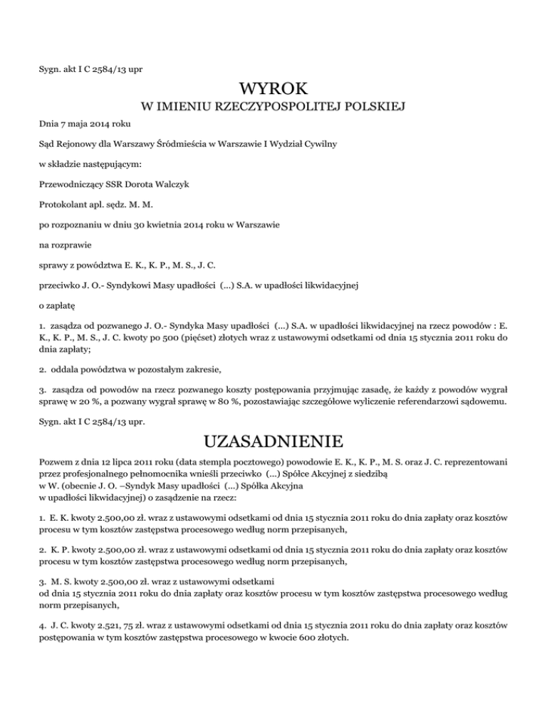 Sygn. akt I C 2584/13 upr WYROK W IMIENIU RZECZYPOSPOLITEJ POLSKIEJ Dnia 7 maja 2014 roku Sąd Rejonowy dla Warszawy Śródmieścia w Warszawie I Wydział Cywilny w składzie następującym: Przewodniczący SSR Dorota Walczyk Protokolant apl. sędz. M. M. po rozpoznaniu w dniu 30 kwietnia 2014 roku w Warszawie na rozprawie sprawy z powództwa E. K., K. P., M. S., J. C. przeciwko J. O.- Syndykowi Masy upadłości (...) S.A. w upadłości likwidacyjnej o zapłatę 1. zasądza od pozwanego J. O.- Syndyka Masy upadłości (...) S.A. w upadłości likwidacyjnej na rzecz powodów : E. K., K. P., M. S., J. C. kwoty po 500 (pięćset) złotych wraz z ustawowymi odsetkami od dnia 15 stycznia 2011 roku do dnia zapłaty; 2. oddala powództwa w pozostałym zakresie, 3. zasądza od powodów na rzecz pozwanego koszty postępowania przyjmując zasadę, że każdy z powodów wygrał sprawę w 20 %, a pozwany wygrał sprawę w 80 %, pozostawiając szczegółowe wyliczenie referendarzowi sądowemu. Sygn. akt I C 2584/13 upr. UZASADNIENIE Pozwem z dnia 12 lipca 2011 roku (data stempla pocztowego) powodowie E. K., K. P., M. S. oraz J. C. reprezentowani przez profesjonalnego pełnomocnika wnieśli przeciwko (...) Spółce Akcyjnej z siedzibą w W. (obecnie J. O. –Syndyk Masy upadłości (...) Spółka Akcyjna w upadłości likwidacyjnej) o zasądzenie na rzecz: 1. E. K. kwoty 2.500,00 zł. wraz z ustawowymi odsetkami od dnia 15 stycznia 2011 roku do dnia zapłaty oraz kosztów procesu w tym kosztów zastępstwa procesowego według norm przepisanych, 2. K. P. kwoty 2.500,00 zł. wraz z ustawowymi odsetkami od dnia 15 stycznia 2011 roku do dnia zapłaty oraz kosztów procesu w tym kosztów zastępstwa procesowego według norm przepisanych, 3. M. S. kwoty 2.500,00 zł. wraz z ustawowymi odsetkami od dnia 15 stycznia 2011 roku do dnia zapłaty oraz kosztów procesu w tym kosztów zastępstwa procesowego według norm przepisanych, 4. J. C. kwoty 2.521, 75 zł. wraz z ustawowymi odsetkami od dnia 15 stycznia 2011 roku do dnia zapłaty oraz kosztów postępowania w tym kosztów zastępstwa procesowego w kwocie 600 złotych. Jednocześnie pełnomocnik powodów wniósł o zasądzenie kosztów postępowania w tym kosztów zastępstwa procesowego według norm przepisanych. W uzasadnieniu pozwu pełnomocnik strony powodowej wskazał, że powódka E. K. oraz powodowie K. P., M. S. i J. C. zawarli z pozwanym biurem podróży umowy udziału w imprezie turystycznej w Egipcie w dniach 22.09.2010 r.- 6.10.2010 r. Zgodnie z zawartymi umowami powodowie mieli wracać do W. w dniu 6 października 2010 roku. Tymczasem powodowie w dniu 4 października 2010 roku w godzinach wieczornych dowiedzieli się, iż wyjazd ma mieć miejsce już dnia następnego- tj. 5 października 2010 roku. Ponadto lot powrotny miał być do K., a nie do W. jak wynikało z umowy. W ramach rekompensaty biuro podróży zaoferowało wypłatę w kwocie 30,00 dolarów oraz transfer na trasie K. – W.. Powodowie nie wyrazili zgody na wypłatę powyższej rekompensaty. Ze względu na zmianę docelowego miejsca powrotu na K. powodowie byli narażeni na znacznie dłuższy czas powrotu i niedogodności związane z kilkugodzinną jazdą busem do W.. Miało to znaczenie, gdyż powrót do Polski miał miejsce na początku października. Powodowie oraz osoby im towarzyszące ze względu na miejsce przylotu zmuszeni byli do podróży w odzieży nieprzystosowanej do panującej temperatury w Polsce. Ponadto z uwagi na skrócenie czasu pobytu powodowie wraz osobami im towarzyszącymi nie mieli możliwości w pełni zrealizować planów urlopowych oraz zrealizować całości programu imprezy turystycznej. (pozew wraz z załącznikami –k. 1-60) W odpowiedzi na pozew pozwana reprezentowana przez profesjonalnego pełnomocnika wniosła o oddalenie powództwa w całości jako, iż jest bezzasadne oraz zasądzenie od powodów na rzecz pozwanej kosztów postępowania w tym kosztów zastępstwa procesowego według norm przepisanych. W uzasadnieniu pełnomocnik pozwanej wskazał, że z przyczyn niezależnych od organizatora pozwana zmuszona została do zapewnienia powodom odpowiedniego świadczenia zastępczego, jakim był rejs powrotny z S. do K. dnia 5 października 2010 roku. Pozwana poinformowała powodów, że zapewni powodom transfer z K. do W. na koszt (...) S.A. oraz zaproponowała dodatkową rekompensatę w wysokości 30 dolarów za osobę, której przyjęcia powodowie odmówili. W ocenie pozwanej żądanie powodów w zakresie dochodzonego roszczenia jest rażąco wygórowane, albowiem powodowie nie wykazali powstania rzeczywistej szkody i nie uprawdopodobnili jej wysokości. (odpowiedź na pozew- k.66-74) Postanowieniem z dnia 12 czerwca 2012 roku Sąd zawiesił postępowanie na podstawie art. 174 § 1 pkt 4 k.p.c. (postanowienie-k.181) Postanowieniem z dnia 3 października 2013 roku Sąd na podstawie art. 180 § 1 pkt 5 k.p.c. podjął zawieszone postępowanie z udziałem syndyka masy upadłości J. O.. (postanowienie-k.232) Pismem procesowym z dnia 5 listopada 2013 roku syndyk masy upadłości (...) Spółki Akcyjnej w upadłości likwidacyjnej z siedzibą w W. reprezentowany przez profesjonalnego pełnomocnika wniósł o oddalenie powództwa w całości oraz o zasądzenie od powodów na rzecz pozwanego kosztów procesu, w tym kosztów zastępstwa procesowego według norm przepisanych. (pismo procesowe-k.247) Sąd ustalił następujący stan faktyczny: J. C.w dniu 6 września 2010 roku zawarł z (...) S.A.z siedzibą w W.umowę udziału w imprezie turystycznej nr (...), której przedmiotem była impreza turystyczna E. S.w terminie od dnia 22 września 2010 roku do dnia 6 października 2010 roku. Uczestnikami wycieczki turystycznej mieli być J. C.oraz A. P.. Tytułem kosztów imprezy J. C.uiścił kwotę w wysokości 5.150,00 złotych. (umowa- k.21, dowód wpłaty -k.22) E. K.w dniu 9 września 2010 roku zawarła z (...) S.A.z siedzibą w W.umowę o świadczenie usł