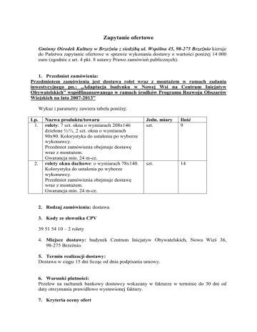 Zapytanie ofertowe Gminny Ośrodek Kultury w Brzeźniu z siedzibą ul. Wspólna 45, 98-275 Brzeźnio kieruje do Państwa zapytanie ofertowe w sprawie wykonania dostawy o wartości poniŜej 14 000 euro (zgodnie z art. 4 pkt. 8 ustawy Prawo zamówień publicznych). 1. Przedmiot zamówienia: Przedmiotem zamówienia jest dostawa rolet wraz z montaŜem w ramach zadania inwestycyjnego pn.: „Adaptacja budynku w Nowej Wsi na Centrum Inicjatyw Obywatelskich” współfinansowanego w ramach środków Programu Rozwoju Obszarów Wiejskich na lata 2007-2013” Wykaz i parametry zawiera tabela poniŜej: Lp. 1. 2. Nazwa produktu/towaru rolety: 7 szt. okna o wymiarach 208x146 dzielone ⅔/⅓, 2 szt. okna o wymiarach 90x90. Kolorystyka do ustalenia po wyborze wykonawcy. Przedmiot zamówienia obejmuje dostawę wraz z montaŜem. Gwarancja min. 24 m-ce. rolety okna dachowe: o wymiarach 78x140. Kolorystyka do ustalenia po wyborze wykonawcy. Przedmiot zamówienia obejmuje dostawę wraz z montaŜem. Gwarancja min. 24 m-ce. Jedn. miary szt. Ilość 9 szt. 14 2. Rodzaj zamówienia: dostawa 3. Kody ze słownika CPV 39 51 54 10 – 2 rolety 4. Miejsce dostawy: budynek Centrum Inicjatyw Obywatelskich, Nowa Wieś 36, 98-275 Brzeźnio. 5. Termin realizacji dostawy: Dostawa w ciągu 15 dni licząc od dnia podpisania umowy. 6. Warunki płatności: Przelew na rachunek bankowy dostawcy wskazany w fakturze w terminie do 30 dni od daty otrzymania prawidłowo wystawionej faktury. 7. Kryteria oceny ofert Przy wyborze najkorzystniejszej oferty Zamawiający będzie się kierował kryterium: Cena – 100% 8. Informacje dodatkowe: 1) Na w/w przedmiot zamówienia udzielamy gwarancji ………………………………… 2) Dostawca w formularzu ofertowym określi cenę jednostkową brutto i cenę brutto ogółem za całość zamówienia. 3) Zamawiający wybierze ofertę cenową dostawcy odpowiadającą wszystkim wymogom postawionym przez niego dla prawidłowej realizacji zamówienia i o najniŜszej cenie brutto za całość dostawy. 4) W sprawach dotyczących zapytania ofertowego informacji udziela GraŜyna Dziedzic w dni robocze od poniedziałku do piątku w godz. 7:30 – 15.30, tel. (43) 820-31-87, Pytania moŜna kierować równieŜ pisemnie na adres: Gminny Ośrodek Kultury w Brzeźniu, ul. Wspólna 45, 98-275 Brzeźnio lub e-mailem: [email protected] Ofertę cenową (formularz ofertowy) naleŜy złoŜyć w Sekretariacie Urzędu Gminy w Brzeźniu, ul. Wspólna 44, 98-275 Brzeźnio, I piętro, pok. 17 w formie pisemnej, w zamkniętej kopercie oznaczonej danymi dostawcy (pieczęć firmowa) oraz napisem: dostawa rolet wraz z montaŜem w ramach zadania inwestycyjnego pn.: „Adaptacja budynku w Nowej Wsi na Centrum Inicjatyw Obywatelskich” współfinansowanego w ramach środków Programu Rozwoju Obszarów Wiejskich na lata 2007-2013” 5) Termin składania ofert: do dnia 10.09.2010r. godz. 15.00 (piątek) 6) Oferta cenowa złoŜona po terminie składania ofert podanym powyŜej nie będzie brana pod uwagę przy wyborze oferty najkorzystniejszej. 7) Dostawca moŜe wprowadzić zmiany lub wycofać złoŜoną ofertę cenową przed upływem terminu składania ofert. 8) Z dostawcą, którego oferta cenowa zostanie uznana za najkorzystniejszą w terminie do 5 dni od daty powiadomienia o wyborze oferty zostanie podpisana umowa. 9) Termin związania ofertą cenową wynosi 15 dni od dnia otwarcia ofert przez Zamawiającego. 10) PowyŜsze zapytanie ofertowe wraz z formularzem ofertowym zostało zamieszczone na stronie internetowej: www.brzeznio.finn.pl 11) W sprawach związanych z zapytaniem ofertowym dopuszcza się porozumiewanie drogą: - pisemną, telefoniczną lub faxem – nr (43) 820-31-87. W przypadku korzystania z innych niŜ pisemna form porozumiewania, Strony mogą Ŝądać potwierdzenia otrzymania informacji bądź dokumentu. 12) Rozstrzygniecie postępowania i zlecenie realizacji zamówienia O wynikach postępowania jego uczestnicy zostaną poinformowani drogą faxową lub e-mailową w ciągu dwóch dni od dnia rozstrzygnięcia, następnie w ciągu 5 dni od przesłania informacji o wyborze oferty najkorzystniejszej zostanie podpisana umowa z wybranym Wykonawcom. 14) Załączniki: - formularz ofertowy Brzeźnio, dn. 03.08.2010r. …………………………………… (podpis Kierownika Zamawiającego) Załącznik nr 1 do zapytania cenowego FORMULARZ OFERTOWY dla zamówień o wartości poniŜej 14 000 euro (zgodnie z art. 4 pkt. 8 ustawy Prawo zamówień publicznych) Dane dotyczące Dostawcy : Nazwa .................................................................................................................................... Siedziba ................................................................................................................................. Nr telefonu ............................................................................................................................. Fax……………………………………………………………………………………………………. Nr NIP .................................................................................................................................... Nr REGON ............................................................................................................................. Nazwa banku i numer rachunku bankowego ……………………………………………………… ………………………………………………………………………………………………………….. e-mail ………………………………………………………………………………………………….. Dane dotyczące Zamawiającego: Gminny Ośrodek Kultury w Brzeźniu ul. Wspólna 45 98 – 275 Brzeźnio pow. sieradzki woj. łódzkie Nawiązując do zapytania cenowego o zamówienie o wartości poniŜej 14 000 euro na: dostawa rolet wraz z montaŜem w ramach zadania inwestycyjnego pn.: „Adapta
