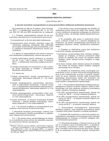 Dziennik Ustaw Nr 159 — 9355 — Poz. 954 954 ROZPORZĄDZENIE MINISTRA ZDROWIA1) z dnia 29 lipca 2011 r. w sprawie warunków wynagradzania za pracę pracowników niektórych podmiotów leczniczych Na podstawie art. 88 ust. 9 ustawy z dnia 15 kwietnia 2011 r. o działalności leczniczej (Dz. U. Nr 112, poz. 654 i Nr 149, poz. 887) zarządza się, co następuje: § 1. Przepisy rozporządzenia stosuje się do pracowników zatrudnionych w podmiotach leczniczych: 1) prowadzonych w formie jednostki budżetowej; 2) utworzonych przez ministra, centralny organ administracji rządowej, wojewodę albo jednostkę samorządu terytorialnego, jako pracodawcę, w celu udzielania świadczeń zdrowotnych swoim pracownikom. § 2. Ilekroć w rozporządzeniu jest mowa o pracowniku działalności podstawowej, rozumie się przez to: 1) osobę wykonującą zawód medyczny w rozumieniu art. 2 ust. 1 pkt 2 ustawy z dnia 15 kwietnia 2011 r. o działalności leczniczej, będącą pracownikiem; 2) innego pracownika niż wymieniony w pkt 1, którego praca pozostaje w związku z udzielaniem świadczeń zdrowotnych. § 3. Ustala się: 1) tabelę miesięcznych stawek wynagrodzenia zasadniczego, stanowiącą załącznik nr 1 do rozporządzenia; 2) tabelę zaszeregowania pracowników zatrudnionych w podmiotach leczniczych, o których mowa w § 1, z wyłączeniem pracowników stacji sanitarno-epidemiologicznych, stanowiącą załącznik nr 2 do rozporządzenia; 3) tabelę zaszeregowania pracowników stacji sanitarno-epidemiologicznych, stanowiącą załącznik nr 3 do rozporządzenia; 4) wykaz stanowisk, na których przysługuje dodatek funkcyjny, i stawek dodatku funkcyjnego, stanowiący załącznik nr 4 do rozporządzenia. § 4. 1. W ramach środków na wynagrodzenia pracodawca może tworzyć fundusz premiowy. 2. Wysokość funduszu premiowego, zadania oraz zasady premiowania określa pracodawca w zakładowym regulaminie premiowania. § 5. 1. Do okresu pracy uprawniającego do dodatku za wieloletnią pracę wlicza się wszystkie poprzednie zakończone okresy zatrudnienia. 1) Minister Zdrowia kieruje działem administracji rządowej — zdrowie, na podstawie § 1 ust. 2 rozporządzenia Prezesa Rady Ministrów z dnia 16 listopada 2007 r. w sprawie szczegółowego zakresu działania Ministra Zdrowia (Dz. U. Nr 216, poz. 1607). 2. Do okresu pracy uprawniającego do dodatku za wieloletnią pracę wlicza się także inne okresy, jeżeli z mocy odrębnych przepisów podlegają one wliczeniu do okresu pracy, od którego zależą uprawnienia pracownicze. 3. W przypadku gdy praca w podmiocie leczniczym, o którym mowa w § 1, stanowi dodatkowe zatrudnienie, do okresu dodatkowego zatrudnienia nie podlegają zaliczeniu okresy zatrudnienia podstawowego. 4. Dodatek za wieloletnią pracę jest wypłacany w terminie wypłaty wynagrodzenia: 1) począwszy od pierwszego dnia miesiąca następującego po miesiącu, w którym pracownik nabył prawo do dodatku lub prawo do wyższej stawki dodatku, jeżeli nabycie prawa nastąpiło w ciągu miesiąca; 2) za dany miesiąc, jeżeli nabycie prawa do dodatku lub prawa do wyższej stawki dodatku nastąpiło pierwszego dnia miesiąca. 5. Dodatek za wieloletnią pracę przysługuje pracownikowi za dni, za które otrzymuje wynagrodzenie, oraz za dni nieobecności w pracy z powodu niezdolności do pracy wskutek choroby bądź konieczności osobistego sprawowania opieki nad dzieckiem lub chorym członkiem rodziny, za które pracownik otrzymuje zasiłek z ubezpieczenia społecznego. § 6. 1. Pracownikowi działalności podstawowej posiadającemu stopień naukowy doktora, doktora habilitowanego lub tytuł naukowy profesora pracodawca ustala i wypłaca miesięczny dodatek: 1) do 50% wynagrodzenia zasadniczego, jednak nie mniej niż 185 zł — za tytuł naukowy profesora; 2) do 30% wynagrodzenia zasadniczego, jednak nie mniej niż 125 zł — za stopień naukowy doktora habilitowanego; 3) do 20% wynagrodzenia zasadniczego, jednak nie mniej niż 65 zł — za stopień naukowy doktora. 2. Pracownikowi posiadającemu jednocześnie określony stopień i tytuł naukowy pracodawca ustala i wypłaca tylko jeden dodatek w wyższej wysokości. 3. Dodatek jest wypłacany w terminie wypłaty wynagrodzenia, począwszy od pierwszego dnia miesiąca następującego po miesiącu, w którym nastąpiło udokumentowanie uprawnień. § 7. Wysokość dodatków, o których mowa w art. 88 ust. 3 i 4 ustawy z dnia 15 kwietnia 2011 r. o działalności leczniczej, pracodawca ustala, uwzględniając rodzaj i charakter wykonywanej przez nich pracy. Dodatki te są wypłacane w terminie wypłaty wynagrodzenia. Dziennik Ustaw Nr 159 — 9356 — § 8. 1. Pracownikom innym niż wymienieni w art. 99 ustawy z dnia 15 kwietnia 2011 r. o działalności leczniczej, wykonującym pracę w porze nocnej, pracodawca ustala i wypłaca dodatek za każdą godzinę pracy w porze nocnej w wysokości 20% stawki godzinowej wynagrodzenia zasadniczego. Dodatek ten nie może być niższy niż dodatek ustalony na podstawie art. 1518 § 1 Kodeksu pracy. 2. Godzinową stawkę wynagrodzenia zasadniczego oblicza się, dzieląc miesięczną stawkę wynagrodzenia zasadniczego, wynikającą z osobistego zaszeregowania pracownika, przez liczbę godzin pracy przypadających do przepracowania w danym miesiącu. § 9. 1. Kierowcy samochodu osobowego może być ustalone i wypłacane, za jego zgodą, wynagrodzenie ryczałtowe obejmujące poszczególne składniki wynagrodzenia, w szczególności wynagrodzenie zasadnicze, dodatek za pracę w godzinach nadliczbowych oraz dodatek za pracę w porze nocnej, uwzględniające liczbę godzin przypadających do przepracowania w okresie jednego miesiąca, w przypadkach, gdy faktyczny czas pracy kierowcy w poszczególnych miesiącach nie ulega wahaniom i odpowiada liczbie godzin przyjętych do obliczenia wynagrodzenia. 2. Kierowcy, któremu powierzono dodatkowe czynności wykraczające poza zakres jego podstawowych obowiązków, p