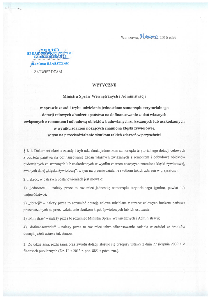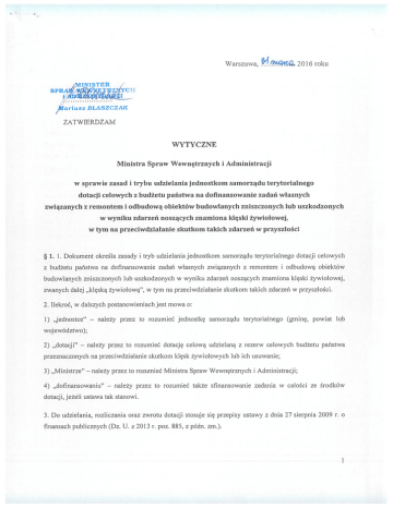 Warszawa, 2016 roku Mariusz BLĄSZCZAT ZATWIERDZAM WYTYCZNE Ministra Spraw Wewnętrznych i Administracji w sprawie zasad i trybu udzielania jednostkom samorządu terytorialnego dotacji celowych z budżetu państwa na dofinansowanie zadań własnych związanych z remontem i odbudową obiektów budowlanych zniszczonych lub uszkodzonych w wyniku zdarzeń noszących znamiona klęski żywiołowej, w tym na przeciwdziałanie skutkom takich zdarzeń w przyszłości 1. 1. Dokument określa zasady i tryb udzielania jednostkom samorządu terytorialnego dotacji celowych z budżetu państwa na dofinansowanie zadań własnych związanych z remontem i odbudową obiektów budowlanych zniszczonych lub uszkodzonych w wyniku zdarzeń noszących znamiona klęski żywiołowej, zwanych dalej „klęską żywiołową”, w tym na przeciwdziałanie skutkom takich zdarzeń w przyszłości. 2. Hekroć, w dalszych postanowieniach jest mowa 1) „jednostce” — 0: należy przez to rozumieć jednostkę samorządu terytorialnego (gminę, powiat lub województwo); 2) „dotacji” — należy przez to rozumieć dotację celową udzielaną z rezerw celowych budżetu państwa przeznaczonych na przeciwdziałanie skutkom klęsk żywiołowych lub ich usuwanie; 3) „Ministrze” — należy przez to rozumieć Ministra Spraw Wewnętrznych i Administracji; 4) „dofinansowaniu” — należy przez to rozumieć także sfinansowanie zadania w całości ze środków dotacji, jeżeli ustawa tak stanowi. 3. Do udzielania, rozliczania oraz zwrotu dotacji stosuje się przepisy ustawy z dnia 27 sierpnia 2009 r. o finansach publicznych (Dz. U. z 2013 r. poz. 885, z późn. zm.). 2. 1. Jednostka może otrzymać dotację na dofinansowanie zadań własnych w zakresie, o którym mowa w 1 ust. 1, jeżeli straty wywołane klęską żywiołową własnych jednostki za rok bezpośrednio są nie mniejsze niż 5% wykonanych dochodów poprzedzający rok wystąpienia klęski żywiołowej, z zastrzeżeniem ust. 2 2. W przypadku braku, na dzień składania wniosku, uchwały w sprawie absolutorium, o którym mowa w art. 271 ustawy z dnia 27 sierpnia 2009 r. o finansach publicznych, jednostka może otrzymać dotację, jeżeli straty wywołane klęską żywiołową są nie mniejsze niż 5% planowanych dochodów własnych jednostki na rok bezpośrednio poprzedzający rok wystąpienia klęski żywiołowej. 3. W przypadku, gdy na obszarze jednostki, w trakcie jednego roku budżetowego, wystąpiła więcej niż jedna klęska żywiołowa, straty spowodowane tymi zdarzeniami mogą zostać zsumowane w celu spełnienia warunku, o którym mowa w ust. 1 albo ust. 2. 4. Wysokość dotacji nie może przekroczyć 80 % kosztów realizacji zadania, chyba że ustawa stanowi inaczej. 5. Dotacja nie będzie udzielona, jeżeli wartość zadania podlegającego dofinansowaniu jest mniejsza niż 50 tysięcy złotych. Wartość dotacji nie może być niższa niż 40 tysięcy złotych. 6. Zadania nie mogą być łączone w celu obejścia postanowień, o których mowa w ust. 5, chyba że zadania są ze sobą funkcjonalnie związane - w szczególności dotyczą wykonania obiektu drogowego wraz z innym obiektem liniowym w ciągu tej drogi (np. siecią wodociągową) lub wykonania obiektu drogowego wraz z obiektem mostowym w ciągu drogi. 7. Dotacja może być przeznaczona jedynie na pokrycie kosztów materiałów i urządzeń oraz kosztów robót budowlano - montażowo - instalacyjnych. Koszty wynikające z technologii robót, jak tymczasowe drogi, oznakowanie objazdów, wycinka drzew i krzewów oraz koszty znaków drogowych mogą być pokrywane ze środków stanowiących udział własny jednostki, o którym mowa w 4 ust. 2 ramowego wzoru umowy o dotację, stanowiącego załącznik nr 2 do niniejszego dokumentu. 8. W przypadku dotacji udzielanych na podstawie art. 35 ustawy z dnia 16 września 2011 r. o szczególnych rozwiązaniach związanych z usuwaniem skutków powodzi (Dz. U. z 2015 r. poz. 1401, z późn. zm.) oraz dotacji udzielanych na podstawie art. 35 ust. 3 ustawy z dnia 24 czerwca 2010 r. o szczególnych rozwiązaniach związanych z usuwaniem skutków powodzi z 2010 r. (Dz. U. z 2010 r. Nr 123, poz. 835, z późn. zm.), z budżetu państwa mogą być finansowane wszystkie koszty określone w ust. 7, w tym również koszty przewidziane wcześniej do pokrycia ze środków stanowiących udział własny jednostki. 2 9. Do całkowitych kosztów zadania nie zalicza się kosztów wykonania dokumentacji projektowokosztorysowej, wynagrodzenia dla osób sprawujących nadzór inwestorski lub autorski i kierowników robót, organizacji i ochrony placów budowy i powykonawczych prac geodezyjnych oraz innych wydatków niemających bezpośredniego związku z usuwaniem skutków klęsk żywiołowych w ramach zadania będącego przedmiotem dofinansowania. 3. 1. Warunkiem uzyskania dotacji jest zgłoszenie potrzeb przez jednostkę do właściwego terytorialnie wojewody. 2. Zgłoszenie potrzeb sporządzane jest na podstawie ustaleń komisji do spraw szacowania strat powołanej przez jednostkę i powinno obejmować w szczególności: 1) oznaczenie jednostki, w tym dane adresowe; 2) rodzaj klęski żywiołowej oraz datę jej wystąpienia; 3) opis zadania przedstawianego do dofinansowania, zgodny z protokołem szkód sporządzonym przez komisję; 4) szacunkowy koszt realizacji zadania; 5) wnioskowaną kwotę dotacji. 4. 1. Wojewoda przesyła Ministrowi zbiorcze zestawienie zgłaszanych potrzeb z terenu województwa zawierające w szczególności dane, o których mowa w 3 ust. 2, wraz z propozycjami kwot dofinansowania określonymi na podstawie ustaleń komisji wojewódzkiej, o której mowa w 5. 2. Propozycje dofinansowania zadań, o których mowa w ust. 1, powinny być usystematyzowane, zaczynając od zadań najpilniejszych. 5. 1. W celu przygotowania propozycji dofinansowania, o których mowa w 4 ust. 1, wojewoda powołuje wojewódzką komisję do spraw weryfikacji strat określonych p