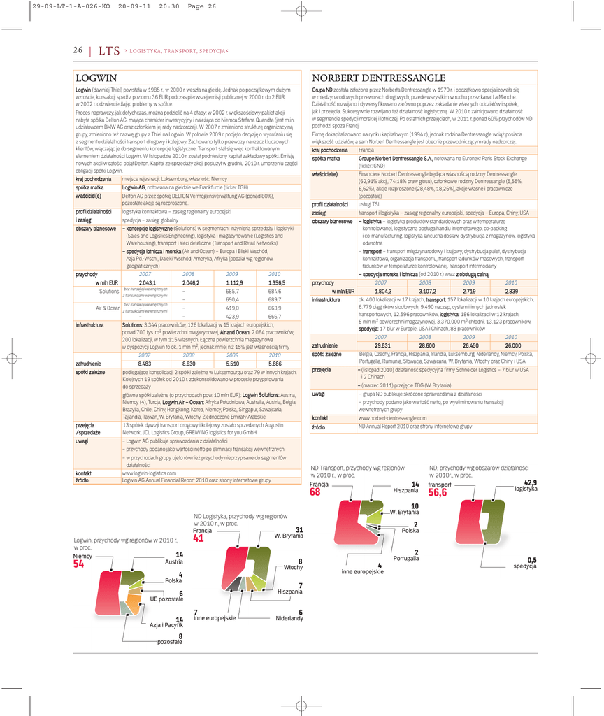 29-09-LT-1-A-026-KO 26 20-09-11 | LTS 20:30 Page 26 > L OGIS T YKA , TRANSPORT, SPEDYC JA < LOGWIN NORBERT DENTRESSANGLE Logwin (dawniej Thiel) powstała w 1985 r., w 2000 r. weszła na giełdę. Jednak po początkowym dużym wzroście, kurs akcji spadł z poziomu 36 EUR podczas pierwszej emisji publicznej w 2000 r. do 2 EUR w 2002 r. odzwierciedlając problemy w spółce. Proces naprawczy, jak dotychczas, można podzielić na 4 etapy: w 2002 r. większościowy pakiet akcji nabyła spółka Delton AG, mająca charakter inwestycyjny i należąca do Niemca Stefana Quandta (jest m.in. udziałowcem BMW AG oraz członkiem jej rady nadzorczej). W 2007 r. zmieniono strukturę organizacyjną grupy, zmieniono też nazwę grupy z Thiel na Logwin. W połowie 2009 r. podjęto decyzję o wycofaniu się z segmentu działalności transport drogowy i kolejowy. Zachowano tylko przewozy na rzecz kluczowych klientów, włączając je do segmentu koncepcje logistyczne. Transport stał się więc kontraktowanym elementem działalności Logwin. W listopadzie 2010 r. został podniesiony kapitał zakładowy spółki. Emisję nowych akcji w całości objął Delton. Kapitał ze sprzedaży akcji posłużył w grudniu 2010 r. umorzeniu części obligacji spółki Logwin. kraj pochodzenia miejsce rejestracji: Luksemburg, własność: Niemcy spółka matka Logwin AG, notowana na giełdzie we Frankfurcie (ticker TGH) właściciel(e) Delton AG przez spółkę DELTON Vermögensverwaltung AG (ponad 80%), pozostałe akcje są rozproszone. profil działalności logistyka kontraktowa – zasięg regionalny europejski i zasięg spedycja – zasięg globalny obszary biznesowe – koncepcje logistyczne (Solutions) w segmentach: inżynieria sprzedaży i logistyki (Sales and Logistics Engineering), logistyka i magazynowanie (Logistics and Warehousing), transport i sieci detaliczne (Transport and Retail Networks) – spedycja lotnicza i morska (Air and Ocean) – Europa i Bliski Wschód, Azja Pd.-Wsch., Daleki Wschód, Ameryka, Afryka (podział wg regionów geograficznych) przychody 2007 2008 2009 2010 w mln EUR 2.043,1 2.046,2 1.112,9 1.356,5 Solutions bez transakcji – wewnętrznych – 685,7 684,6 z transakcjami wewnętrznymi – – 690,4 689,7 bez transakcji wewnętrznych Air & Ocean z transakcjami – wewnętrznymi – 419,0 663,9 – – 423,9 666,7 infrastruktura Solutions: 3.344 pracowników, 126 lokalizacji w 15 krajach europejskich, ponad 700 tys. m2 powierzchni magazynowej; Air and Ocean: 2.064 pracowników, 200 lokalizacji, w tym 115 własnych. Łączna powierzchnia magazynowa w dyspozycji Logwin to ok. 1 mln m2, jednak mniej niż 15% jest własnością firmy 2007 2008 2009 2010 zatrudnienie 8.483 8.630 5.510 5.686 spółki zależne podlegające konsolidacji 2 spółki zależne w Luksemburgu oraz 79 w innych krajach. Kolejnych 19 spółek od 2010 r. zdekonsolidowano w procesie przygotowania do sprzedaży główne spółki zależne (o przychodach pow. 10 mln EUR): Logwin Solutions: Austria, Niemcy (4), Turcja; Logwin Air + Ocean: Afryka Południowa, Australia, Austria, Belgia, Brazylia, Chile, Chiny, Hongkong, Korea, Niemcy, Polska, Singapur, Szwajcaria, Tajlandia, Tajwan, W. Brytania, Włochy, Zjednoczone Emiraty Arabskie przejęcia 13 spółek dywizji transport drogowy i kolejowy zostało sprzedanych Augustin /sprzedaże Network, JCL Logistics Group, GREIWING logistics for you GmbH uwagi – Logwin AG publikuje sprawozdania z działalności – przychody podano jako wartości netto po eliminacji transakcji wewnętrznych – w przychodach grupy ujęto również przychody nieprzypisane do segmentów działalności kontakt www.logwin-logistics.com źródło Logwin AG Annual Financial Report 2010 oraz strony internetowe grupy Grupa ND została założona przez Norberta Dentressangle w 1979 r. i początkowo specjalizowała się w międzynarodowych przewozach drogowych, przede wszystkim w ruchu przez kanał La Manche. Działalność rozwijano i dywersyfikowano zarówno poprzez zakładanie własnych oddziałów i spółek, jak i przejęcia. Sukcesywnie rozwijano też działalność logistyczną. W 2010 r. zainicjowano działalność w segmencie spedycji morskiej i lotniczej. Po ostatnich przejęciach, w 2011 r. ponad 60% przychodów ND pochodzi spoza Francji Firmę dokapitalizowano na rynku kapitałowym (1994 r.), jednak rodzina Dentressangle wciąż posiada większość udziałów, a sam Norbert Dentressangle jest obecnie przewodniczącym rady nadzorczej. kraj pochodzenia Francja spółka matka Groupe Norbert Dentressangle S.A., notowana na Euronext Paris Stock Exchange (ticker: GND) właściciel(e) Financiere Norbert Dentressangle będąca własnością rodziny Dentressangle (62,91% akcji, 74,18% praw głosu), członkowie rodziny Dentressangle (5,55%, 6,62%), akcje rozproszone (28,48%, 18,26%), akcje własne i pracownicze (pozostałe) profil działalności usługi TSL zasięg transport i logistyka – zasięg regionalny europejski, spedycja – Europa, Chiny, USA obszary biznesowe – logistyka – logistyka produktów standardowych oraz w temperaturze kontrolowanej, logistyczna obsługa handlu internetowego, co-packing i co-manufacturing, logistyka łańcucha dostaw, dystrybucja z magazynów, logistyka odwrotna – transport – transport międzynarodowy i krajowy, dystrybucja palet, dystrybucja kontraktowa, organizacja transportu, transport ładunków masowych, transport ładunków w temperaturze kontrolowanej, transport intermodalny – spedycja morska i lotnicza (od 2010 r.) wraz z obsługą celną przychody 2007 2008 2009 2010 w mln EUR 1.804,3 3.107,2 2.719 2.839 infrastruktura ok. 400 lokalizacji w 17 krajach; transport: 157 lokalizacji w 10 krajach europejskich, 6.779 ciągników siodłowych, 9.490 naczep, cystern i innych jednostek transportowych, 12.596 pracowników, logistyka: 186 lokalizacji w 12 krajach, 5 mln m2 powierzchni magazynowej, 3.370.000 m3 chłodni, 13.123 pracowników, spedycja: 17 biur w Europ