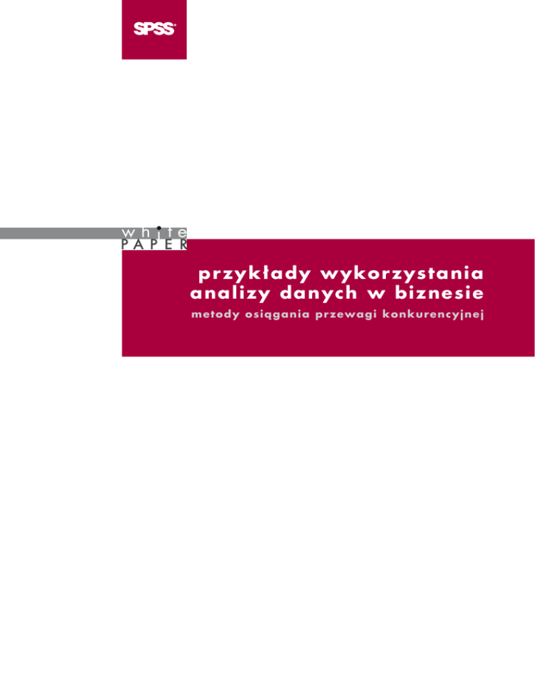 white PA P E R pr zykłady wykor zystania analizy danych w biznesie metody osiągania pr zewagi konkurency j n e j white PA P E R Istnieje wiele sposobów badania rynku oraz wykorzystywania zdobytych za ich pomocą informacji. Dlaczego zatem warto korzystać z analizy danych? Jakie korzyści mogą płynąć z jej wykorzystania w biznesie? To opracowanie stara się odpowiedzieć na te właśnie pytania. Dziś, częściej niż kiedykolwiek, stajemy przed problemem olbrzymiej ilości danych, często gromadzonych przez lata. Analiza danych jest nieocenionym narzędziem, które umożliwia ich efektywne gromadzenie i wykorzystanie. Oto tylko kilka spośród licznych korzyści płynących z jej zastosowania: zwiększanie przychodów, obniżanie kosztów, poprawa efektywności działania, zwiększanie zadowolenia klientów. W latach siedemdziesiątych zaprzęgnięto komputery do wykonywania czynności, które wcześniej wykonywano ręcznie. Komputery zaczęły wspomagać pracę biur, oferując pomoc w prowadzeniu księgowości, rozliczeń czy w obsłudze klientów. W latach osiemdziesiątych przedsiębiorstwa rozpoczęły budowanie komputerowych baz danych, a ww latach dziewięćdziesiątych wiele firm zgromadziło już ogromne ilości danych w swoich komputerach. Niestety, obecnie często nadal nie wykorzystują w pełni ich potencjału. Wiele firm tworz ogromne ilości prostych kolumnowo–wierszowych raportów i zestawień opartych na możliwościach arkuszy kalkulacyjnych i baz danych. Jednak wiele przedsiębiorstw przekonuje się, że proste raporty to o wiele za mało, aby naprawdę zdystansować konkurencję. Rysunek 1. Niewielka różnica w wysokości słupków obrazujących czas oczekiwania wskazuje, że cecha ta jest ważna dla klientów, ale jednocześnie nie są z niej zadowoleni. 3 white paper SPSS przykłady wykorzystania analizy danych w biznesie I właśnie tu wkracza analiza danych, która daje możliwość uzyskania rzeczywistej przewagi konkurencyjnej. Oto przykład: pewien bank odkrył niszę na rynku kredytów: udzielanie pożyczek na kupno samochodów klientom o wysokim stopniu ryzyka. Jednak, aby poradzić sobie z wysokim ryzykiem, bank zastosował metody statystyczne do stworzenia modelu ryzyka kredytowego, pozwalającego oceniać klientów, a następnie oszacować wysokość oprocentowania pożyczek w zależności od wysokości potencjalnego ryzyka. Stosując nową metodę szacowania ryzyka bank jest w stanie obniżyć sumę zaległych spłat pożyczek o 2–2,5 miliona dolarów miesięcznie, przy ogólnej sumie pożyczek wynoszącej 10 milionów dolarów. Dodatkową korzyścią jest obniżenie poziomu niepewności, ponieważ teraz decyzje podejmowane są na podstawie wcześniejszych ,szczegółowych analiz. Analiza danych odgrywa również ogromną rolę w takich kwestiach jak dbałość o zadowolenie klientów i pracowników, czy kontrola jakości. Aby osiągnąć sukces na tych polach, osoby podejmujące decyzje muszą budować systemy ocen oparte na metodach statystycznych. Kolejny przykład: w pewnym hotelu postanowiono zastosować analizę danych w celu zbadania zadowolenia klientów. Zauważono bowiem, że otwarcie nowego rodzaju recepcji spowodowało drastyczny spadek stopnia zadowolenia klientów z usług hotelu. Po przeprowadzeniu ankiet i wywiadów z klientami okazało się, że klienci byli zniecierpliwieni długim czasem oczekiwania na obsługę w recepcji, jak pokazuje to Rysunek 1. Kierownictwo hotelu podjęło więc decyzję o całkowitej reorganizacji pracy recepcji, co rzeczywiście doprowadziło do zwiększenia odsetka klientów zadowolonych z usług hotelu. Odkr yj najważniejsze narzędzie Firmy lepiej radzące sobie na rynku częściej posługują się analizą danych. Zamiast po prostu zgadywać, profesjonaliści korzystają z metod statystycznych w celu ustalenia ilościowych zależności między zjawiskami, dzięki czemu mogą wyciągać trafniejsze wnioski i podejmować właściwe decyzje. Analiza statystyczna pomaga rozwiązywać problemy w wielu dziedzinach: 4 Badanie zadowolenia klientów – zwiększanie lojalności klientów Analiza segmentacji rynku – trafniejsze wyszukiwanie odpowiedniego rynku Analiza baz danych – lepsze dysponowanie budżetem promocji Analiza rentowności sprzedaży – sprawniejsza organizacja sprzedaży Ocena przedsięwzięć – zwiększenie zadowolenia uczestników przedsięwzięć Badanie rynku – tworzenie skuteczniejszych strategii Badanie opinii publicznej – poznawanie kluczowych problemów i potrzeb społecznych Kontrola jakości – skuteczne zarządzanie jakością produktów i usług Analiza zgodności i raportowanie – zachowywanie zgodności z wymogami Analiza ryzyka kredytowego – tworzenie skuteczniejszej polityki kredytowej Ocena sprzedaży na określonym terenie – wykorzystanie ukrytych możliwości handlowych Analiza marketingu bezpośredniego i promocji – tworzenie skuteczniejszych metod marketingowych Analiza spadku lojalności klientów – sposoby skuteczniejszego przyciągania klientów Ocena atrakcyjności klienta – ocena dochodowości rynku Analiza obsługi klienta – redukowanie awarii oraz liczby reklamacji Analiza systemu wspierania klienta – polityka kadrowa dla zaspokojenia popytu na pomoc techniczną Analiza projektu produktu – zapewnianie sukcesu nowych produktów Analiza linii produktów – reorganizacja lub rozszerzenie oferty Prognoza sprzedaży – skuteczne planowanie produkcji Analiza osiągnięć pracowników – skuteczna rekrutacja pracowników Ocena zadowolenia pracowników – zmniejszenie fluktuacji kadr Analiza dodatkowych świadczeń dla pracowników – tworzenie atrakcyjnego i skutecznego systemu motywowania pracowników white PA P E R „Nasze własne badania i raporty były zawsze tak efektywne, ponieważ bazowały na analizie danych” – John Heinrich, IBM Corp. Dlaczego programy do analiz y danych przew yższają arkusze kalkulacyjne Programy pr