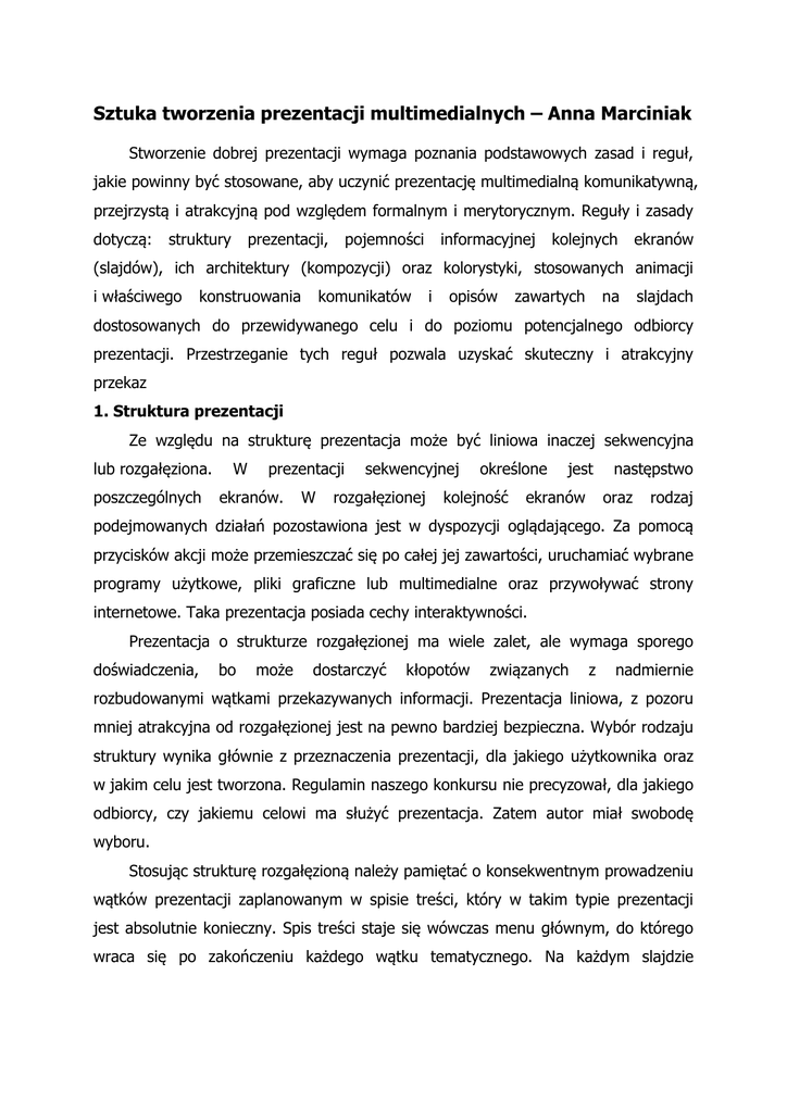 Sztuka tworzenia prezentacji multimedialnych – Anna Marciniak Stworzenie dobrej prezentacji wymaga poznania podstawowych zasad i reguł, jakie powinny być stosowane, aby uczynić prezentację multimedialną komunikatywną, przejrzystą i atrakcyjną pod względem formalnym i merytorycznym. Reguły i zasady dotyczą: struktury prezentacji, pojemności informacyjnej kolejnych ekranów (slajdów), ich architektury (kompozycji) oraz kolorystyki, stosowanych animacji i właściwego konstruowania komunikatów i opisów zawartych na slajdach dostosowanych do przewidywanego celu i do poziomu potencjalnego odbiorcy prezentacji. Przestrzeganie tych reguł pozwala uzyskać skuteczny i atrakcyjny przekaz 1. Struktura prezentacji Ze względu na strukturę prezentacja może być liniowa inaczej sekwencyjna lub rozgałęziona. poszczególnych W prezentacji ekranów. W sekwencyjnej rozgałęzionej określone kolejność jest ekranów następstwo oraz rodzaj podejmowanych działań pozostawiona jest w dyspozycji oglądającego. Za pomocą przycisków akcji może przemieszczać się po całej jej zawartości, uruchamiać wybrane programy użytkowe, pliki graficzne lub multimedialne oraz przywoływać strony internetowe. Taka prezentacja posiada cechy interaktywności. Prezentacja o strukturze rozgałęzionej ma wiele zalet, ale wymaga sporego doświadczenia, bo może dostarczyć kłopotów związanych z nadmiernie rozbudowanymi wątkami przekazywanych informacji. Prezentacja liniowa, z pozoru mniej atrakcyjna od rozgałęzionej jest na pewno bardziej bezpieczna. Wybór rodzaju struktury wynika głównie z przeznaczenia prezentacji, dla jakiego użytkownika oraz w jakim celu jest tworzona. Regulamin naszego konkursu nie precyzował, dla jakiego odbiorcy, czy jakiemu celowi ma służyć prezentacja. Zatem autor miał swobodę wyboru. Stosując strukturę rozgałęzioną należy pamiętać o konsekwentnym prowadzeniu wątków prezentacji zaplanowanym w spisie treści, który w takim typie prezentacji jest absolutnie konieczny. Spis treści staje się wówczas menu głównym, do którego wraca się po zakończeniu każdego wątku tematycznego. Na każdym slajdzie kończącym dany wątek musi się znaleźć przycisk akcji lub hiperłącze powrotu do menu głównego. Ma to sens wówczas, jeśli wątki są kilkuslajdowe. 2. Pojemność informacyjna poszczególnych ekranów Każda prezentacja powinna zaczynać się slajdem tytułowym zawierającym oprócz tytułu nazwiska autora czy autorów. Ponadto powinna zawierać spis treści lub opis zawartości oraz bibliografię oraz informację o autorstwie i źródle wykorzystanych materiałów. Ilość informacji zawarta na slajdzie jest zależna od wielu czynników – w tym od wieku oraz zdolności poznawczych potencjalnego odbiorcy. Po drugie od tego czy prezentacja jest samodzielnym źródłem wiedzy, czy materiałem dydaktycznym, który poprzez zawarte w nim treści, przekazywane multimedialnie, pomaga prowadzić zajęcia dydaktyczne. Jeśli prezentacja zgłoszona do konkursu miała pełnić taką rolę to ścieżka narracji powinna przejmować rolę nauczyciela/prezentera, a treści zawarte na ekranach prezentacji stanowią kwintesencje wypowiedzi ustnej prelegenta. Aby pojemność informacyjną ekranu uczynić optymalną, liczba linijek tekstu na jego powierzchni nie powinna przekraczać ośmiu. W usprawiedliwionych przypadkach, gdy dłuższy tekst stanowi logiczną całość i jego podział byłby niekorzystny, można zwiększyć liczbę linii, oferując odbiorcom więcej czasu na analizę zawartości ekranu. W przypadku postulowanych kilku linii tekstu na ekranie komfort oglądu zapewnia zastosowanie czcionki o rozmiarze nie mniejszym od 24 pkt. Zastosowanie czcionki o większych rozmiarach wydatnie wpływa na poprawę percepcji prezentowanych treści. Jednak z wielkością rozmiaru czcionki nie należy przesadzić by nie uzyskać efektu „rozsadzania” slajdu. Nie bez znaczenia jest również krój użytej czcionki. Używamy czcionek, które zapewniają największą czytelność, a za takie uchodzą czcionki bezszeryfowe (pozbawione ozdobników), np. Arial, Verdana, Tahoma lub klasyczne czcionki szeryfowe (z niewielka ilością łuków), np. Times New Roman. Istnieje prawidłowość, że czytelność zapisu maleje wraz z atrakcyjnością zastosowanego kroju czcionki. Dla zwiększenia czytelności należy, zatem unikać czcionek zbyt ozdobnych oraz ograniczyć liczbę stosowanych krojów czcionek w ramach danej prezentacji do dwóch, w uzasadnionych przypadkach trzech (motto, cytaty). Podobne zasady dotyczą obiektów wstawianych na sjady: rysunków, zdjęć, schematów, wykresów etc. Ich liczba na powierzchni ekranu nie powinna przekraczać sześciu, ponieważ większa ich liczba ogranicza znacznie czytelność przekazu. 3. Kompozycja Istotnym czynnikiem określającym jakość prezentacji multimedialnej jest kompozycja ekranu rozumiana zarówno jako układ tekstu, położenie obiektów graficznych jak i wzajemne usytuowanie rysunków i napisów. Należy unikać prezentowania tekstu w postaci ciągłej i stosować podział tekstu na akapity, tworzyć listy numerowane lub wypunktowane. Dodatkowo należy stosować odstępy po akapitach, ponieważ zdecydowanie zwiększa to czytelność przekazu. Wskazane jest stosowanie tabulatorów oraz wyrównywanie tekstu do strony lewej. Należy rozważyć, czy justowanie jest korzystne, ponieważ w przypadku zastosowania dużej czcionki mogą pojawić się w linijkach duże odstępy, które źle wyglądają, zakłócają układ tekstu. W takiej sytuacji korzystniejsze może być wyśrodkowanie tekstu. Istotnym elementem kompozycji jest również rozmieszczenie rysunków, zdjęć, schematów, wykresów na powierzchni ekranu. Obiekty graficzne rozmieszczone w regularnych rzędach lub kolumnach zapamiętywane są lepiej, niż rozlokowane w sposób nieregularny. 4. Kolorystyka Tworzenie prezentacji jest sztuką. Tworząc 