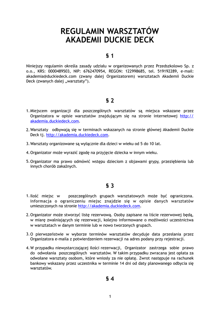 REGULAMIN WARSZTATÓW AKADEMII DUCKIE DECK §1 Niniejszy regulamin określa zasady udziału w organizowanych przez Przedszkolowo Sp. z o.o., KRS: 0000489503, NIP: 6762470954, REGON: 122998685, tel. 519192289, e-mail: [email protected] (zwany dalej Organizatorem) warsztatach Akademii Duckie Deck (zwanych dalej „warsztaty”). §2 1. Miejscem organizacji dla poszczególnych warsztatów są miejsca wskazane przez Organizatora w opisie warsztatów znajdującym się na stronie internetowej http:// akademia.duckiedeck.com. 2. Warsztaty odbywają się w terminach wskazanych na stronie głównej Akademii Duckie Deck tj. http://akademia.duckiedeck.com. 3. Warsztaty organizowane są wyłącznie dla dzieci w wieku od 5 do 10 lat. 4. Organizator może wyrazić zgodę na przyjęcie dziecka w innym wieku. 5. Organizator ma prawo odmówić wstępu dzieciom z objawami grypy, przeziębienia lub innych chorób zakaźnych. §3 1. Ilość miejsc w poszczególnych grupach warsztatowych może być ograniczona. Informacja o ograniczeniu miejsc znajdzie się w opisie danych warsztatów umieszczonych na stronie http://akademia.duckiedeck.com. 2. Organizator może stworzyć listę rezerwową. Osoby zapisane na liście rezerwowej będą, w miarę zwalniających się rezerwacji, kolejno informowane o możliwości uczestnictwa w warsztatach w danym terminie lub w nowo tworzonych grupach. 3. O pierwszeństwie w wyborze terminów warsztatów decyduje data przesłania przez Organizatora e-maila z potwierdzeniem rezerwacji na adres podany przy rejestracji. 4. W przypadku niewystarczającej ilości rezerwacji, Organizator zastrzega sobie prawo do odwołania poszczególnych warsztatów. W takim przypadku zwracana jest opłata za odwołane warsztaty osobom, które wniosły za nie opłatę. Zwrot następuje na rachunek bankowy wskazany przez uczestnika w terminie 14 dni od daty planowanego odbycia się warsztatów. §4 1 1. Organizator organizuje trzy rodzaje warsztatów: odpłatne, nieodpłatne z obowiązkiem rejestracji i nieodpłatne otwarte (bez obowiązku rejestracji). 2. Dokładna informacja o rodzaju warsztatów, ich dacie, miejscu odbycia się i ewentualnej cenie znajduje się w opisie danych warsztatów umieszczonych na stronie http:// akademia.duckiedeck.com. 3. Warunkiem wstępu na warsztaty odpłatne Akademii Duckie Deck jest okazanie przez uczestnika unikalnego kodu weryfikacyjnego, który każdy uczestnik otrzymuje w wyniku przeprowadzenia procedury rejestracji (obejmującej m.in. akceptację postanowień niniejszego Regulaminu) i płatności, opisanym w §5 niniejszego regulaminu. Kod weryfikacyjny jest przesyłany na adres e-mail wskazany w procesie rejestracji. 4. Warunkiem wstępu na warsztaty nieodpłatne z obowiązkiem rejestracji Akademii Duckie Deck jest okazanie przez uczestnika unikalnego kodu weryfikacyjnego, który każdy uczestnik otrzymuje w wyniku przeprowadzenia procedury rejestracji (obejmującej m.in. akceptację postanowień niniejszego Regulaminu) bez konieczności dokonywania płatności. O rejestracji na wolne miejsca decyduje kolejność zgłoszeń poprzez formularz rejestracyjny. Kod weryfikacyjny jest przesyłany na adres e-mail wskazany w procesie rejestracji. 5. Warsztaty nieodpłatne otwarte nie wymagają rejestracji i są ogólnodostępne. 6. Osobą rejestrującą może być wyłącznie osoba pełnoletnia będąca przedstawicielem ustawowym dziecka, co dana osoba poświadcza akceptując niniejszy Regulamin. §5 Przebieg procedury rejestracji i płatności: 1. Organizator udostępnia wyłącznie następujące rodzaje płatności w systemie PayU: przelew bankowy lub płatność kartą płatniczą albo kredytową. Organizator nie dopuszcza płatności gotówką. 2. Na stronie głównej, tj. http://akademia.duckiedeck.com należy wybrać i zaznaczyć jeden z dostępnych terminów warsztatów, a następnie zaznaczyć opcję “ZAPISZ DZIECKO” (informacja o cenie danych warsztatów znajduje się nad opcją “ZAPISZ DZIECKO”), 3. W uruchomionym oknie „FORMULARZ ZAPISU”, osoba pełnoletnia dokonująca rejestracji podaje swoje: imię i nazwisko, adres e-mail oraz numer telefonu, a także wybiera ilość dzieci, które chce zapisać na warsztaty, a następnie wybiera sposób płatności korzystając z udostępnionego systemu PayU, 4. Po potwierdzeniu wpisanych i wybranych danych, o których mowa w powyższym pkt. 3, poprzez kliknięcie przycisku “PŁACĘ TERAZ Z PAYU” następuje, wg własnego wyboru, przekierowanie na podstronę systemu PayU lub bezpośrednio do strony wybranego banku, na której w udostępnionym systemie płatności należy dokonać płatności. Po dokonaniu płatności następuje ponowne przekierowanie na stronę http:// akademia.duckiedeck.com, na której wyświetla się komunikat potwierdzający dokonanie rezerwacji lub informujący o niepowodzeniu dokonanej procedury. 2 5. Potwierdzeniem dokonanej płatności i rezerwacji jest e-mail w którym znajduje się unikalny kod weryfikacyjny, wysyłany przez Organizatora na adres podany w procesie rejestracji. 6. W przypadku nieotrzymania e-maila, o którym mowa w pkt. 5 niniejszego Regulaminu, pomimo poprawnie przeprowadzonej płatności należy skontaktować się Organizatorem za pośrednictwem poczty elektronicznej kierując e-maila z opisem zaistniałej sytuacji oraz danymi osobowymi umożliwiającymi kontakt (imię, nazwisko, telefon) na adres Organizatora tj. [email protected]. §6 1. Po dokonaniu rejestracji i opłaceniu warsztatów odpłatnych nie ma możliwości rezygnacji z uczestnictwa i żądania zwrotu wpłaconej kwoty. 2. W przypadku nieobecności na warsztatach odpłatnych wpłacona kwota nie podlega zwrotowi. 3. Kod weryfikacyjny uzyskany po uiszczeniu zapłaty za warsztaty odpłatne może być przekazany innej osobie i uprawnią ją do wzięcia udziału w warsztatach. 4. W przypadku nieodbycia się warsztatów w wyznaczonym terminie Organizator zwróci dokonane wpłaty na rachunek bankowy wskazan