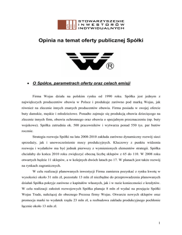 Opinia na temat oferty publicznej Spółki • O Spółce, parametrach oferty oraz celach emisji Firma Wojas działa na polskim rynku od 1990 roku. Spółka jest jednym z największych producentów obuwia w Polsce i produkuje zarówno pod marką Wojas, jak również na zlecenie innych znanych producentów obuwia. Firma posiada w swojej ofercie buty damskie, męskie i młodzieżowe. Ponadto zajmuje się produkcją obuwia dziecięcego na zlecenie innych firm, obuwia ochronnego oraz obuwia o specjalnym przeznaczeniu (np. buty wojskowe). Spółka zatrudnia ok. 500 pracowników i wytwarza ponad 550 tys. par butów rocznie. Strategia rozwoju Spółki na lata 2008-2010 zakłada zarówno dynamiczny rozwój sieci sprzedaży, jak i unowocześnienie mocy produkcyjnych. Kluczowy z punktu widzenia rozwoju i wydatków ma być jednak pierwszy z wymienionych elementów strategii. Spółka chciałaby do końca 2010 roku zwiększyć obecną liczbę sklepów z 65 do 110. W 2008 roku otwartych będzie 11 sklepów, a w kolejnych dwóch latach po 17. W planach jest także rozwój na rynkach zagranicznych. W celu realizacji planowanych inwestycji Firma zamierza pozyskać z rynku kwotę w wysokości około 31 mln zł, pozostałe 13 mln zł niezbędne do przeprowadzenia planowanych działań Spółka pokryje zarówno z kapitałów własnych, jak i w razie konieczności z kredytów. W celu realizacji założeń rozwojowych Spółka planuje 8 mln zł wydać na przejęcie Spółki Wojas Trade, należącej do obecnego Prezesa firmy Wojas. Otwarcie nowych sklepów oraz promocja marki to wydatek rzędu 23 mln zł, a rozbudowa zakładu produkcyjnego pochłonie łącznie około 13 mln zł. 1 Cena emisyjna nowych akcji została ustalona na poziomie 9,5 zł. Zapisy na 1 mln walorów w transzy otwartej odbędą się w terminie 13-17 marca. Z kolei 20 marca przyjmowane będą zapisy na 2,35 mln akcji w transzy dużych inwestorów. Tego samego dnia nastąpi zamknięcie subskrypcji, po czym w ciągu trzech dni roboczych nastąpi przydział akcji. • Finanse, parametry wskaźników rynkowych W latach 2004-2006 obserwowano dość duże wahania wartości przychodów ze sprzedaży Spółki. W roku 2004 wynosiły one 53,5 mln zł. W roku 2005 spadły o 17%, co było spowodowane przede wszystkim spadkiem sprzedaży do odbiorców zagranicznych, w tym głównie do Rosji, Francji oraz Stanów Zjednoczonych. Z kolei w roku 2006 przychody ze sprzedaży były o ponad 51% wyższe niż w roku 2005 i miały wartość 67,2 mln zł. Jedną z głównych przyczyn tak dużego wzrostu w 2006 roku było wygranie przetargu organizowanego przez Ministerstwo Obrony Narodowej na dostawy obuwia specjalnego dla armii. Wartość przychodów z tytułu realizacji tego zamówienia przekroczyła kwotę 9,5 mln zł. W okresie tym wzrosły także przychody ze sprzedaży eksportowej. Przez cały analizowany okres Spółka osiągała dodatni wynik na poziomie EBIT. Wzrósł on w ciągu trzech lat z 0,95 mln zł do 7,5 mln zł, czyli o 690%. Na poziomie wyniku netto Wojas wykazał w 2004 roku stratę w wysokości 89 tyś. Zł. Tymczasem w 2006 zysk netto równy był już kwocie 5,3 mln zł. Po sześciu miesiącach 2007 roku Spółka ma na koncie 22,2 mln zł przychodów, zysk EBIT równy 1,4 mln zł i zysk netto w wysokości 1,2 mln zł. W tym samym okresie 2006 roku były to wartości rzędu 23,6 mln zł, 0,65 mln zł oraz 0,2 mln zł. Źródło: Prospekt Emisyjny Wojas Zgodnie z prognozą na 2007 rok Wojas zamierza wypracować na poziomie jednostkowym 49,7 mln zł przychodów, zysk operacyjny w wysokości 3,9 mln zł oraz zysk netto 3,55 mln zł. Oznacza to spadek poszczególnych pozycji wobec roku 2006 odpowiednio o 26%, 48% oraz 33%. Prognozowane skonsolidowane przychody na 2008 rok mają 2 ukształtować się na poziomie 94,3 mln zł, EBIT wyniesie 7,2 mln zł, a zysk netto 6,3 mln zł. Osiągnięcie w 2008 roku planowanych rezultatów oznacza spadek rentowności netto Spółki z 7,1% osiągniętej w 2007 roku do 6,7% w 2008 roku. Prognoza na kolejne lata w tym na rok 2010 rok zakłada dalszy wzrost przychodów Spółki do 138 mln zł oraz zysku netto do13,2 mln zł. Oznacza to, że rentowność na poziomie netto może wzrosnąć w 2010 r. nawet do 9,5%. Źródło: Prospekt Emisyjny Wojas Cena emisyjna nowych akcji została ustalona na poziomie 9,5 zł, a więc 4 zł poniżej górnych, a jednocześnie 0,5 zł powyżej dolnych widełek cenowych. Przy proponowanej cenie emisyjnej oraz po uwzględnieniu prognozy za 2007 Spółka będzie notowana ze wskaźnikiem C/Z równym 35,7 oraz MC/EBIT 32,5. Realizacja tegorocznych wyników pozwoli jednak na istotny spadek tych parametrów, a tym samym na wzrost ich atrakcyjności. Po wynikach za 2008 rok wskaźnik C/Z może mieć wartość 20,1, a wskaźnik MC/EBIT 17,6. Tymczasem średni wskaźnik C/Z oraz MC/EBIT dla Spółek NG2 oraz Gino Rossi, to odpowiednio 22 oraz 14,9. Oznacza to, że w chwili obecnej firmy te pod względem porównawczym wyceniane są niżej od Spółki Wojas. Zważając na ten fakt, uznać można, że Zarząd Wojasa powinien ustalić cenę na poziomie niższym od dolnych widełek zaproponowanego przedziału cenowego, tak aby zapewnić inwestorom w sytuacji bardzo niepewnej koniunktury giełdowej jeszcze większe bezpieczeństwo inwestycji. W krótkim oraz średnim terminie akcje Wojasa nie będą więc walorami tanimi. Jednak wraz z upływem czasu i przy założeniu realizacji założeń budżetowych atrakcyjność akcji będzie się poprawiać. 3 • Podsumowanie Firma Wojas jest stabilnym podmiotem z branży obuwniczej o ugruntowanej pozycji rynkowej. Firma planuje w najbliższych latach szybki rozwój sieci sprzedaży, dzięki czemu nastąpić ma skokowy wzrost przychodów oraz zysków. Poprawie ulegać będzie również rentowność na poziomie netto, co będzie świadczyć o wzroście efektywności zarządzania spółką. Dodatkowym ‘bonusem’ w przyszłych wynikach mogą być również 