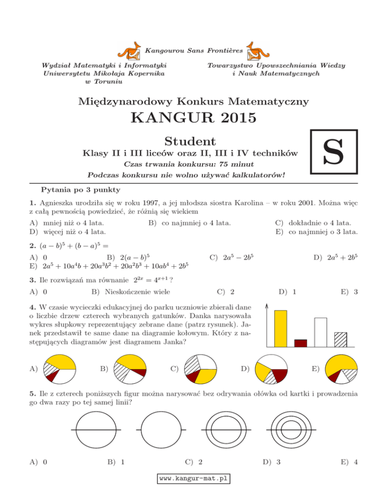 Kangourou Sans Frontières Wydział Matematyki i Informatyki Uniwersytetu Mikołaja Kopernika w Toruniu Towarzystwo Upowszechniania Wiedzy i Nauk Matematycznych Międzynarodowy Konkurs Matematyczny KANGUR 2015 Student S Klasy II i III liceów oraz II, III i IV techników Czas trwania konkursu: 75 minut Podczas konkursu nie wolno używać kalkulatorów! Pytania po 3 punkty 1. Agnieszka urodziła się w roku 1997, a jej młodsza siostra Karolina – w roku 2001. Można więc z całą pewnością powiedzieć, że różnią się wiekiem A) mniej niż o 4 lata. D) więcej niż o 4 lata. B) co najmniej o 4 lata. 2. (a − b)5 + (b − a)5 = A) 0 B) 2(a − b)5 E) 2a5 + 10a4 b + 20a3 b2 + 20a2 b3 + 10ab4 + 2b5 C) dokładnie o 4 lata. E) co najmniej o 3 lata. C) 2a5 − 2b5 D) 2a5 + 2b5 3. Ile rozwiązań ma równanie 22x = 4x+1 ? A) 0 B) Nieskończenie wiele C) 2 D) 1 E) 3 4. W czasie wycieczki edukacyjnej do parku uczniowie zbierali dane o liczbie drzew czterech wybranych gatunków. Danka narysowała wykres słupkowy reprezentujący zebrane dane (patrz rysunek). Janek przedstawił te same dane na diagramie kołowym. Który z następujących diagramów jest diagramem Janka? A) B) C) D) E) 5. Ile z czterech poniższych figur można narysować bez odrywania ołówka od kartki i prowadzenia go dwa razy po tej samej linii? A) 0 B) 1 C) 2 www.kangur-mat.pl D) 3 E) 4 www.kangur-mat.pl 6. Piotr dodał do siebie 31 kolejnych liczb naturalnych od 2001 do 2031, a następnie otrzymaną sumę podzielił przez 31. Jaki wynik otrzymał? A) 2012 B) 2013 C) 2015 D) 2016 E) 2496 7. Kwadratową kartkę papieru zagięto wzdłuż przerywanych linii w pewnej kolejności (patrz rysunek) i odcięto jeden z rogów powstałego kwadratu. Ile jest dziur w tej kartce po jej rozłożeniu (nie liczymy ubytków na brzegu)? A) 0 B) 1 C) 2 D) 4 ⇒ E) 9 8. Donica ma kształt stożka ściętego (patrz rysunek). Powierzchnię boczną donicy (a więc donicę bez podstawy) należy pokryć kawałkiem papieru, tak aby nie powstały luki ani zakładki. Jaki powinien być kształt użytego kawałka papieru? A) B) C) D) E) 9. Średnice trzech półkoli tworzą boki trójkąta prostokątnego, a ich pola są równe odpowiednio X, Y i Z (patrz rysunek). Która z zależności musi wówczas zachodzić? √ √ √ A) X + Y < Z B) X + Y = Z C) X + Y = Z 2 2 2 D) X + Y = Z E) X 2 + Y 2 = Z Z Y X 10. Niech n oznacza liczbę kątów wewnętrznych w czworokącie wypukłym, które są kątami ostrymi. Lista wszystkich możliwych wartości n to A) 0, 1, 2. B) 0, 1, 2, 3. C) 0, 1, 2, 3, 4. D) 0, 1, 3. E) 1, 2, 3. Pytania po 4 punkty 11. A) q √ (2015 + 2015) + (2015 − 2015) + (2015 · 2015) + (2015 : 2015) = 2015 B) 2015 C) 2016 D) 2017 12. Ela chce w każde kółko diagramu obok wpisać pewną liczbę, tak aby każda liczba była sumą dwóch sąsiednich liczb. Jaką liczbę musi wpisać w kółko ze znakiem zapytania? A) −5 B) −16 C) −8 D) −3 E) 4030 3 5 E) Taka liczba nie istnieje. ? 13. Danych jest pięć różnych dodatnich liczb całkowitych a, b, c, d, e, przy czym wiadomo, że c : e = b, a + b = d i e − d = a. Która z liczb a, b, c, d, e jest największa? A) a B) b C) c D) d E) e 14. Na ile obszarów dzieli płaszczyznę oś OX i wykresy funkcji f (x) = 2 − x2 oraz g(x) = x2 − 1? A) 6 B) 8 C) 10 D) 12 E) 14 www.kangur-mat.pl 15. Średnią geometryczną n liczb dodatnich nazywamy pierwiastek n-tego stopnia z iloczynu tych liczb. Średnia geometryczna pewnych trzech liczb jest równa 3, a średnia geometryczna innych trzech liczb wynosi 12. Jaka jest średnia geometryczna tych sześciu liczb? 15 15 A) 4 B) 6 C) D) E) 36 2 6 16. Na diagramie przedstawiono 3 okręgi wpółśrodkowe i dwie wzajemnie prostopadłe średnice okręgu o największym promieniu. Ile jest równy iloczyn promieni tych trzech okręgów, jeśli trzy zacieniowane figury mają równe pola, a promień najmniejszego okręgu jest równy jeden? √ √ √ 3 3 A) 6 B) 3 C) D) 2 2 E) 6 2 17. Sprzedawca samochodów nabył dwa samochody, a następnie odsprzedał je swoim klientom. Pierwszy samochód sprzedał za cenę o 40% wyższą od ceny zakupu, a drugi samochód sprzedał za cenę o 60% wyższą od ceny jego zakupu. W sumie za oba samochody zainkasował o 54% więcej, niż wydał na ich zakup. Jaki jest stosunek ceny, za jaką sprzedawca nabył pierwszy samochód, do ceny, za jaką nabył drugi samochód? A) 10 : 13 B) 20 : 27 C) 3 : 7 D) 7 : 12 18. Na diagramie obok przedstawiono schematycznie tabliczkę mnożenia od 1 do 10. Ile jest równa suma wszystkich 100 iloczynów w pełnej tabeli? A) 1000 B) 2025 C) 2500 D) 3025 E) 5500 E) 2 : 3 × 1 2 3 1 1 2 3 2 2 4 6 .. .. .. .. . . . . 10 10 20 30 10 10 20 .. . . . . 100 ... ... ... 19. Niech xy oznacza zapis liczby dwucyfrowej o cyfrach x i y. Na ile sposobów można wybrać różne cyfry a, b, c, tak aby ab < bc < ca ? A) 84 B) 96 C) 125 D) 201 E) 502 20. Na standardowej kostce do gry suma oczek na każdych dwóch przeciwległych ścianach jest równa 7. Rysunek przedstawia dwie identyczne standardowe kostki do gry. Ile oczek może być na niewidocznej ścianie z prawej strony oznaczonej znakiem zapytania? A) Tylko 5. B) Tylko 2. C) 2 lub 5. ? D) 1, 2, 3 lub 5. E) 2,3 lub 5. Pytania po 5 punktów 21. W pudełku jest 2015 koralików ponumerowanych liczbami od 1 do 2015. Koraliki z równą sumą wypisanych na nich cyfr mają ten sam kolor, a koraliki z różnymi sumami mają różne kolory. Ile jest różnych kolorów koralików w pudełku? A) 10 B) 27 C) 28 D) 29 E) 2015 22. Które z poniższych zdań jest pierwszym zdaniem prawdziwym, jeśli zdania czytamy w kolejności od 1. do 5.? 1. Zdanie 3. jest prawdziwe. 4. Zdanie 2. jest fałszywe. A) 1. B) 2. 2. Zdanie 1. jest prawdziwe. 5. 1 + 1 = 2. C) 3. 3. Zdanie 5. jest fałszywe. D) 4. E) 5. www.kangur-mat.pl 23. Na ile sposobów można pokolorować krawędzie sześcianu ABCDEF GH czterema danymi kolorami, jeśli na każdej ścianie mają być krawędzie we wszys