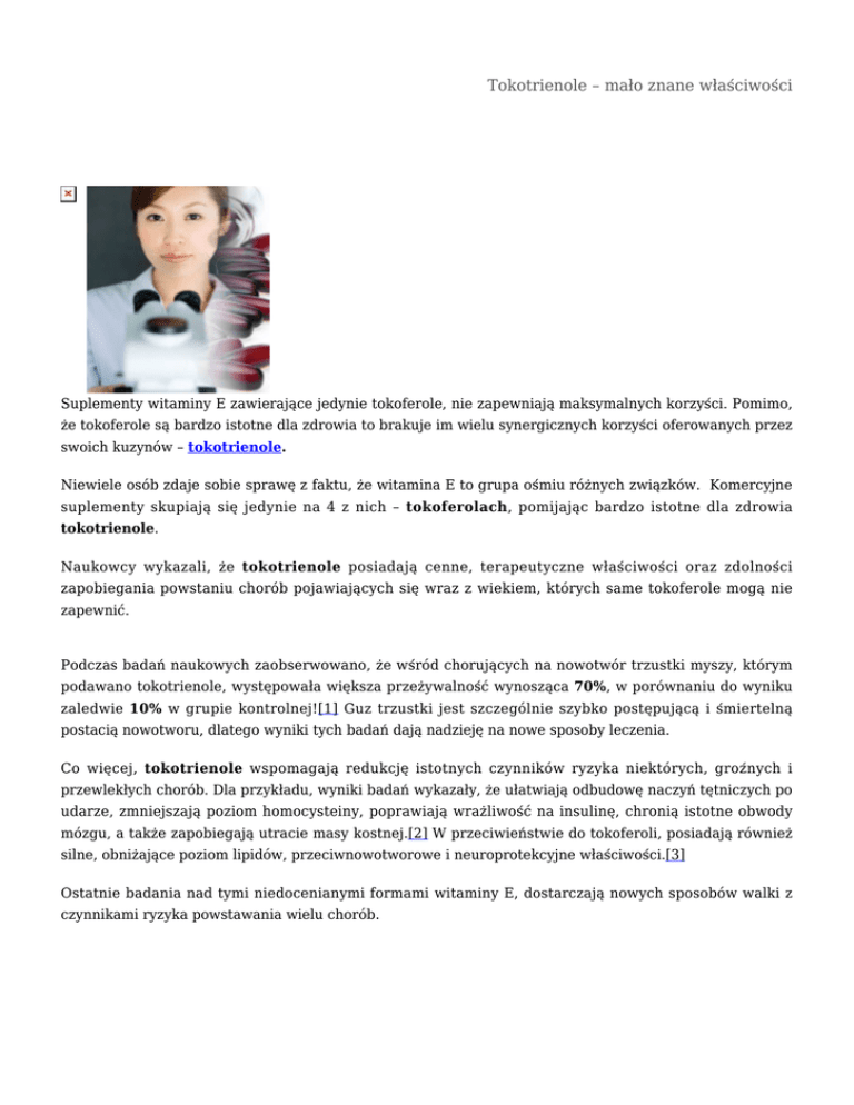 Tokotrienole – mało znane właściwości Suplementy witaminy E zawierające jedynie tokoferole, nie zapewniają maksymalnych korzyści. Pomimo, że tokoferole są bardzo istotne dla zdrowia to brakuje im wielu synergicznych korzyści oferowanych przez swoich kuzynów – tokotrienole. Niewiele osób zdaje sobie sprawę z faktu, że witamina E to grupa ośmiu różnych związków. Komercyjne suplementy skupiają się jedynie na 4 z nich – tokoferolach, pomijając bardzo istotne dla zdrowia tokotrienole. Naukowcy wykazali, że tokotrienole posiadają cenne, terapeutyczne właściwości oraz zdolności zapobiegania powstaniu chorób pojawiających się wraz z wiekiem, których same tokoferole mogą nie zapewnić. Podczas badań naukowych zaobserwowano, że wśród chorujących na nowotwór trzustki myszy, którym podawano tokotrienole, występowała większa przeżywalność wynosząca 70%, w porównaniu do wyniku zaledwie 10% w grupie kontrolnej![1] Guz trzustki jest szczególnie szybko postępującą i śmiertelną postacią nowotworu, dlatego wyniki tych badań dają nadzieję na nowe sposoby leczenia. Co więcej, tokotrienole wspomagają redukcję istotnych czynników ryzyka niektórych, groźnych i przewlekłych chorób. Dla przykładu, wyniki badań wykazały, że ułatwiają odbudowę naczyń tętniczych po udarze, zmniejszają poziom homocysteiny, poprawiają wrażliwość na insulinę, chronią istotne obwody mózgu, a także zapobiegają utracie masy kostnej.[2] W przeciwieństwie do tokoferoli, posiadają również silne, obniżające poziom lipidów, przeciwnowotworowe i neuroprotekcyjne właściwości.[3] Ostatnie badania nad tymi niedocenianymi formami witaminy E, dostarczają nowych sposobów walki z czynnikami ryzyka powstawania wielu chorób. Tokotrienole – mało znane właściwości Tokotrienole i nowotwór Wiele lat badań nad witaminą E przyniosło sprzeczne wyniki odnośnie jej wpływu na nowotwór. Obecnie uważa się, że ta niezgodność spowodowana była prawdopodobnie przez powszechne stosowanie podczas testów samego alfa-tokoferolu.[4] Teraz wiemy, że ma on niską aktywność przeciwnowotworową, w przeciwieństwie do tokotrienoli, posiadających silne właściwości zapobiegające jego powstaniu.[5] Podczas niedawno prowadzonych badań, których wyniki wprawiły w osłupienie naukowców, zaobserwowano, że po suplementacji tokotrienolu nastąpiło znaczne wydłużenie długości życia myszy z nowotworem trzustki,[6] który u ludzi uznaje się za jeden z najbardziej agresywnych i śmiertelnych rodzajów nowotworów, a przeżywalność chorych liczy się jedynie w miesiącach.[7] Badania przeprowadzone w 2013 roku wykazały, że po 16 tygodniach leczenia tylko 10% myszy, którym podawano placebo pozostało przy życiu, podczas gdy w grupie leczonej gemcytabiną, standardowym lekiem stosowanym w chemioterapii, przeżywalność sięgała 30%. Natomiast wśród gryzoni, które poddano terapii tokotrienolem osiągnięto zaskakujący wynik 70%. Leczenie skojarzone obejmujące gemcytabinę i tokotrienol odpowiadało za 90%przeżywalność.[8] Tokotrienole są nadzwyczajną substancją odżywczą, która ma wieloaspektowe działanie, wpływając praktycznie na każde stadium rozwoju nowotworu.[9] Podobnie jak tokoferole, posiadają właściwości antyoksydacyjne, z którymi – jak się wydaje – znaczna część przeciwnowotworowej aktywności nie ma jednak związku.[10] Wybrane mechanizmy działania tokotrienoli w profilaktyce nowotworowej [11] DZIAŁANIE Apoptoza (zaprogramowana śmierć komórkowa) Zatrzymanie cyklu komórkowego REZULTAT Śmierć komórek nowotworowych Spowolnienie wzrostu guza Tokotrienole – mało znane właściwości Hamowanie wzrostu nowych naczyń Niedostarczenie tlenu i składników krwionośnych (angiogeneza) odżywczych do guza Hamowanie enzymu reduktaza HMG-CoA Hamowanie metastazy Zmniejszenie ekspresji genów Zapobieganie powstawaniu nowotworu powodujących powstanie nowotworu Zwiększenie ekspresji genów które Zapobieganie powstawaniu i progresji hamują nowotwór nowotworu Tokotrienole wpływają na kilka czynników, wykorzystywanych przez nowotwór do rozwoju oraz wzrostu. Jak wykazano, hamują one powstawanie nowych naczyń krwionośnych, niezbędnych do szybkiego rozwoju guza oraz zatrzymują wzrost i proliferację komórek nowotworowych.[13] Tokotrienole uwrażliwiają również komórki nowotworowe na wpływ standardowej chemioterapii. Co zaskakujące, wydają się zwalczać również macierzyste komórki nowotworu, które są wysoce odporne na działanie leków i przyczyniają się do nawrotów.[14] Osłabiają także wpływ kancerogenów chemicznych, co potwierdzono podczas badań prowadzonych na zwierzętach.[15] Co więcej, tokotrienole powodują apoptozę – zaprogramowaną śmierć komórek nowotworowych, co może powstrzymać guz od utworzenia „punktu zaczepienia” w organizmie. Apoptoza jest również niezbędnym czynnikiem zmniejszającym istniejące nowotwory, co może tłumaczyć rosnące wykorzystywanie tokotrienoli (samodzielnie lub z konwencjonalnymi chemioterapeutykami) w leczeniu pacjentów.[16] Tokotrienole wykorzystują jeszcze jeden nietypowy mechanizm zwalczający nowotwór. Wydają się blokować enzym zwany reduktazą HMG-CoA, którego komórki guza potrzebują do inwazji i tworzenia przerzutów (leki statynowe są nacelowane na hamowanie tego właśnie enzymu [17]). Jak wykazano, połączenie tokotrienoli i atorwastatyny (Lipitor ®) znacznie zwiększa hamowanie wzrostu komórek nowotworowych.[18] Tokotrienole – mało znane właściwości Co musisz wiedzieć: przełomowe badania nad tokotrienolami Typowe suplementy witaminy E zawierają jedynie alfa-tokoferol, najlepiej znany związek z rodziny witaminy E. Pomimo, że tokoferole są bardzo cennymi substancjami odżywczymi, to nie posiadają dodatkowych korzyści oferowanych przez swoich kuzynów – tokotrienole. Z racji małych, ale istotny