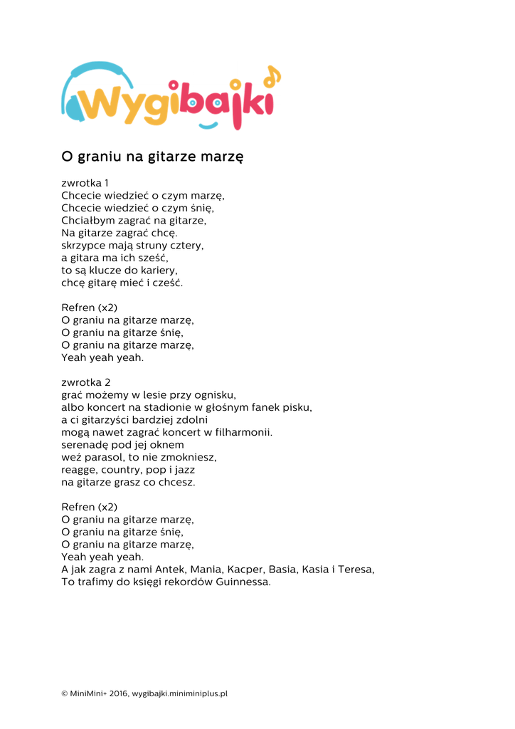 O graniu na gitarze marzę zwrotka 1 Chcecie wiedzieć o czym marzę, Chcecie wiedzieć o czym śnię, Chciałbym zagrać na gitarze, Na gitarze zagrać chcę. skrzypce mają struny cztery, a gitara ma ich sześć, to są klucze do kariery, chcę gitarę mieć i cześć. Refren (x2) O graniu na gitarze marzę, O graniu na gitarze śnię, O graniu na gitarze marzę, Yeah yeah yeah. zwrotka 2 grać możemy w lesie przy ognisku, albo koncert na stadionie w głośnym fanek pisku, a ci gitarzyści bardziej zdolni mogą nawet zagrać koncert w filharmonii. serenadę pod jej oknem weź parasol, to nie zmokniesz, reagge, country, pop i jazz na gitarze grasz co chcesz. Refren (x2) O graniu na gitarze marzę, O graniu na gitarze śnię, O graniu na gitarze marzę, Yeah yeah yeah. A jak zagra z nami Antek, Mania, Kacper, Basia, Kasia i Teresa, To trafimy do księgi rekordów Guinnessa. © MiniMini+ 2016, wygibajki.miniminiplus.pl