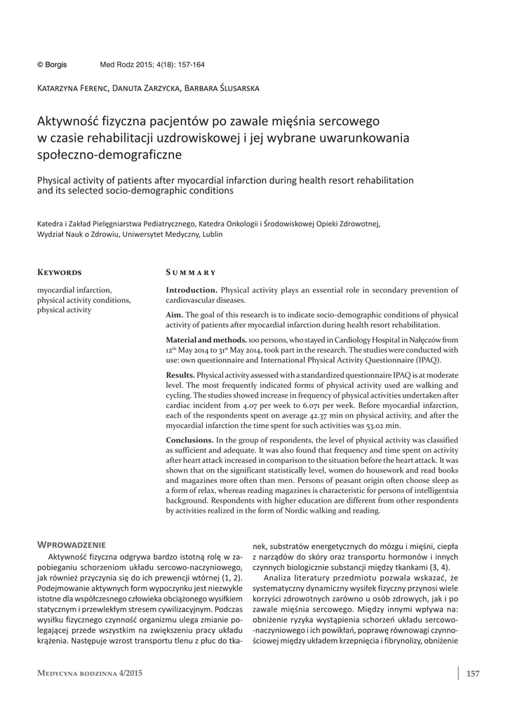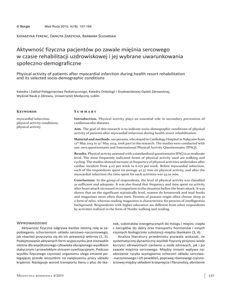 © Borgis Borgis Med Rodz 2015; 4(18): 157-164 Katarzyna Ferenc, Danuta Zarzycka, Barbara Ślusarska Aktywność fizyczna pacjentów po zawale mięśnia sercowego w czasie rehabilitacji uzdrowiskowej i jej wybrane uwarunkowania społeczno-demograficzne Physical activity of patients after myocardial infarction during health resort rehabilitation and its selected socio-demographic conditions Katedra i Zakład Pielęgniarstwa Pediatrycznego, Katedra Onkologii i Środowiskowej Opieki Zdrowotnej, Wydział Nauk o Zdrowiu, Uniwersytet Medyczny, Lublin Keywords Summary myocardial infarction, physical activity conditions, physical activity Introduction. Physical activity plays an essential role in secondary prevention of cardiovascular diseases. Aim. The goal of this research is to indicate socio-demographic conditions of physical activity of patients after myocardial infarction during health resort rehabilitation. Material and methods. 100 persons, who stayed in Cardiology Hospital in Nałęczów from 12th May 2014 to 31st May 2014, took part in the research. The studies were conducted with use: own questionnaire and International Physical Activity Questionnaire (IPAQ). Results. Physical activity assessed with a standardized questionnaire IPAQ is at moderate level. The most frequently indicated forms of physical activity used are walking and cycling. The studies showed increase in frequency of physical activities undertaken after cardiac incident from 4.07 per week to 6.071 per week. Before myocardial infarction, each of the respondents spent on average 42.37 min on physical activity, and after the myocardial infarction the time spent for such activities was 53.02 min. Conclusions. In the group of respondents, the level of physical activity was classified as sufficient and adequate. It was also found that frequency and time spent on activity after heart attack increased in comparison to the situation before the heart attack. It was shown that on the significant statistically level, women do housework and read books and magazines more often than men. Persons of peasant origin often choose sleep as a form of relax, whereas reading magazines is characteristic for persons of intelligentsia background. Respondents with higher education are different from other respondents by activities realized in the form of Nordic walking and reading. Wprowadzenie Aktywność fizyczna odgrywa bardzo istotną rolę w zapobieganiu schorzeniom układu sercowo-naczyniowego, jak również przyczynia się do ich prewencji wtórnej (1, 2). Podejmowanie aktywnych form wypoczynku jest niezwykle istotne dla współczesnego człowieka obciążonego wysiłkiem statycznym i przewlekłym stresem cywilizacyjnym. Podczas wysiłku fizycznego czynność organizmu ulega zmianie polegającej przede wszystkim na zwiększeniu pracy układu krążenia. Następuje wzrost transportu tlenu z płuc do tkaMedycyna rodzinna 4/2015 nek, substratów energetycznych do mózgu i mięśni, ciepła z narządów do skóry oraz transportu hormonów i innych czynnych biologicznie substancji między tkankami (3, 4). Analiza literatury przedmiotu pozwala wskazać, że systematyczny dynamiczny wysiłek fizyczny przynosi wiele korzyści zdrowotnych zarówno u osób zdrowych, jak i po zawale mięśnia sercowego. Między innymi wpływa na: obniżenie ryzyka wystąpienia schorzeń układu sercowo-naczyniowego i ich powikłań, poprawę równowagi czynnościowej między układem krzepnięcia i fibrynolizy, obniżenie 157 Katarzyna Ferenc, Danuta Zarzycka, Barbara Ślusarska ciśnienia tętniczego krwi (co stwarza możliwość lepszej kontroli ciśnienia tętniczego, zwłaszcza w przypadku jego dużych wartości), poprawienie funkcji sercowo-płucnych, zmniejszenie ryzyka zachorowania na cukrzycę typu 2, skuteczną kontrolę masy ciała i przeciwdziałanie otyłości, prewencję lub obniżenie hiperlipidemii, zmniejszenie prawdopodobieństwa wystąpienia niektórych nowotworów, m.in. raka piersi, prostaty, okrężnicy, poprawę funkcji trawiennych i jelitowych, zmniejszenie ryzyka wystąpienia osteoporozy i złamań, wzmocnienie siły mięśni oraz ich wytrzymałości, co przyczynia się do zwiększenia sprawności funkcjonalnej organizmu, poprawę/utrzymanie funkcji motorycznych oraz koordynacji ruchowej, obniżenie ryzyka wystąpienia depresji i/lub demencji, poprawę jakości snu oraz zmniejszenie stresu. Aktywność fizyczna może służyć jako metoda relaksacyjna, pomagająca odreagować sytuacje trudne, poprawiająca samopoczucie, poczucie własnej wartości, zmniejszająca ryzyko chorób w wieku starszym, a także upadków i zaburzeń funkcji poznawczych, opóźnienia procesu starzenia (5-8). W przypadku schorzeń kardiologicznych aktywność fizyczna dodatkowo przyczynia się do zminimalizowania progresji zmian patologicznych, polepszenia stanu krążenia obocznego, a także poprawy czynności śródbłonka naczyń krwionośnych oraz obniżenia ryzyka trombogennego, co stanowi o korzystnym wpływie na zmniejszenie częstości incydentów sercowych (9). Aktywność ruchowa wpływa także na obniżenie liczby zgonów zarówno przedwczesnych, jak i wskaźnika zgonów całkowitych (10, 11). Liczne wyniki badań jednoznacznie określają kierunek wpływu całkowitej aktywności fizycznej oraz ćwiczeń ruchowych, które przyczyniają się do istotnego zmniejszenia ryzyka chorób sercowo-naczyniowych (6, 11-14). Uwarunkowania aktywności fizycznej, zwłaszcza u osób po incydencie wieńcowym, są interesującym poznawczo i praktycznie zagadnieniem, gdyż poprzez stosowanie terapeutycznych zasad wysiłku fizycznego i aktywności można wpłynąć na objawy schorzenia, zwalniając jego przebieg, jak również śmiertelność z nim związaną, a ponadto jak wspomniano wcześniej, przyczynia się on do prewencji wtórnej zawału serca (1, 8). Na podstawie aktualnie dostępnych wyników badań można wyodrębnić grupy uwarunkowań dla aktywności fizycznej pacj