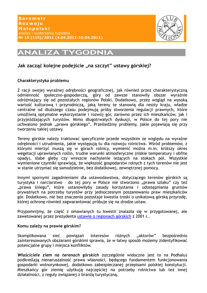 Barometr Rozwoju Małopolski analizy i wydarzenia tygodnia Nr 15 (115)/2011 (4.04.2011-10.04.2011) ANALIZA TYGODNIA IS Jak zacząć kolejne podejście „na szczyt” ustawy górskiej? Charakterystyka problemu Z racji swojej wyraźnej odrębności geograficznej, jak również przez charakterystyczną odmienność społeczno-gospodarczą, góry od zawsze stanowiły obszar wyraźnie odróżniający się od pozostałych regionów Polski. Dodatkowo, przez wzgląd na wysoką wartość kulturową i przyrodniczą, jaką tereny te stanowią dla reszty kraju, władze centralne od dłuższego czasu podejmują próby stworzenia regulacji prawnych, które umożliwią optymalne wykorzystanie i rozwój gór, zarówno przez ich mieszkańców, jak i przyjeżdżających turystów. Mimo długotrwałych dyskusji, w Polsce do tej pory nie uchwalono jednak „prawa górskiego”. Prześledźmy problemy, jakie pojawiają się przy tworzeniu takiej ustawy. Tereny górskie należy traktować specyficznie przede wszystkim ze względu na wyraźne odrębności i utrudnienia, jakie występują tu dla rozwoju rolnictwa. Wśród problemów, z którymi mierzyć muszą się w górach rolnicy, wymienić można m.in. krótszy okres wegetacji uprawianych roślin, trudne warunki atmosferyczne (niskie temperatury i obfite opady), słabe gleby czy wreszcie nachylenie leżących na stokach pól. Wszystkie wymienione czynniki sprawiają, że większość gospodarstw rolnych z tych terenów nie jest w stanie utrzymać się samodzielnie, bez dodatkowej, zewnętrznej pomocy. Innymi spornymi zagadnieniami dla ustawodawstwa, dotyczącego terenów górskich są turystyka i narciarstwo – do tej pory w Polsce nie stworzono „prawa szlaku” czy też „prawa śniegu”, które ustanowiłyby zasady korzystania i udostępniania gruntów prywatnych na potrzeby turystów przy jednoczesnym poszanowaniu praw mieszkańców gór. Dodatkowo, nie bez znaczenia pozostaje kwestia troski o unikatową górską przyrodę, której ochronę również zagwarantować próbuje się na drodze ustaw. Przypomnijmy, że część z omawianych tu kwestii znalazła się w przygotowanej, ale zawetowanej przez prezydenta ustawie o regionach górskich z 2001 r.. Komu zależy na prawie górskim? Skomplikowana sieć powiązań interesów różnych „aktorów” bezpośrednio zainteresowanych obszarami górskimi sprawia, że w łatwy sposób możemy zidentyfikować potencjalne grupy i miejsca konfliktów. Właściciele ziem na terenach górskich (szczególnie widoczne jest to na Podhalu) podkreślają nienaruszalność prawa własności, będącego fundamentem funkcjonowania gospodarki wolnorynkowej, dodatkowo zabezpieczanej przepisami polskiej konstytucji. Mieszkańcy gór ziemię użytkują najczęściej na potrzeby rolnictwa lub też innej działalności, z reguły związanej z branżą turystyczną. Barometr Rozwoju Małopolski analizy i wydarzenia tygodnia Nr 15 (115)/2011 (4.04.2011-10.04.2011) Z kolei „turyści”, „narciarze”, ludzie przebywający w górach rekreacyjnie, podkreślają prawo do powszechnego korzystania z unikatowych walorów przyrodniczo-kulturowych, jakie posiada region. Argument tej strony opiera się na traktowaniu obszarów górskich jako dobra przynależnego całemu narodowi, co pociąga za sobą postulat swobodnego korzystania z ich dobrodziejstw przez wszystkich. Jest też władza publiczna (w tym władza centralna i samorządowa), do obowiązku której należy traktowanie obszarów górskich jako dobra wspólnego. Władze, zapewniając odpowiednią ochronę środowisku naturalnemu, walorom krajobrazowym i dziedzictwu kulturowemu regionu, muszą zadbać zarówno o umożliwienie korzystania z terenów górskich wszystkich ludziom (obywatelom Polski i cudzoziemcom), jak i zagwarantować mieszkańcom gór ochronę podstawowych praw, które przysługują im m.in. na podstawie konstytucji RP. Ewentualna ustawa górska powinna proponować rozwiązania oparte o zasadę zaufania, gdyż tylko wtedy będą one do zaakceptowania przynajmniej przez demokratyczną większość. Jaka ustawa? Analiza sposobu podejścia do obszarów górskich, stanowiących ok. 8% powierzchni Polski, wymaga postawienia ważnego pytania: przedmiotem działania, którego szczebla polityki państwa powinny stać się obszary górskie? Z jednej strony aktywność gospodarcza i społeczna na tak znacznym obszarze państwa powinna zostać uregulowana na poziomie centralnym, z drugiej tereny górskie znajdują się na obszarach konkretnych województw i to ich władze powinny najlepiej wiedzieć, jakie działania należy podjąć, aby najpełniej wykorzystać potencjały rozwojowe regionu. Siłą rzeczy aktywność na obszarach górskich musi łączyć w sobie instrumenty właściwe dla polityki regionalnej, jak też dla szeregu polityk sektorowych. Pozostawienie działania na omawianych obszarach w domenie kompetencji regionalnych z aktywnym wsparciem państwa w przypadku współpracy makroregionalnej (kilku województw) wydaje się zatem słusznym rozwiązaniem. Warto w tym miejscu zauważyć inicjatywy podejmowane na tym polu już wcześniej – przyjęty w 1993 r. „Memoriał Górski” czy „Rezolucja Górska” z 1994 r., stanowią przykłady aktywnego udziału władz regionalnych w kształtowaniu „polityki górskiej”, która, w myśl wspomnianych dokumentów, opierać powinna się zarówno na działaniach na poziomie centralnym, jak i lokalnym. Kolejnym zagadnieniem, które wymaga rozstrzygnięcia jest pytanie o to, jak wysoko położone tereny możemy zaliczyć do omawianych obszarów. Pewne rozwiązanie w tej kwestii zaproponowano w aktualnym projekcie „Koncepcji Przestrzennego Zagospodarowania Kraju” (KPZK) z 25 stycznia br1. Obszary górskie znalazły się tam wśród obszarów szczególnego zjawiska w skali makroregionalnej, które z punktu widzenia przestrzeni oddziałują ponadlokalnie, a najczęściej ponadregionalnie. W KPZK proponuje 1 Kon