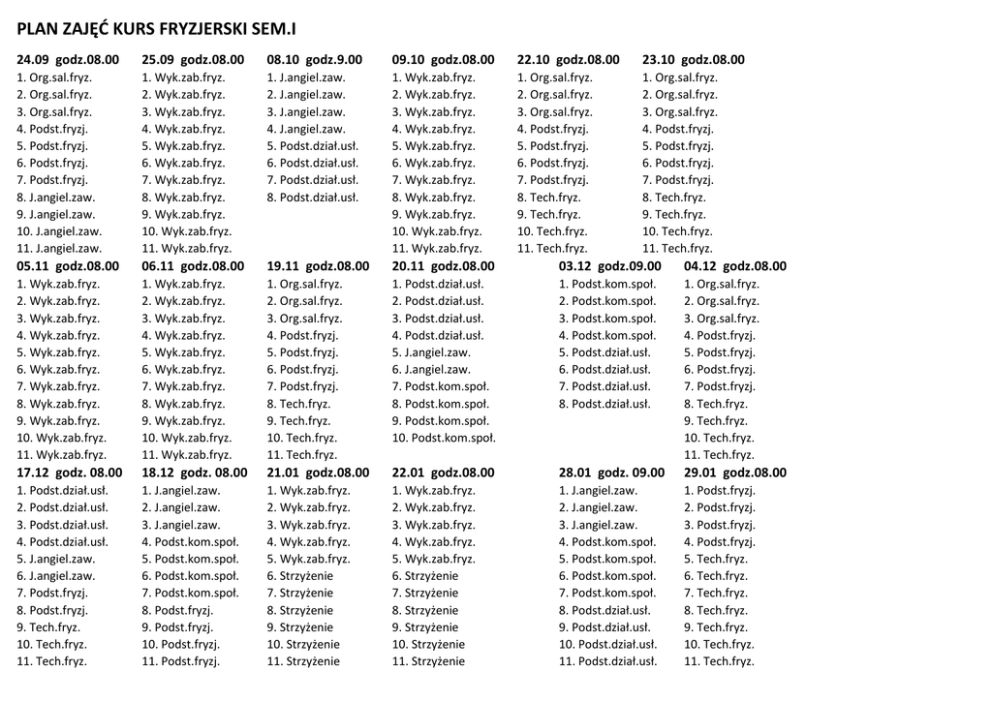 PLAN ZAJĘĆ KURS FRYZJERSKI SEM.I 24.09 godz.08.00 25.09 godz.08.00 08.10 godz.9.00 09.10 godz.08.00 22.10 godz.08.00 23.10 godz.08.00 1. Org.sal.fryz. 2. Org.sal.fryz. 3. Org.sal.fryz. 4. Podst.fryzj. 5. Podst.fryzj. 6. Podst.fryzj. 7. Podst.fryzj. 8. J.angiel.zaw. 9. J.angiel.zaw. 10. J.angiel.zaw. 11. J.angiel.zaw. 1. Wyk.zab.fryz. 2. Wyk.zab.fryz. 3. Wyk.zab.fryz. 4. Wyk.zab.fryz. 5. Wyk.zab.fryz. 6. Wyk.zab.fryz. 7. Wyk.zab.fryz. 8. Wyk.zab.fryz. 9. Wyk.zab.fryz. 10. Wyk.zab.fryz. 11. Wyk.zab.fryz. 1. J.angiel.zaw. 2. J.angiel.zaw. 3. J.angiel.zaw. 4. J.angiel.zaw. 5. Podst.dział.usł. 6. Podst.dział.usł. 7. Podst.dział.usł. 8. Podst.dział.usł. 1. Wyk.zab.fryz. 2. Wyk.zab.fryz. 3. Wyk.zab.fryz. 4. Wyk.zab.fryz. 5. Wyk.zab.fryz. 6. Wyk.zab.fryz. 7. Wyk.zab.fryz. 8. Wyk.zab.fryz. 9. Wyk.zab.fryz. 10. Wyk.zab.fryz. 11. Wyk.zab.fryz. 1. Org.sal.fryz. 2. Org.sal.fryz. 3. Org.sal.fryz. 4. Podst.fryzj. 5. Podst.fryzj. 6. Podst.fryzj. 7. Podst.fryzj. 8. Tech.fryz. 9. Tech.fryz. 10. Tech.fryz. 11. Tech.fryz. 1. Org.sal.fryz. 2. Org.sal.fryz. 3. Org.sal.fryz. 4. Podst.fryzj. 5. Podst.fryzj. 6. Podst.fryzj. 7. Podst.fryzj. 8. Tech.fryz. 9. Tech.fryz. 10. Tech.fryz. 11. Tech.fryz. 05.11 godz.08.00 06.11 godz.08.00 19.11 godz.08.00 20.11 godz.08.00 03.12 godz.09.00 04.12 godz.08.00 1. Wyk.zab.fryz. 2. Wyk.zab.fryz. 3. Wyk.zab.fryz. 4. Wyk.zab.fryz. 5. Wyk.zab.fryz. 6. Wyk.zab.fryz. 7. Wyk.zab.fryz. 8. Wyk.zab.fryz. 9. Wyk.zab.fryz. 10. Wyk.zab.fryz. 11. Wyk.zab.fryz. 1. Wyk.zab.fryz. 2. Wyk.zab.fryz. 3. Wyk.zab.fryz. 4. Wyk.zab.fryz. 5. Wyk.zab.fryz. 6. Wyk.zab.fryz. 7. Wyk.zab.fryz. 8. Wyk.zab.fryz. 9. Wyk.zab.fryz. 10. Wyk.zab.fryz. 11. Wyk.zab.fryz. 1. Org.sal.fryz. 2. Org.sal.fryz. 3. Org.sal.fryz. 4. Podst.fryzj. 5. Podst.fryzj. 6. Podst.fryzj. 7. Podst.fryzj. 8. Tech.fryz. 9. Tech.fryz. 10. Tech.fryz. 11. Tech.fryz. 1. Podst.dział.usł. 2. Podst.dział.usł. 3. Podst.dział.usł. 4. Podst.dział.usł. 5. J.angiel.zaw. 6. J.angiel.zaw. 7. Podst.kom.społ. 8. Podst.kom.społ. 9. Podst.kom.społ. 10. Podst.kom.społ. 1. Podst.kom.społ. 2. Podst.kom.społ. 3. Podst.kom.społ. 4. Podst.kom.społ. 5. Podst.dział.usł. 6. Podst.dział.usł. 7. Podst.dział.usł. 8. Podst.dział.usł. 1. Org.sal.fryz. 2. Org.sal.fryz. 3. Org.sal.fryz. 4. Podst.fryzj. 5. Podst.fryzj. 6. Podst.fryzj. 7. Podst.fryzj. 8. Tech.fryz. 9. Tech.fryz. 10. Tech.fryz. 11. Tech.fryz. 17.12 godz. 08.00 18.12 godz. 08.00 21.01 godz.08.00 22.01 godz.08.00 28.01 godz. 09.00 29.01 godz.08.00 1. Podst.dział.usł. 2. Podst.dział.usł. 3. Podst.dział.usł. 4. Podst.dział.usł. 5. J.angiel.zaw. 6. J.angiel.zaw. 7. Podst.fryzj. 8. Podst.fryzj. 9. Tech.fryz. 10. Tech.fryz. 11. Tech.fryz. 1. J.angiel.zaw. 2. J.angiel.zaw. 3. J.angiel.zaw. 4. Podst.kom.społ. 5. Podst.kom.społ. 6. Podst.kom.społ. 7. Podst.kom.społ. 8. Podst.fryzj. 9. Podst.fryzj. 10. Podst.fryzj. 11. Podst.fryzj. 1. Wyk.zab.fryz. 2. Wyk.zab.fryz. 3. Wyk.zab.fryz. 4. Wyk.zab.fryz. 5. Wyk.zab.fryz. 6. Strzyżenie 7. Strzyżenie 8. Strzyżenie 9. Strzyżenie 10. Strzyżenie 11. Strzyżenie 1. Wyk.zab.fryz. 2. Wyk.zab.fryz. 3. Wyk.zab.fryz. 4. Wyk.zab.fryz. 5. Wyk.zab.fryz. 6. Strzyżenie 7. Strzyżenie 8. Strzyżenie 9. Strzyżenie 10. Strzyżenie 11. Strzyżenie 1. J.angiel.zaw. 2. J.angiel.zaw. 3. J.angiel.zaw. 4. Podst.kom.społ. 5. Podst.kom.społ. 6. Podst.kom.społ. 7. Podst.kom.społ. 8. Podst.dział.usł. 9. Podst.dział.usł. 10. Podst.dział.usł. 11. Podst.dział.usł. 1. Podst.fryzj. 2. Podst.fryzj. 3. Podst.fryzj. 4. Podst.fryzj. 5. Tech.fryz. 6. Tech.fryz. 7. Tech.fryz. 8. Tech.fryz. 9. Tech.fryz. 10. Tech.fryz. 11. Tech.fryz.