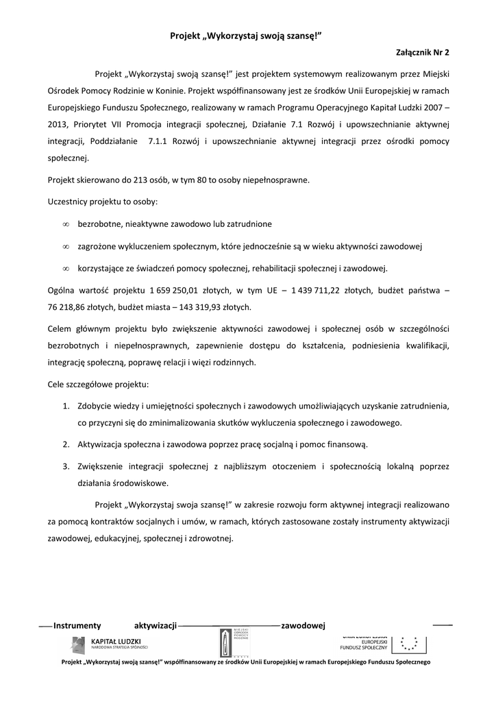 Projekt „Wykorzystaj swoją szansę!” Załącznik Nr 2 Projekt „Wykorzystaj swoją szansę!” jest projektem systemowym realizowanym przez Miejski Ośrodek Pomocy Rodzinie w Koninie. Projekt współfinansowany jest ze środków Unii Europejskiej w ramach Europejskiego Funduszu Społecznego, realizowany w ramach Programu Operacyjnego Kapitał Ludzki 2007 – 2013, Priorytet VII Promocja integracji społecznej, Działanie 7.1 Rozwój i upowszechnianie aktywnej integracji, Poddziałanie 7.1.1 Rozwój i upowszechnianie aktywnej integracji przez ośrodki pomocy społecznej. Projekt skierowano do 213 osób, w tym 80 to osoby niepełnosprawne. Uczestnicy projektu to osoby: • bezrobotne, nieaktywne zawodowo lub zatrudnione • zagrożone wykluczeniem społecznym, które jednocześnie są w wieku aktywności zawodowej • korzystające ze świadczeń pomocy społecznej, rehabilitacji społecznej i zawodowej. Ogólna wartość projektu 1 659 250,01 złotych, w tym UE – 1 439 711,22 złotych, budżet państwa – 76 218,86 złotych, budżet miasta – 143 319,93 złotych. Celem głównym projektu było zwiększenie aktywności zawodowej i społecznej osób w szczególności bezrobotnych i niepełnosprawnych, zapewnienie dostępu do kształcenia, podniesienia kwalifikacji, integrację społeczną, poprawę relacji i więzi rodzinnych. Cele szczegółowe projektu: 1. Zdobycie wiedzy i umiejętności społecznych i zawodowych umożliwiających uzyskanie zatrudnienia, co przyczyni się do zminimalizowania skutków wykluczenia społecznego i zawodowego. 2. Aktywizacja społeczna i zawodowa poprzez pracę socjalną i pomoc finansową. 3. Zwiększenie integracji społecznej z najbliższym otoczeniem i społecznością lokalną poprzez działania środowiskowe. Projekt „Wykorzystaj swoja szansę!” w zakresie rozwoju form aktywnej integracji realizowano za pomocą kontraktów socjalnych i umów, w ramach, których zastosowane zostały instrumenty aktywizacji zawodowej, edukacyjnej, społecznej i zdrowotnej. Instrumenty aktywizacji zawodowej Projekt „Wykorzystaj swoją szansę!” współfinansowany ze środków Unii Europejskiej w ramach Europejskiego Funduszu Społecznego Projekt „Wykorzystaj swoją szansę!” W ramach tego instrumentu odbiorcy projektu brali udział w zajęciach organizowanych w Klubie Integracji Społecznej i w Warsztatach Terapii Zajęciowej. Z proponowanych form wsparcia uczestnicy mieli możliwość skorzystania z takich zajęć jak: − Indywidualne poradnictwo zawodowe − Warsztat aktywnego poszukiwania pracy − Komunikacja interpersonalna w relacji dorosły – dziecko − Indywidualne porady prawne − Warsztat komunikacji i integracji − Warsztat zarządzania budżetem domowym − Warsztat umiejętności wychowawczych − Warsztat rozwijania i odkrywania swoich możliwości − Indywidualne porady psychologiczne i pedagogiczne − Zajęcia z podstaw informatyki − Zajęcia z muzykoterapii − Zajęcia z bajkoterapii Instrumenty aktywizacji edukacyjnej W ramach tego instrumentu jeden z uczestników kontynuował naukę w liceum ogólnokształcącym, i jedna uczestniczka kontynuowała naukę w policealnej szkole zawodowej. Ponadto zrealizowano kursy: − Kurs prawa jazdy kat. B /69 osób/ − Kurs prawa jazdy kat. C /7 osób/ − Kurs prawa jazdy kat. C+E /1 osoba/ − Kurs magazynier/ hurtownik /17 osób/ − Spawanie metodą TIG 141 – szkolenie podstawowe /11 osób/ − Operator koparko ładowarki w zakresie III. klasy uprawnień /2 osoby/ − Kurs kierowców wózków jezdniowych z napędem silnikowym /17 osób/ − Kurs sprzedawcy z obsługą kasy fiskalnej z fakturowaniem /48 osób/ − Kurs kucharza /16 osób/ − Kurs przedstawiciela handlowego /15 osób/ − Kurs j. niemieckiego w zakresie podstawowym /13 osób/ − Kurs j. angielskiego w zakresie podstawowym /14 osób/ − Kurs pracownika ds. kadrowych i płacowych /18 osób/ − Kurs opieki nad osobą starszą i niepełnosprawną /24 osób/ oraz warsztaty: Projekt „Wykorzystaj swoją szansę!” współfinansowany ze środków Unii Europejskiej w ramach Europejskiego Funduszu Społecznego Projekt „Wykorzystaj swoją szansę!” − Warsztat bukieciarstwa z elementami dekoracyjnymi /10 osób/ − Warsztat obsługi urządzeń biurowych /11 osób/ − Warsztat kulinarny /12 osób/ − Warsztat z podstaw pielęgnacji terenów zielonych i obsługi urządzeń ogrodniczych /11 osoby/ Instrumenty aktywizacji społecznej W ramach tego instrumentu: − 8 asystentów osoby niepełnosprawnej pomagało 18 uczestniczkom i uczestnikom projektu, jak również ich najbliższemu otoczeniu, w pełni korzystać z życia społecznego i wspierało w realizacji wspólnie wypracowanych celów zawartych w kontrakcie socjalnym bądź umowie. − 9 asystentów rodzinnych pomagało i wspierało 18 rodzin. Każdy asystent wsparciem objął 2 rodziny. Dodatkowo 3 wolontariuszy wspierało 3 rodziny w zakresie pomocy w nauce dzieciom i młodzieży. − Dwóch konsultantów ds. osób niepełnosprawnych prowadziło w ramach poradnictwa specjalistycznego usługi mi. in. w zakresie praw i obowiązków osób niepełnosprawnych; zmian w obowiązującym stanie prawnym; placówkach i organizacjach działających na rzecz osób niepełnosprawnych. − W Klubie Integracji Społecznej odbywały się zajęcia z zakresu reintegracji zawodowej i społecznej. Lider klubu prowadził i organizował działania mające na celu pobudzanie aktywności społecznej. − Uczestnicy projektu, którzy nie mogli zapewnić opieki swoim dzieciom w czasie udziału w warsztatach i szkoleniach mogli skorzystać ze wsparcia profesjonalnych osób w ramach zajęć edukacyjnych w miejscu zamieszkania. − Odbyły się trzy dwudniowe wyjazdy szkoleniowe – Trening kompetencji i umiejętności psychospołecznych dla rodzin zastępczych i mieszkańców mieszkań chronionych. W wyjazdach udział wzięli uczestnicy projektu wraz z najbliższym otoczeniem /członkow