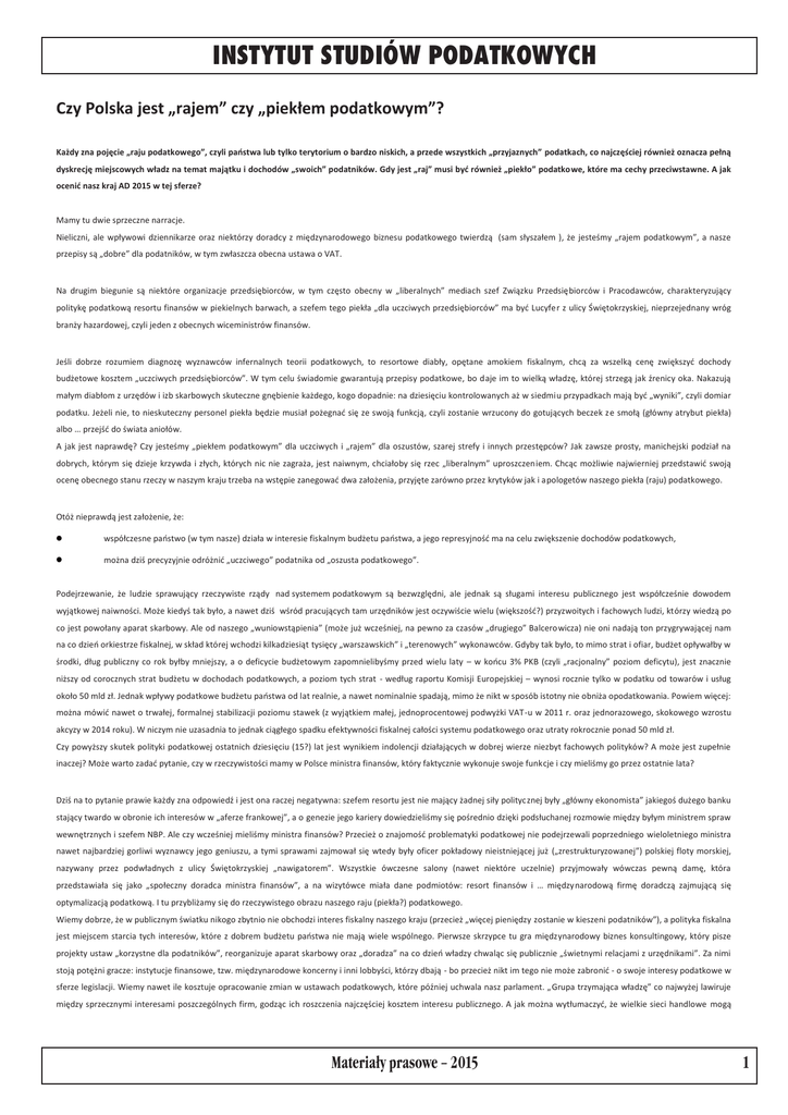 INSTYTUT STUDIÓW PODATKOWYCH Czy Polska jest „rajem” czy „piekłem podatkowym”? Każdy zna pojęcie „raju podatkowego”, czyli państwa lub tylko terytorium o bardzo niskich, a przede wszystkich „przyjaznych” podatkach, co najczęściej również oznacza pełną dyskrecję miejscowych władz na temat majątku i dochodów „swoich” podatników. Gdy jest „raj” musi być również „piekło” podatkowe, które ma cechy przeciwstawne. A jak ocenić nasz kraj AD 2015 w tej sferze? Mamy tu dwie sprzeczne narracje. Nieliczni, ale wpływowi dziennikarze oraz niektórzy doradcy z międzynarodowego biznesu podatkowego twierdzą (sam słyszałem ), że jesteśmy „rajem podatkowym”, a nasze przepisy są „dobre” dla podatników, w tym zwłaszcza obecna ustawa o VAT. Na drugim biegunie są niektóre organizacje przedsiębiorców, w tym często obecny w „liberalnych” mediach szef Związku Przedsiębiorców i Pracodawców, charakteryzujący politykę podatkową resortu finansów w piekielnych barwach, a szefem tego piekła „dla uczciwych przedsiębiorców” ma być Lucyfer z ulicy Świętokrzyskiej, nieprzejednany wróg branży hazardowej, czyli jeden z obecnych wiceministrów finansów. Jeśli dobrze rozumiem diagnozę wyznawców infernalnych teorii podatkowych, to resortowe diabły, opętane amokiem fiskalnym, chcą za wszelką cenę zwiększyć dochody budżetowe kosztem „uczciwych przedsiębiorców”. W tym celu świadomie gwarantują przepisy podatkowe, bo daje im to wielką władzę, której strzegą jak źrenicy oka. Nakazują małym diabłom z urzędów i izb skarbowych skuteczne gnębienie każdego, kogo dopadnie: na dziesięciu kontrolowanych aż w siedmiu przypadkach mają być „wyniki”, czyli domiar podatku. Jeżeli nie, to nieskuteczny personel piekła będzie musiał pożegnać się ze swoją funkcją, czyli zostanie wrzucony do gotujących beczek ze smołą (główny atrybut piekła) albo … przejść do świata aniołów. A jak jest naprawdę? Czy jesteśmy „piekłem podatkowym” dla uczciwych i „rajem” dla oszustów, szarej strefy i innych przestępców? Jak zawsze prosty, manichejski podział na dobrych, którym się dzieje krzywda i złych, których nic nie zagraża, jest naiwnym, chciałoby się rzec „liberalnym” uproszczeniem. Chcąc możliwie najwierniej przedstawić swoją ocenę obecnego stanu rzeczy w naszym kraju trzeba na wstępie zanegować dwa założenia, przyjęte zarówno przez krytyków jak i apologetów naszego piekła (raju) podatkowego. Otóż nieprawdą jest założenie, że: współczesne państwo (w tym nasze) działa w interesie fiskalnym budżetu państwa, a jego represyjność ma na celu zwiększenie dochodów podatkowych, można dziś precyzyjnie odróżnić „uczciwego” podatnika od „oszusta podatkowego”. Podejrzewanie, że ludzie sprawujący rzeczywiste rządy nad systemem podatkowym są bezwzględni, ale jednak są sługami interesu publicznego jest współcześnie dowodem wyjątkowej naiwności. Może kiedyś tak było, a nawet dziś wśród pracujących tam urzędników jest oczywiście wielu (większość?) przyzwoitych i fachowych ludzi, którzy wiedzą po co jest powołany aparat skarbowy. Ale od naszego „wuniowstąpienia” (może już wcześniej, na pewno za czasów „drugiego” Balcerowicza) nie oni nadają ton przygrywającej nam na co dzień orkiestrze fiskalnej, w skład której wchodzi kilkadziesiąt tysięcy „warszawskich” i „terenowych” wykonawców. Gdyby tak było, to mimo strat i ofiar, budżet opływałby w środki, dług publiczny co rok byłby mniejszy, a o deficycie budżetowym zapomnielibyśmy przed wielu laty – w końcu 3% PKB (czyli „racjonalny” poziom deficytu), jest znacznie niższy od corocznych strat budżetu w dochodach podatkowych, a poziom tych strat - według raportu Komisji Europejskiej – wynosi rocznie tylko w podatku od towarów i usług około 50 mld zł. Jednak wpływy podatkowe budżetu państwa od lat realnie, a nawet nominalnie spadają, mimo że nikt w sposób istotny nie obniża opodatkowania. Powiem więcej: można mówić nawet o trwałej, formalnej stabilizacji poziomu stawek (z wyjątkiem małej, jednoprocentowej podwyżki VAT-u w 2011 r. oraz jednorazowego, skokowego wzrostu akcyzy w 2014 roku). W niczym nie uzasadnia to jednak ciągłego spadku efektywności fiskalnej całości systemu podatkowego oraz utraty rokrocznie ponad 50 mld zł. Czy powyższy skutek polityki podatkowej ostatnich dziesięciu (15?) lat jest wynikiem indolencji działających w dobrej wierze niezbyt fachowych polityków? A może jest zupełnie inaczej? Może warto zadać pytanie, czy w rzeczywistości mamy w Polsce ministra finansów, który faktycznie wykonuje swoje funkcje i czy mieliśmy go przez ostatnie lata? Dziś na to pytanie prawie każdy zna odpowiedź i jest ona raczej negatywna: szefem resortu jest nie mający żadnej siły politycznej były „główny ekonomista” jakiegoś dużego banku stający twardo w obronie ich interesów w „aferze frankowej”, a o genezie jego kariery dowiedzieliśmy się pośrednio dzięki podsłuchanej rozmowie między byłym ministrem spraw wewnętrznych i szefem NBP. Ale czy wcześniej mieliśmy ministra finansów? Przecież o znajomość problematyki podatkowej nie podejrzewali poprzedniego wieloletniego ministra nawet najbardziej gorliwi wyznawcy jego geniuszu, a tymi sprawami zajmował się wtedy były oficer pokładowy nieistniejącej już („zrestrukturyzowanej”) polskiej floty morskiej, nazywany przez podwładnych z ulicy Świętokrzyskiej „nawigatorem”. Wszystkie ówczesne salony (nawet niektóre uczelnie) przyjmowały wówczas pewną damę, która przedstawiała się jako „społeczny doradca ministra finansów”, a na wizytówce miała dane podmiotów: resort finansów i … międzynarodową firmę doradczą zajmującą się optymalizacją podatkową. I tu przybliżamy się do rzeczywistego o