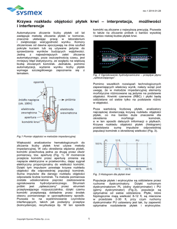 rev.1 2014-01-28 Krzywa rozkładu objętości płytek krwi – interpretacja, i interferencje możliwości komórki są zliczane z najwyższą precyzją. Pozwala to także na zliczanie próbek o bardzo wysokiej i bardzo niskiej liczbie płytek krwi. Automatyczne zliczenie liczby płytek od lat zastępuje metodę zliczania płytek w komorze, znacznie ułatwiając pracę w laboratorium i zwiększając wiarygodność wyniku. Komory zliczeniowe od dawna spoczywają na dnie szuflad pokryte kurzem lub są używane jedynie do sprawdzenia wyników budzących wątpliwości. Jedną z najważniejszych zalet zliczania automatycznego, poza oszczędnością czasu, jest mniejszy błąd statystyczny, ze względu na większą liczbę zliczanych komórek. Jednakże, pomimo automatyzacji, wydanie wyniku liczby płytek wymaga szczegółowego zapoznania się z tematem. Fig. 2 Ogniskowanie hydrodynamiczne – przepływ płynu „opłaszczającego”. Pomimo wszelkich rozwiązań technologicznych zapewniających właściwy wynik, należy wziąć pod uwagę, że w metodzie impedancyjnej elementy morfotyczne różnicowane są jedynie na podstawie objętości. Krwinki czerwone (RBC) i płytki będą oddzielane od siebie tylko na podstawie różnic w objętości. Poza wartością liczbową płytek, analizatory najczęściej dostarczają krzywą rozkładu objętości płytek, co ma bardzo duże znaczenie dla określenia morfologii komórek, a w ten sposób dalszych informacji o płytkach. Krzywa rozkładu objętości płytek (histogram) przedstawia sumę impulsów odpowiedniej populacji komórek o określonej wielkości (Fig. 3). Fig.1 Pomiar objętości w metodzie impedancyjnej Większość analizatorów hematologicznych do zliczania liczby płytek krwi używa metody impedancyjnej. W celu określenia stężenia płytek, komórki przechodzą jedna za drugą przez otwór pomiarowy, tzw. aperturę (Fig. 1). W momencie przejścia komórki przez aperturę zmienia się napięcie elektryczne w przetworniku, dając sygnał elektryczny proporcjonalny do wielkości komórki. Dzięki tym impulsom powstaje krzywa rozkładu objętości dla odpowiedniej populacji komórek. Suma impulsów dla danego rozkładu objętości odpowiada liczbie komórek. Ta metoda pomiarowa została udoskonalona poprzez zastosowanie ogniskowania hydrodynamicznego. Strumień próbki jest „opłaszczany” przez strumień przepływającego rozpuszczalnika, dzięki czemu komórki przepływają dokładnie przez środek otworu pomiarowego w uporządkowany sposób. Pozwala to na wyeliminowanie czynników interferujących, takich jak podwójny przepływ (koincydencja), recyrkulacja itp. W ten sposób Copyright Sysmex Polska Sp. z o.o. Fig. 3 Histogram dla płytek krwi Populacje płytek i erytrocytów są oddzielane przez ruchome dyskryminatory. Dzięki ruchomym dyskryminatorom PL (dolny dyskryminator) i PU (górny dyskryminator) (Fig.3), populacje są optymalnie od siebie oddzielone. Płytki, które fizjologicznie mają wielkość 8-12 fl, są mierzone w przedziale 2-30 fl, przy czym ruchomy dyskryminator PU ustawiany jest tak, by zapewnić optymalne rozdzielenie płytek i erytrocytów. 1 rev.1 2014-01-28 Erytrocyty fizjologicznie mają wielkość 80-100 fl i są zliczane w przedziale od 25 fl do 250 fl. W związku z tymi procedurami, na analizatorach hematologicznych podczas analizy niektórych próbek mogą wystąpić błędy. Płytki o objętości większej niż 30 fl lub krwinki czerwone o objętości mniejszej niż 25 fl mogą fałszować wynik. Również inne, bardzo małe cząsteczki, takie jak fragmenty cytoplazmy mogą być mylnie liczone jako płytki. Czynnikami najczęściej interferującymi są płytki olbrzymie i fragmentocyty, ale mikrocyty i agregaty płytkowe również odpowiadają za błędne wyniki. Immunologiczne znakowanie płytek specyficznymi przeciwciałami monoklonalnymi jest dobrym sposobem ustalenia liczby płytek. Niestety jest to metoda bardzo kosztowna i nie zawsze odpowiednia do rutynowej pracy. Inną alternatywą dla ustalenia liczby płytek jest wybarwienie RNA trombocytów przy użyciu barwnika fluorescencyjnego. RNA płytek wybarwi się i w oparciu o aktywność fluorescencyjną oraz objętość komórki, właściwa liczba płytek, włącznie z płytkami olbrzymimi, zostanie ustalona automatycznie. Większość analizatorów Sysmex jest wyposażonych w metodę barwienia RNA płytek i w przypadku interferencji przełącza się na metodę fluorescencyjną, dzięki zastosowaniu odpowiedniego algorytmu. W takich przypadkach samo różnicowanie na podstawie objętości może nie być wystarczające dla jednoznacznego ustalenia liczby komórek i konieczne jest zweryfikowanie wyniku. Ze względu na objętość powyżej 30 fl płytki olbrzymie liczone są jako erytrocyty. Pod mikroskopem jest widoczna znaczna anizocytoza płytek, z płytkami osiągającymi rozmiary krwinek czerwonych. Większe agregaty płytkowe mogą być nawet mylnie liczone jako erytrocyty, podczas gdy luźne agregaty płytkowe rozpadają się w trakcie przepływu hydrodynamicznego. Odwrotnie natomiast, fragmentocyty i mikrocyty są zliczane jako płytki krwi. Parametry ułatwiające interpretację histogramu: Oprócz oceny histogramu istnieją jeszcze dodatkowe parametry, takie jak P-LCR, MPV, PDW i PCT dostarczające różnych informacji na temat morfologii płytek. P-LCR (wskaźnik obecności dużych płytek) P-LCR wskazuje procent dużych płytek, o objętości powyżej 12 fl. Oprócz dwóch ruchomych dyskryminatorów ograniczających krzywą rozkładu objętości płytek, istnieje jeszcze dodatkowy, stały dyskryminator o wartości 12 fl (Fig. 4). Udział płytek powyżej 12 fl w całkowitej liczbie płytek jest wyrażony procentowo. Przedział wartości referencyjnych dla tego parametru to 15-35%. Wzrost tego parametru może wskazywać na obecność agregatów płytkowych, mikrocytów i płytek olbrzymich. Jednakże we wszystkich tych przypadkach możliwe 