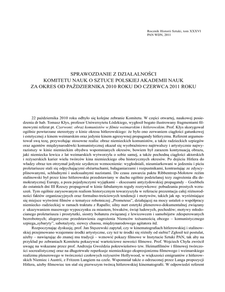 173 Rocznik Historii Sztuki, tom XXXVI PAN WDN, 2011 SPRAWOZDANIE Z DZIAŁALNOŚCI KOMITETU NAUK O SZTUCE POLSKIEJ AKADEMII NAUK ZA OKRES OD PAŹDZIERNIKA 2010 ROKU DO CZERWCA 2011 ROKU 22 października 2010 roku odbyło się kolejne zebranie Komitetu. W części otwartej, naukowej posiedzenia dr hab. Tomasz Kłys, profesor Uniwersytetu Łódzkiego, wygłosił bogato ilustrowany fragmentami filmowymi referat pt. Czerwoni: obraz komunistów w filmie weimarskim i hitlerowskim. Prof. Kłys skorygował ogólnie powtarzane stereotypy o kinie okresu hitlerowskiego: że było ono zerwaniem ciągłości gatunkowej i estetycznej z kinem weimarskim oraz jedynie kinem agresywnej propagandy hitleryzmu. Referent argumentował swą tezę, przywołując stosowne realia: obraz niemieckich komunistów, a także radzieckich szpiegów oraz agentów międzynarodówki komunistycznej okazał się wyobraźniowo najtrwalszy i artystycznie najwyrazistszy w kinie niemieckim obydwu wspomnianych okresów, bowiem był zarazem kontynuacją obrazu, jaki niemiecka lewica z lat weimarskich wytworzyła o sobie samej, a także pochodną ciągłości aktorskich i reżyserskich karier wielu twórców kina niemieckiego obu historycznych okresów. Po dojściu Hitlera do władzy obraz ten otrzymał jedynie szydercze wzmocnienie: wygłodniali, nieumiarkowani w jedzeniu i piciu proletariusze stali się odpychającymi obżartuchami, bałaganiarzami i rozpustnikami, kontrastując ze zdyscyplinowanymi, schludnymi i aseksualnymi nazistami. Do czasu zawarcia paktu Ribbentrop-Mołotow reżim stalinowski był przez kino hitlerowskie przedstawiany w duchu ogólnie podzielanej tezy zagrożenia dla demokratycznej Europy, a poza pojedynczymi wyjątkami – ekscesami antyżydowskiej propagandy – Goebbels do ostatnich dni III Rzeszy propagował w kinie fabularnym reguły rozrywkowe: pobudzania prostych wzruszeń. Tym ogólnie zarysowanym realiom historycznym towarzyszyła w referacie prezentacja całej różnorodności faktów organizacyjnych oraz formalno-treściowych tendencji i motywów, takich jak np. wyróżniające się miejsce wytwórni filmów o tematyce robotniczej „Prometeus”, działającej na mocy ustaleń o współpracy niemiecko–radzieckiej w ramach traktatu z Rapallo; silny nurt estetyki plenerowo-dokumentalnej związany z ukazywaniem masowego wypoczynku za miastem, biwaków, świąt ludowych, pochodów; motywy młodocianego proletariusza i prostytutki, siostry bohatera związanej z lewicowcem i samobójstw zdesperowanych bezrobotnych; alegoryczne przedstawienia zagrożenia Niemców tożsamością obcego – komunistycznego szpiega„sybaryty”, sabotażysty, siewcy chaosu, międzynarodowego agitatora itd. Rozpoczynając dyskusję, prof. Jan Stęszewski zapytał, czy w kinematografiach hitlerowskiej i stalinowskiej przejmowano wzajemnie środki artystyczne, czy też te środki się różniły od siebie? Zgłosił też postulat, ażeby – nawiązując do znanej mu tradycji – wznowić pokazy filmowe w Instytucie Sztuki PAN, tak aby na przykład po zebraniach Komitetu pokazywać wartościowe nowości filmowe. Prof. Wojciech Chyła zwrócił uwagę na wskazane przez prof. Andrzeja Gwoździa pokrewieństwo tzw. Heimatfilmów i filmowej twórczości socrealistycznej oraz na długotrwałe reperkusje niemieckiego ekspresjonizmu filmowego i weimarskiego realizmu plenerowego w twórczości czołowych reżyserów Hollywood, w większości emigrantów z hitlerowskich Niemiec i Austrii, z Fritzem Langiem na czele. Wspomniał także o odrzuconej przez Langa propozycji Hitlera, ażeby filmowiec ten stał się pierwszym twórcą hitlerowskiej kinematografii. W odpowiedzi referent 174 SPRAWOZDANIE Z DZIAŁALNOŚCI KOMITETU NAUK O SZTUCE POLSKIEJ AKADEMII NAUK przypomniał o stylistycznych analogiach bawarskich Heimtfilmów z radzieckimi filmami socrealistycznymi, uczynił jednak zastrzeżenie, że w socrealizmie obowiązywał bezpośredni dydaktyzm i, by tak rzec, „propaganda leżała [w nim] na wierzchu”. Historycznie rzecz ujmując, w ZSRR po Dezerterze Pudowkina – dziele o dużych komplikacjach formalnych – nastąpiła zarządzona przez Stalina zmiana estetyki: wprowadzenie socrealistycznej doktryny twórczej; natomiast w Niemczech filmy hitlerowskie kontynuują weimarską estetykę neue Sachlichkeit. Hitlerowskie Niemcy porzucają wątek brechtowski (notabene także nacechowany formalną komplikacją), natomiast świetnie rozwijają się w tym czasie w Rzeszy komedie. Prof. Kłys przypomniał też, że na przykład z Kuhle Wampe Slatana Dudowa zapożyczano w okresie hitlerowskim obrazowanie, ale nie dialektyczną strukturę narracyjną, do której dopiero po latach nawiązał Rainer Werner Fassbinder. Przejmując z epoki weimarskiej realizm inscenizacyjny, kino hitlerowskie przejęło też metonimię i synekdochę właściwą szkole montażu. Ogólnie mówiąc, Goebbels postanowił, że „brązowe koszule niech sobie będą na ulicach, ale nie na ekranach” i postawił wyraźnie na kino rozrywkowe, krzewiące na świecie pozytywny obraz Niemiec. Kino, które „rozumie swoją nordycką tożsamość”, ale nie uprawia natrętnej propagandy, wyraźnie mami za to swoją rozrywkową atrakcyjnością. Goebbels ostro oddzielał kino fabularne i dokumentalne: w tym pierwszym – „uniwersalnym” – nie chciał w zasadzie propagandy, zaś w tym drugim – na „rynek wewnętrzny” – uprawiał agresywną propagandę. Prof. Tadeusz Szczepański wskazał na odmienność propagandy ZSRR i Niemiec hitlerowskich: o ile w Kraju Rad była to prosta dydaktyczna propaganda skrojona na użytek ciemnych mas, o tyle naziści uprawiali napastliwą propagandę o pseudonaukowej retoryce i argumentacji, które przykrawano do drobnomieszczańskiego gustu. Wskazał też, za Iwoną Sowińską, autorką artykułu na temat kina proletariackiego Republiki Weimarskiej, że socjaldemokrację uczynili naziści i komuniści wspólnym wrogiem, kry