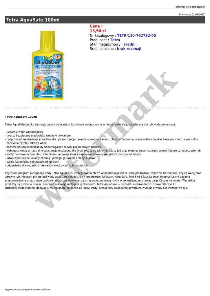 Informacje o produkcie Utworzono 02-03-2017 Tetra AquaSafe 100ml Cena : 13,50 zł Tetra AquaSafe 100ml er m ar k Nr katalogowy : TETR/110-762732-00 Producent : Tetra Stan magazynowy : średni Średnia ocena : brak recenzji Tetra AquaSafe szybko się rozpuszcza i błyskawicznie zmienia wodę z kranu w niemal naturalną, bezpieczną dla ryb wodę akwariową. at - uzdatnia wodę wodociągową - tworzy bezpieczne środowisko wodne w akwarium - natychmiast neutralizuje szkodliwe dla ryb substancje zawarte w wodzie z kranu: chlor i chloraminę, wiąże metale ciężkie, takie jak miedź, cynk i ołów - zapewnia czystą i zdrową wodę - zawiera naturalne biolokoidy wspomagające rozwój pożytecznych bakterii - wzbogaca wodę w naturalne substancje niezbędne dla życia ryb, takie jak witalizujący jod oraz magnez wspomagający wzrost i dobre samopoczucie ryb - zoptymalizowana formuła z witaminami redukuje stres i wspomaga zdrowie wszystkich ryb zimnolubnych - łatwo wyczuwalne koloidy chronią i pielęgnują skrzela i błony śluzowe - działa już po kilku sekundach od aplikacji - odpowiedni dla wszystkich akwariów słodkowodnych i morskich w Czy znasz program pielęgnacji wody Tetra AquaCare? Zintegrowana oferta współdziałających ze sobą produktów, zapewnia bezpieczną, czystą wodę oraz zdrowie ryb. Program pielęgnacji wody AquaCare składa się z 4 produktów: SafeStart, AquaSafe, Test 6w1 i EasyBalance. Rygorystyczne badania przeprowadzone przez nasze czołowe laboratoria dowiodły, że utrzymują one wodę i ryby w jak najlepszym stanie, dając Ci czas na relaks. Wszystkie produkty są proste w użyciu i znacznie ułatwiają pielęgnację akwarium. Tetra AquaCare — prostota, niezawodność i znakomite wyniki! Uzdatniaj wodę z kranu, dodając 5 ml AquaSafe na każde 10 litrów wody. Stosuj przy zakładaniu akwarium, wymianie wody lub transporcie ryb. Wygenerowano w programie www.oscGold.com