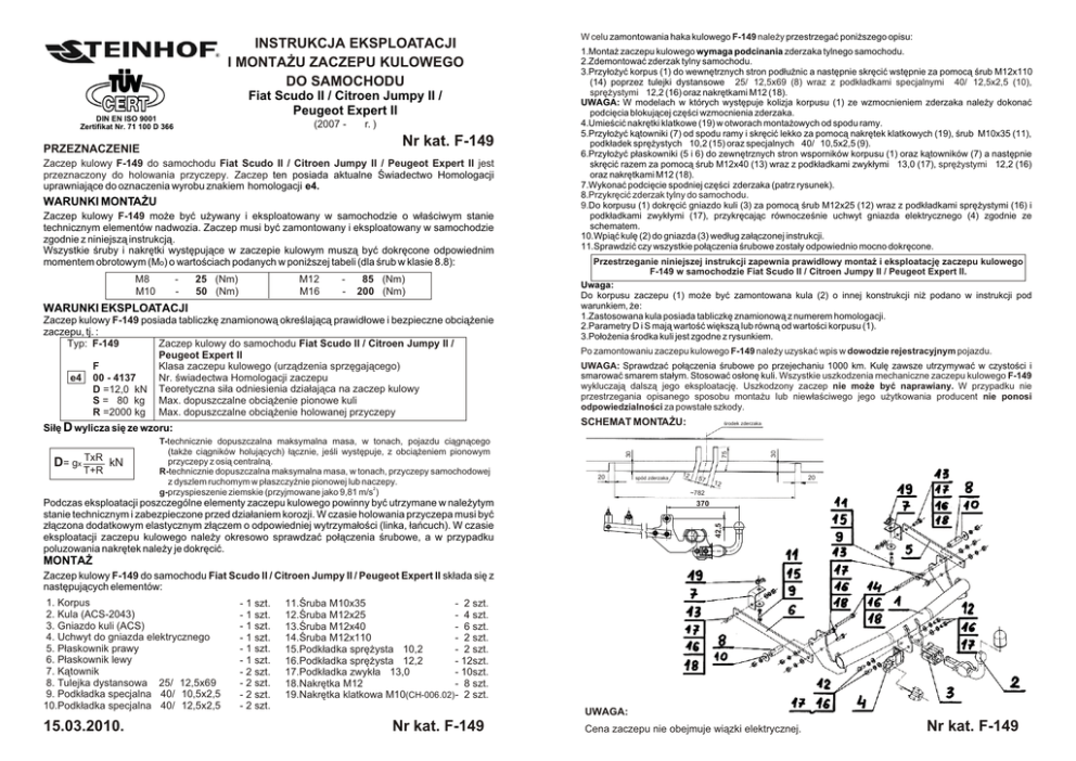 Fiat Scudo II / Citroen Jumpy II / Peugeot Expert II (2007 - ® r. ) Nr kat. F-149 PRZEZNACZENIE Zaczep kulowy F-149 do samochodu Fiat Scudo II / Citroen Jumpy II / Peugeot Expert II jest przeznaczony do holowania przyczepy. Zaczep ten posiada aktualne Œwiadectwo Homologacji uprawniaj¹ce do oznaczenia wyrobu znakiem homologacji e4. WARUNKI MONTA¯U Zaczep kulowy F-149 mo¿e byæ u¿ywany i eksploatowany w samochodzie o w³aœciwym stanie technicznym elementów nadwozia. Zaczep musi byæ zamontowany i eksploatowany w samochodzie zgodnie z niniejsz¹ instrukcj¹. Wszystkie œruby i nakrêtki wystêpuj¹ce w zaczepie kulowym musz¹ byæ dokrêcone odpowiednim momentem obrotowym (Mo) o wartoœciach podanych w poni¿szej tabeli (dla œrub w klasie 8.8): - 25 (Nm) 50 (Nm) M12 M16 - 85 (Nm) 200 (Nm) WARUNKI EKSPLOATACJI Zaczep kulowy F-149 posiada tabliczkê znamionow¹ okreœlaj¹c¹ prawid³owe i bezpieczne obci¹¿enie zaczepu, tj. : Zaczep kulowy do samochodu Fiat Scudo II / Citroen Jumpy II / Typ: F-149 Peugeot Expert II Klasa zaczepu kulowego (urz¹dzenia sprzêgaj¹cego) F Nr. œwiadectwa Homologacji zaczepu e4 00 - 4137 D =12,0 kN Teoretyczna si³a odniesienia dzia³aj¹ca na zaczep kulowy S = 80 kg Max. dopuszczalne obci¹¿enie pionowe kuli R =2000 kg Max. dopuszczalne obci¹¿enie holowanej przyczepy SCHEMAT MONTA¯U: Si³ê D wylicza siê ze wzoru: D= gx TxR kN T+R Po zamontowaniu zaczepu kulowego F-149 nale¿y uzyskaæ wpis w dowodzie rejestracyjnym pojazdu. UWAGA: Sprawdzaæ po³¹czenia œrubowe po przejechaniu 1000 km. Kulê zawsze utrzymywaæ w czystoœci i smarowaæ smarem sta³ym. Stosowaæ os³onê kuli. Wszystkie uszkodzenia mechaniczne zaczepu kulowego F-149 wykluczaj¹ dalsz¹ jego eksploatacjê. Uszkodzony zaczep nie mo¿e byæ naprawiany. W przypadku nie przestrzegania opisanego sposobu monta¿u lub niew³aœciwego jego u¿ytkowania producent nie ponosi odpowiedzialnoœci za powsta³e szkody. T-technicznie dopuszczalna maksymalna masa, w tonach, pojazdu ci¹gn¹cego (tak¿e ci¹gników holuj¹cych) ³¹cznie, jeœli wystêpuje, z obci¹¿eniem pionowym przyczepy z osi¹ centraln¹. R-technicznie dopuszczalna maksymalna masa, w tonach, przyczepy samochodowej z dyszlem ruchomym w p³aszczyŸnie pionowej lub naczepy. g-przyspieszenie ziemskie (przyjmowane jako 9,81 m/s2) œrodek zderzaka 20 75 M8 M10 Przestrzeganie niniejszej instrukcji zapewnia prawid³owy monta¿ i eksploatacjê zaczepu kulowego F-149 w samochodzie Fiat Scudo II / Citroen Jumpy II / Peugeot Expert II. Uwaga: Do korpusu zaczepu (1) mo¿e byæ zamontowana kula (2) o innej konstrukcji ni¿ podano w instrukcji pod warunkiem, ¿e: 1.Zastosowana kula posiada tabliczkê znamionow¹ z numerem homologacji. 2.Parametry D i S maj¹ wartoœæ wiêksz¹ lub równ¹ od wartoœci korpusu (1). 3.Po³o¿enia œrodka kuli jest zgodne z rysunkiem. 30 DIN EN ISO 9001 Zertifikat Nr. 71 100 D 366 W celu zamontowania haka kulowego F-149 nale¿y przestrzegaæ poni¿szego opisu: 1.Monta¿ zaczepu kulowego wymaga podcinania zderzaka tylnego samochodu. 2.Zdemontowaæ zderzak tylny samochodu. 3.Przy³o¿yæ korpus (1) do wewnêtrznych stron pod³u¿nic a nastêpnie skrêciæ wstêpnie za pomoc¹ œrub M12x110 (14) poprzez tulejki dystansowe Ø25/Ø12,5x69 (8) wraz z podk³adkami specjalnymi Ø40/Ø12,5x2,5 (10), sprê¿ystymi Ø12,2 (16) oraz nakrêtkami M12 (18). UWAGA: W modelach w których wystêpuje kolizja korpusu (1) ze wzmocnieniem zderzaka nale¿y dokonaæ podciêcia blokuj¹cej czêœci wzmocnienia zderzaka. 4.Umieœciæ nakrêtki klatkowe (19) w otworach monta¿owych od spodu ramy. 5.Przy³o¿yæ k¹towniki (7) od spodu ramy i skrêciæ lekko za pomoc¹ nakrêtek klatkowych (19), œrub M10x35 (11), podk³adek sprê¿ystych Ø10,2 (15) oraz specjalnych Ø40/Ø10,5x2,5 (9). 6.Przy³o¿yæ p³askowniki (5 i 6) do zewnêtrznych stron wsporników korpusu (1) oraz k¹towników (7) a nastêpnie skrêciæ razem za pomoc¹ œrub M12x40 (13) wraz z podk³adkami zwyk³ymi Ø13,0 (17), sprê¿ystymi Ø12,2 (16) oraz nakrêtkami M12 (18). 7.Wykonaæ podciêcie spodniej czêœci zderzaka (patrz rysunek). 8.Przykrêciæ zderzak tylny do samochodu. 9.Do korpusu (1) dokrêciæ gniazdo kuli (3) za pomoc¹ œrub M12x25 (12) wraz z podk³adkami sprê¿ystymi (16) i podk³adkami zwyk³ymi (17), przykrêcaj¹c równoczeœnie uchwyt gniazda elektrycznego (4) zgodnie ze schematem. 10.Wpi¹æ kulê (2) do gniazda (3) wed³ug za³¹czonej instrukcji. 11.Sprawdziæ czy wszystkie po³¹czenia œrubowe zosta³y odpowiednio mocno dokrêcone. spód zderzaka 12 57 30 INSTRUKCJA EKSPLOATACJI I MONTA¯U ZACZEPU KULOWEGO DO SAMOCHODU 12 20 ~782 Podczas eksploatacji poszczególne elementy zaczepu kulowego powinny byæ utrzymane w nale¿ytym stanie technicznym i zabezpieczone przed dzia³aniem korozji. W czasie holowania przyczepa musi byæ z³¹czona dodatkowym elastycznym z³¹czem o odpowiedniej wytrzyma³oœci (linka, ³añcuch). W czasie eksploatacji zaczepu kulowego nale¿y okresowo sprawdzaæ po³¹czenia œrubowe, a w przypadku poluzowania nakrêtek nale¿y je dokrêciæ. 42,5 42,5 370 370 MONTA¯ Zaczep kulowy F-149 do samochodu Fiat Scudo II / Citroen Jumpy II / Peugeot Expert II sk³ada siê z nastêpuj¹cych elementów: 1. Korpus 2. Kula (ACS-2043) 3. Gniazdo kuli (ACS) 4. Uchwyt do gniazda elektrycznego 5. P³askownik prawy 6. P³askownik lewy 7. K¹townik 8. Tulejka dystansowa Ø25/Ø12,5x69 9. Podk³adka specjalna Ø40/Ø10,5x2,5 10.Podk³adka specjalna Ø40/Ø12,5x2,5 15.03.2010. - 1 szt. - 1 szt. - 1 szt. - 1 szt. - 1 szt. - 1 szt. - 2 szt. - 2 szt. - 2 szt. - 2 szt. 11.Œruba M10x35 - 2 szt. 12.Œruba M12x25 - 4 szt. 13.Œruba M12x40 - 6 szt. 14.Œruba M12x110 - 2 szt. 15.Podk³adka sprê¿ysta Ø10,2 - 2 szt. - 12szt. 16.Podk³adka sprê¿ysta Ø12,2 - 10szt. 17.Podk³adka zwyk³a Ø13,0 - 8 szt. 18.Nakrêtka M12 19.Nakrêtka klatkowa M10(CH-006.02) - 2 szt. UWAGA: Nr kat. F-149 Cena zaczepu nie obejmuje wi¹zki elektrycznej. Nr kat. F-1