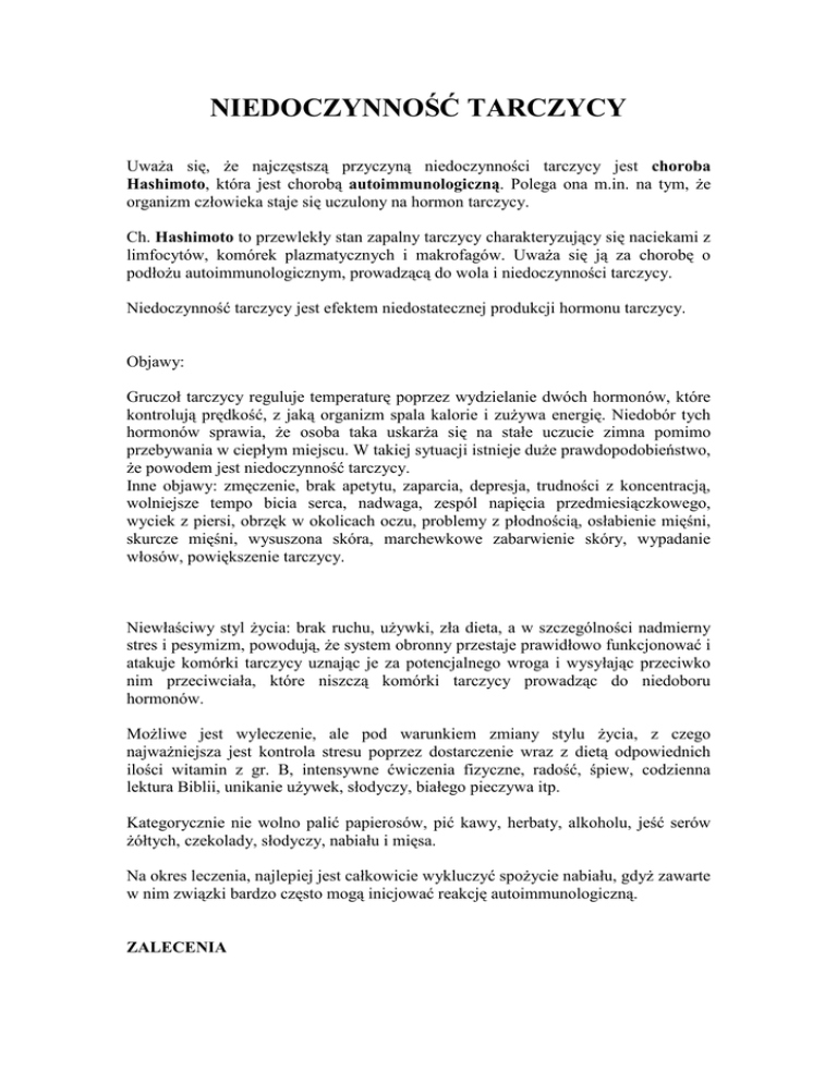 NIEDOCZYNNOŚĆ TARCZYCY UwaŜa się, Ŝe najczęstszą przyczyną niedoczynności tarczycy jest choroba Hashimoto, która jest chorobą autoimmunologiczną. Polega ona m.in. na tym, Ŝe organizm człowieka staje się uczulony na hormon tarczycy. Ch. Hashimoto to przewlekły stan zapalny tarczycy charakteryzujący się naciekami z limfocytów, komórek plazmatycznych i makrofagów. UwaŜa się ją za chorobę o podłoŜu autoimmunologicznym, prowadzącą do wola i niedoczynności tarczycy. Niedoczynność tarczycy jest efektem niedostatecznej produkcji hormonu tarczycy. Objawy: Gruczoł tarczycy reguluje temperaturę poprzez wydzielanie dwóch hormonów, które kontrolują prędkość, z jaką organizm spala kalorie i zuŜywa energię. Niedobór tych hormonów sprawia, Ŝe osoba taka uskarŜa się na stałe uczucie zimna pomimo przebywania w ciepłym miejscu. W takiej sytuacji istnieje duŜe prawdopodobieństwo, Ŝe powodem jest niedoczynność tarczycy. Inne objawy: zmęczenie, brak apetytu, zaparcia, depresja, trudności z koncentracją, wolniejsze tempo bicia serca, nadwaga, zespól napięcia przedmiesiączkowego, wyciek z piersi, obrzęk w okolicach oczu, problemy z płodnością, osłabienie mięśni, skurcze mięśni, wysuszona skóra, marchewkowe zabarwienie skóry, wypadanie włosów, powiększenie tarczycy. Niewłaściwy styl Ŝycia: brak ruchu, uŜywki, zła dieta, a w szczególności nadmierny stres i pesymizm, powodują, Ŝe system obronny przestaje prawidłowo funkcjonować i atakuje komórki tarczycy uznając je za potencjalnego wroga i wysyłając przeciwko nim przeciwciała, które niszczą komórki tarczycy prowadząc do niedoboru hormonów. MoŜliwe jest wyleczenie, ale pod warunkiem zmiany stylu Ŝycia, z czego najwaŜniejsza jest kontrola stresu poprzez dostarczenie wraz z dietą odpowiednich ilości witamin z gr. B, intensywne ćwiczenia fizyczne, radość, śpiew, codzienna lektura Biblii, unikanie uŜywek, słodyczy, białego pieczywa itp. Kategorycznie nie wolno palić papierosów, pić kawy, herbaty, alkoholu, jeść serów Ŝółtych, czekolady, słodyczy, nabiału i mięsa. Na okres leczenia, najlepiej jest całkowicie wykluczyć spoŜycie nabiału, gdyŜ zawarte w nim związki bardzo często mogą inicjować reakcję autoimmunologiczną. ZALECENIA Codziennie energiczny spacer lub intensywne ćwiczenia fizyczne, nie krócej niŜ godzinę. Unikać zbyt częstego oglądania TV i zwrócić uwagę na odpowiedni dobór programów. Nie mogą mieć one niewłaściwego wpływu na psychikę. Okłady z glinki „Humy” na tarczycę. Przed zastosowaniem okładu z glinki warto robić naprzemienne gorące i zimne prysznice na okolice tarczycy, najpierw rozgrzewając dobrze to miejsce. Unikać naleŜy: uŜywek, mięsnych pokarmów, słodyczy, serów Ŝółtych, pokarmów zawierających tiomocznik (kapusta, marchew, orzeszki ziemne, brzoskwinie, gruszki, soja, szpinak, truskawki, rzepa, brukselki, brokuły, gorczyca, musztarda), chloru (woda z kranu) i fluorków, włącznie z pastami do zębów zawierających jego związki. Dieta powinna być bezmięsna i bez nabiału, zamiast mleka krowiego moŜna spoŜywać mleko owsiane, ryŜowe bądź gryczane. Sojowe mleko raczej w małych ilościach lub w ogóle. Unikać spoŜywania pokarmów z soi, gdyŜ zwiększa ona zapotrzebowanie na jod. Jeść naleŜy szczególnie często: płatki owsiane, banany, morele, daktyle, pietruszkę, śliwki. Najlepsza woda do picia, to woda destylowana. Unikać leków sulfa lub przeciwhistaminowych. Kelp – 3 razy dziennie po 3 – 5 tabletek po posiłkach, L-tyrozyna (znajduje się w Special Two) – występuje jej niedobór w przypadku niedoczynności tarczycy, Lecytyna – 3 razy dziennie 1 po jedzeniu, Beta-karoten, Wit. E, Special Two, B12, B2, Boracelle, Witamina C, Cynk. UWAGA! PoniewaŜ niedoczynność tarczycy jest chorobą z autoagresji, najwaŜniejsze w leczeniu tej dolegliwości jest koncentrowanie się na usuwaniu jej prawdziwej przyczyny. Aby jednak zrozumieć co faktycznie stanowi ukrytą przyczynę tej dolegliwości naleŜy koniecznie zapoznać się z opracowaniem „CHOROBY AUTOIMMUNOLOGICZNE”! W przypadku niedoczynności tarczycy bardzo waŜne jest teŜ dokładne zapoznanie się z tematem DEPRESJA oraz zastosowanie podanych tam zaleceń. Sławomir Gromadzki [email protected] UWAGA! Informacje o wymienionych w opracowaniu ziołolekach oraz sposób ich zaŜywania znajdują się w dziale ARTYKUŁY w temacie ZIOLOŁEKI. Środki te moŜna nabyć w niektórych sklepach zielarskich bądź zamówić za pobraniem pocztowym (płatne przy odbiorze) w sklepie zielarsko-medycznym "Leki z BoŜej Apteki" (Szczecin): EMAIL: [email protected] TEL: 091 433 85 38 Aby leczenie opisanej tutaj dolegliwości było kompletne naleŜy koniecznie dodatkowo przeczytać treść wszystkich opracowań na temat zdrowia (znajdujących się w dziale ARTYKUŁY) a przynajmniej artykuł pt. ZASADY ZDROWIA, gdyŜ realizując podane tam zalecenia oraz odŜywiając się wyłącznie według zawartych tam przepisów kulinarnych z czasem usunięta zostanie prawdziwa przyczyna dolegliwości a nie jedynie jej objawy. Nie mniej istotne jest uwaŜne wysłuchanie znajdujących się równieŜ na tej stronie cyklu wszystkich wykładów (audio) na temat zdrowia, gdyŜ w wyniku ich wysłuchania oraz zastosowania podanych podczas tych prelekcji zaleceń wiele osób uwolniło się od roŜnych - często opornych na wcześniejsze próby leczenia dolegliwości. Zachęcam do uwaŜnego wysłuchania wszystkich tych wykładów bez względu na temat, gdyŜ w kaŜdym z nich znajduje się wiele cennych informacji dotyczących zdrowia. Niezwykle waŜne jest codziennie powierzanie swojego Ŝycia i zdrowia Bogu, który jest w stanie dokonać o wiele więcej niŜ jakiekolwiek kuracje. Szczegóły na ten temat wyjaśnia we wspaniały sposób ksiąŜeczka Droga do Chrystusa, którą gorąco polecam, i którą moŜna znaleźć pod niŜej podanym adres