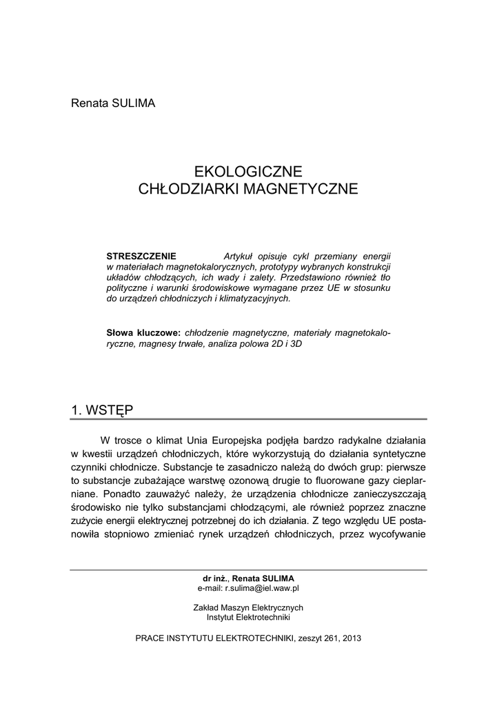 Renata SULIMA EKOLOGICZNE CHŁODZIARKI MAGNETYCZNE STRESZCZENIE Artykuł opisuje cykl przemiany energii w materiałach magnetokalorycznych, prototypy wybranych konstrukcji układów chłodzących, ich wady i zalety. Przedstawiono również tło polityczne i warunki środowiskowe wymagane przez UE w stosunku do urządzeń chłodniczych i klimatyzacyjnych. Słowa kluczowe: chłodzenie magnetyczne, materiały magnetokaloryczne, magnesy trwałe, analiza polowa 2D i 3D 1. WSTĘP W trosce o klimat Unia Europejska podjęła bardzo radykalne działania w kwestii urządzeń chłodniczych, które wykorzystują do działania syntetyczne czynniki chłodnicze. Substancje te zasadniczo należą do dwóch grup: pierwsze to substancje zubażające warstwę ozonową drugie to fluorowane gazy cieplarniane. Ponadto zauważyć należy, że urządzenia chłodnicze zanieczyszczają środowisko nie tylko substancjami chłodzącymi, ale również poprzez znaczne zużycie energii elektrycznej potrzebnej do ich działania. Z tego względu UE postanowiła stopniowo zmieniać rynek urządzeń chłodniczych, przez wycofywanie dr inż., Renata SULIMA e-mail: [email protected] Zakład Maszyn Elektrycznych Instytut Elektrotechniki PRACE INSTYTUTU ELEKTROTECHNIKI, zeszyt 261, 2013 118 R. Sulima substancji chlorofluoroweglowodorowych (HCFC), głównie popularne R22. Już od stycznia 2010 r. nie można stosować tzw. świeżych czynników chłodniczych HCFC tzn. nowych pochodzących od producenta (można stosować tylko z recyklingu), a od stycznia 2015 r. nie można będzie stosować ich w ogóle [6]. Takie postanowienia stwarzają konieczność wykorzystania nowych technik chłodzenia odkrytych kilkanaście czy też kilkadziesiąt lat temu, a do tej pory nie stosowanych na skalę przemysłową. Jedną z nich jest chłodzenie magnetyczne odkryte w roku 1881 przez Warburga [2, 9]. Chłodzenie magnetyczne oparte jest na zjawisku magnetokalorycznym opisanym w 1918 roku przez zespół badaczy Wiessa i Piccarda. Pierwsze próby praktycznego wykorzystania tego efektu były w chłodziarce laboratoryjnej (niskich temperatur rzędu kilku kelwinów) do skraplania helu w latach dwudziestych XX w. skonstruowanej przez Debye i Giauque. Kilka lat później w 1933 Giauque z MacDougall potwierdzili eksperymentalnie tę metodę chłodzenia. Więc od lat trzydziestych ubiegłego wieku chłodziarki magnetyczne stały się standardowym wyposażeniem techniki niskich temperatur z zakresu od kilku do setnych części kelwina czy też w zaawansowanych aplikacjach do tysięcznych części kelwina [2]. 2. PROCESY FIZYCZNE PODCZAS CHŁODZENIA MAGNETYCZNEGO Efekt magnetokaloryczny (magnetocaloric effect MCE) [5] – jest to proces termodynamiczny, w którym zmiany temperatury materiału paramagnetycznego są następstwem cyklicznie zmieniającego się zewnętrznego pola magnetycznego. Proces obniżenia temperatury wynika z uporządkowania dipoli w paramagnetyku, co jest połączone z obniżeniem entropii. Chłodzenie zachodzi w dwóch etapach: pierwszym jest izotermiczne namagnesowanie materiału, podczas którego wzrasta natężenie pola magnetycznego od H0 do H3 (rys.1, proces 1-2); w trakcie magnesowania dipole paramagnetyka układają się równolegle do kierunku natężenia zewnętrznego pola magnetycznego i entropia materiału maleje od S1 do S2; w wyniku namagnesowania do otocznia zostaje przekazane ciepło w ilości q = Tp(S1 – S2) proporcjonalnej do pracy wykonanej przez pole magnetyczne; drugi etap to adiabatyczne rozmagnesowanie paramagnetyka do wartości natężenia pola H0, podczas którego występuje spadek temperatury materiału od temperatury początkowej Tp do temperatury końcowej Tk (rys. 1, proces 2-3). Ekologiczne chłodziarki magnetyczne Rys. 1. Proces adiabatycznego rozmagnesowania [6] Rys. 2. Efekt magnetokaloryczny zachodzący w związku (ang. perovskite oxide material La0.67Ca0.33-xSrxMn1.05O3) przy wzroście x (od lewej do prawej od x = 0,0375 do x = 0,09). Rysunek wewnątrz pokazuje odpowiadające temperatury przemiany adiabatycznej. Pomiary wykonano przy zewnętrznym polu magnetycznym o indukcji B = 1 T, zmiana entropii S mierzona jest pośrednio przez pomiar namagnesowania zaś przyrost temperatury Tad mierzony jest bezpośrednio [4, 7] 119 120 R. Sulima Rys. 3. Efekt magnetokaloryczny w związku (ang. perovskite oxide material La0.67Ca0.25-xSrxMnO3 (x = 0,1)) przy wzroście indukcji zewnętrznego pola magnetycznego od 0,5; 1,2; 1,6 T (krzywe odpowiednio od dołu do góry) [4, 7] Temperatura paramagnetyka po rozmagnesowaniu jest dana wyrażeniem: Tk Tp 1 0CH 02 cH T02 w którym: H0 – początkowe natężenie pola magnetycznego, C – stała materiałowa Curie-Weissa, cH – ciepło właściwe paramagnetyka przy stałym natężeniu pola magnetycznego H, 0 – przenikalność magnetyczna próżni. Proces chłodzenia magnetycznego można porównać z procesem sprężania i rozprężania gazu. Izotermiczne namagnesowanie to odpowiednik izotermicznego sprężania, natomiast adiabatyczne rozmagnesowanie jest odpowiednikiem izentropowego rozprężania gazu (rys. 4). W celu zwiększenia wydajności MCE (efektu magnetokalorycznego) [1] w chodziarkach magnetycznych stosuje się proces regeneracji. Zwykle wykorzystuje się dwa rodzaje regeneratorów: pasywne i aktywne. Regenerator pasywny [8] – jest to urządzenie termiczne, które przenosi ciepło pomiędzy częściami termodynamicznego regeneracyjnego obiegu chłodniczego w przeciwnych kierunkach (z ciepłego odbiornika do zimnego źródła i z zimnego źródła do ciepłego odbiornika). Kiedy gaz (nośnik ciepła) o wysokiej Ekologiczne chłodziarki magnetyczne 121 temperaturze i wysokim ciśnieniu przechodzi przez regenerator to regenerator absorbuje ciepło od gazu. Gaz się ochładza i rozpręża; w przeciwnym kierunku kiedy przez regenerator przechodzi zimny i rozprężony gaz, to pobiera on ciepło z regeneratora. Regenerator służy rozszerzaniu zakresu temperaturo