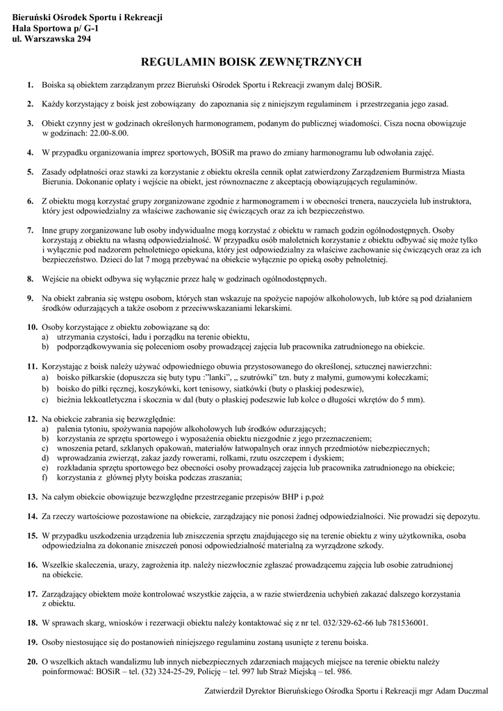 Bieruński Ośrodek Sportu i Rekreacji Hala Sportowa p/ G-1 ul. Warszawska 294 REGULAMIN BOISK ZEWNĘTRZNYCH 1. Boiska są obiektem zarządzanym przez Bieruński Ośrodek Sportu i Rekreacji zwanym dalej BOSiR. 2. Każdy korzystający z boisk jest zobowiązany do zapoznania się z niniejszym regulaminem i przestrzegania jego zasad. 3. Obiekt czynny jest w godzinach określonych harmonogramem, podanym do publicznej wiadomości. Cisza nocna obowiązuje w godzinach: 22.00-8.00. 4. W przypadku organizowania imprez sportowych, BOSiR ma prawo do zmiany harmonogramu lub odwołania zajęć. 5. Zasady odpłatności oraz stawki za korzystanie z obiektu określa cennik opłat zatwierdzony Zarządzeniem Burmistrza Miasta Bierunia. Dokonanie opłaty i wejście na obiekt, jest równoznaczne z akceptacją obowiązujących regulaminów. 6. Z obiektu mogą korzystać grupy zorganizowane zgodnie z harmonogramem i w obecności trenera, nauczyciela lub instruktora, który jest odpowiedzialny za właściwe zachowanie się ćwiczących oraz za ich bezpieczeństwo. 7. Inne grupy zorganizowane lub osoby indywidualne mogą korzystać z obiektu w ramach godzin ogólnodostępnych. Osoby korzystają z obiektu na własną odpowiedzialność. W przypadku osób małoletnich korzystanie z obiektu odbywać się może tylko i wyłącznie pod nadzorem pełnoletniego opiekuna, który jest odpowiedzialny za właściwe zachowanie się ćwiczących oraz za ich bezpieczeństwo. Dzieci do lat 7 mogą przebywać na obiekcie wyłącznie po opieką osoby pełnoletniej. 8. Wejście na obiekt odbywa się wyłącznie przez halę w godzinach ogólnodostępnych. 9. Na obiekt zabrania się wstępu osobom, których stan wskazuje na spożycie napojów alkoholowych, lub które są pod działaniem środków odurzających a także osobom z przeciwwskazaniami lekarskimi. 10. Osoby korzystające z obiektu zobowiązane są do: a) utrzymania czystości, ładu i porządku na terenie obiektu, b) podporządkowywania się poleceniom osoby prowadzącej zajęcia lub pracownika zatrudnionego na obiekcie. 11. Korzystając z boisk należy używać odpowiedniego obuwia przystosowanego do określonej, sztucznej nawierzchni: a) boisko piłkarskie (dopuszcza się buty typu :”lanki”, „ szutrówki” tzn. buty z małymi, gumowymi kołeczkami; b) boisko do piłki ręcznej, koszykówki, kort tenisowy, siatkówki (buty o płaskiej podeszwie), c) bieżnia lekkoatletyczna i skocznia w dal (buty o płaskiej podeszwie lub kolce o długości wkrętów do 5 mm). 12. Na obiekcie zabrania się bezwzględnie: a) palenia tytoniu, spożywania napojów alkoholowych lub środków odurzających; b) korzystania ze sprzętu sportowego i wyposażenia obiektu niezgodnie z jego przeznaczeniem; c) wnoszenia petard, szklanych opakowań, materiałów łatwopalnych oraz innych przedmiotów niebezpiecznych; d) wprowadzania zwierząt, zakaz jazdy rowerami, rolkami, rzutu oszczepem i dyskiem; e) rozkładania sprzętu sportowego bez obecności osoby prowadzącej zajęcia lub pracownika zatrudnionego na obiekcie; f) korzystania z głównej płyty boiska podczas zraszania; 13. Na całym obiekcie obowiązuje bezwzględne przestrzeganie przepisów BHP i p.poż 14. Za rzeczy wartościowe pozostawione na obiekcie, zarządzający nie ponosi żadnej odpowiedzialności. Nie prowadzi się depozytu. 15. W przypadku uszkodzenia urządzenia lub zniszczenia sprzętu znajdującego się na terenie obiektu z winy użytkownika, osoba odpowiedzialna za dokonanie zniszczeń ponosi odpowiedzialność materialną za wyrządzone szkody. 16. Wszelkie skaleczenia, urazy, zagrożenia itp. należy niezwłocznie zgłaszać prowadzącemu zajęcia lub osobie zatrudnionej na obiekcie. 17. Zarządzający obiektem może kontrolować wszystkie zajęcia, a w razie stwierdzenia uchybień zakazać dalszego korzystania z obiektu. 18. W sprawach skarg, wniosków i rezerwacji obiektu należy kontaktować się z nr tel. 032/329-62-66 lub 781536001. 19. Osoby niestosujące się do postanowień niniejszego regulaminu zostaną usunięte z terenu boiska. 20. O wszelkich aktach wandalizmu lub innych niebezpiecznych zdarzeniach mających miejsce na terenie obiektu należy poinformować: BOSiR – tel. (32) 324-25-29, Policję – tel. 997 lub Straż Miejską – tel. 986. Zatwierdził Dyrektor Bieruńskiego Ośrodka Sportu i Rekreacji mgr Adam Duczmal