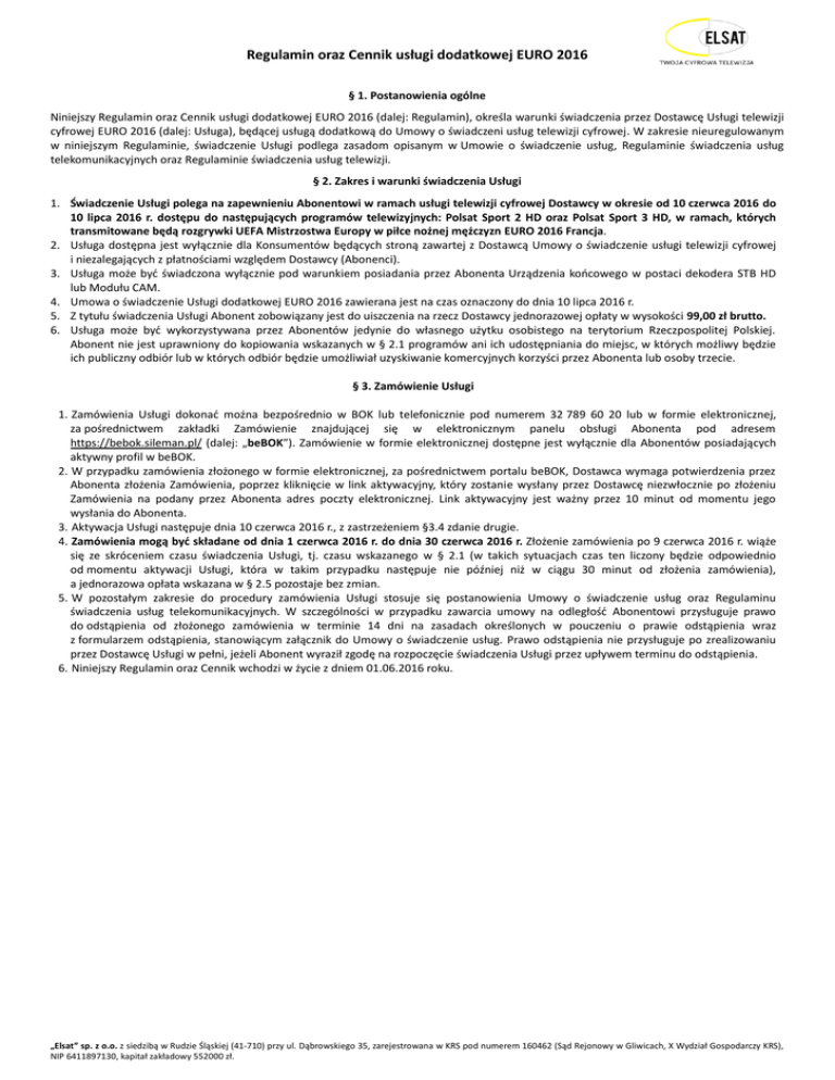 Regulamin oraz Cennik usługi dodatkowej EURO 2016 § 1. Postanowienia ogólne Niniejszy Regulamin oraz Cennik usługi dodatkowej EURO 2016 (dalej: Regulamin), określa warunki świadczenia przez Dostawcę Usługi telewizji cyfrowej EURO 2016 (dalej: Usługa), będącej usługą dodatkową do Umowy o świadczeni usług telewizji cyfrowej. W zakresie nieuregulowanym w niniejszym Regulaminie, świadczenie Usługi podlega zasadom opisanym w Umowie o świadczenie usług, Regulaminie świadczenia usług telekomunikacyjnych oraz Regulaminie świadczenia usług telewizji. § 2. Zakres i warunki świadczenia Usługi 1. Świadczenie Usługi polega na zapewnieniu Abonentowi w ramach usługi telewizji cyfrowej Dostawcy w okresie od 10 czerwca 2016 do 10 lipca 2016 r. dostępu do następujących programów telewizyjnych: Polsat Sport 2 HD oraz Polsat Sport 3 HD, w ramach, których transmitowane będą rozgrywki UEFA Mistrzostwa Europy w piłce nożnej mężczyzn EURO 2016 Francja. 2. Usługa dostępna jest wyłącznie dla Konsumentów będących stroną zawartej z Dostawcą Umowy o świadczenie usługi telewizji cyfrowej i niezalegających z płatnościami względem Dostawcy (Abonenci). 3. Usługa może być świadczona wyłącznie pod warunkiem posiadania przez Abonenta Urządzenia końcowego w postaci dekodera STB HD lub Modułu CAM. 4. Umowa o świadczenie Usługi dodatkowej EURO 2016 zawierana jest na czas oznaczony do dnia 10 lipca 2016 r. 5. Z tytułu świadczenia Usługi Abonent zobowiązany jest do uiszczenia na rzecz Dostawcy jednorazowej opłaty w wysokości 99,00 zł brutto. 6. Usługa może być wykorzystywana przez Abonentów jedynie do własnego użytku osobistego na terytorium Rzeczpospolitej Polskiej. Abonent nie jest uprawniony do kopiowania wskazanych w § 2.1 programów ani ich udostępniania do miejsc, w których możliwy będzie ich publiczny odbiór lub w których odbiór będzie umożliwiał uzyskiwanie komercyjnych korzyści przez Abonenta lub osoby trzecie. § 3. Zamówienie Usługi 1. Zamówienia Usługi dokonać można bezpośrednio w BOK lub telefonicznie pod numerem 32 789 60 20 lub w formie elektronicznej, za pośrednictwem zakładki Zamówienie znajdującej się w elektronicznym panelu obsługi Abonenta pod adresem https://bebok.sileman.pl/ (dalej: „beBOK”). Zamówienie w formie elektronicznej dostępne jest wyłącznie dla Abonentów posiadających aktywny profil w beBOK. 2. W przypadku zamówienia złożonego w formie elektronicznej, za pośrednictwem portalu beBOK, Dostawca wymaga potwierdzenia przez Abonenta złożenia Zamówienia, poprzez kliknięcie w link aktywacyjny, który zostanie wysłany przez Dostawcę niezwłocznie po złożeniu Zamówienia na podany przez Abonenta adres poczty elektronicznej. Link aktywacyjny jest ważny przez 10 minut od momentu jego wysłania do Abonenta. 3. Aktywacja Usługi następuje dnia 10 czerwca 2016 r., z zastrzeżeniem §3.4 zdanie drugie. 4. Zamówienia mogą być składane od dnia 1 czerwca 2016 r. do dnia 30 czerwca 2016 r. Złożenie zamówienia po 9 czerwca 2016 r. wiąże się ze skróceniem czasu świadczenia Usługi, tj. czasu wskazanego w § 2.1 (w takich sytuacjach czas ten liczony będzie odpowiednio od momentu aktywacji Usługi, która w takim przypadku następuje nie później niż w ciągu 30 minut od złożenia zamówienia), a jednorazowa opłata wskazana w § 2.5 pozostaje bez zmian. 5. W pozostałym zakresie do procedury zamówienia Usługi stosuje się postanowienia Umowy o świadczenie usług oraz Regulaminu świadczenia usług telekomunikacyjnych. W szczególności w przypadku zawarcia umowy na odległość Abonentowi przysługuje prawo do odstąpienia od złożonego zamówienia w terminie 14 dni na zasadach określonych w pouczeniu o prawie odstąpienia wraz z formularzem odstąpienia, stanowiącym załącznik do Umowy o świadczenie usług. Prawo odstąpienia nie przysługuje po zrealizowaniu przez Dostawcę Usługi w pełni, jeżeli Abonent wyraził zgodę na rozpoczęcie świadczenia Usługi przez upływem terminu do odstąpienia. 6. Niniejszy Regulamin oraz Cennik wchodzi w życie z dniem 01.06.2016 roku. „Elsat” sp. z o.o. z siedzibą w Rudzie Śląskiej (41-710) przy ul. Dąbrowskiego 35, zarejestrowana w KRS pod numerem 160462 (Sąd Rejonowy w Gliwicach, X Wydział Gospodarczy KRS), NIP 6411897130, kapitał zakładowy 552000 zł.