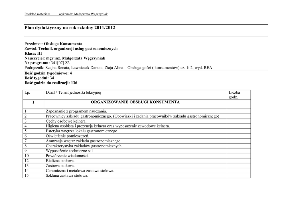 Rozkład materiału wykonała: Małgorzata Węgrzyniak Plan dydaktyczny na rok szkolny 2011/2012 Przedmiot: Obsługa Konsumenta Zawód: Technik organizacji usług gastronomicznych Klasa: III Nauczyciel: mgr inż. Małgorzata Węgrzyniak Nr programu: 341[07].Z3 Podręcznik: Szajna Renata, Ławniczak Danuta, Ziaja Alina – Obsługa gości ( konsumentów) cz. 1i 2, wyd. REA Ilość godzin tygodniowo: 4 Ilość tygodni: 34 Ilość godzin do realizacji: 136 Lp. Dział / Temat jednostki lekcyjnej I 1 2 3 4 5 6 7 8 9 10 12 13 14 15 ORGANIZOWANIE OBSŁUGI KONSUMENTA Zapoznanie z programem nauczania. Pracownicy zakładu gastronomicznego. (Obowiązki i zadania pracowników zakładu gastronomicznego) Cechy osobowe kelnera. Higiena osobista i prezencja kelnera oraz wyposażenie zawodowe kelnera. Estetyka wnętrza lokalu gastronomicznego. Oświetlenie pomieszczeń. Aranżacja wnętrz zakładu gastronomicznego. Charakterystyka zakładów gastronomicznych. Wyposażenie techniczne sal. Powtórzenie wiadomości. Bielizna stołowa. Zastawa stołowa. Ceramiczna i metalowa zastawa stołowa. Szklana zastawa stołowa. Liczba godz. Rozkład materiału 16 17 18 19 20 21 22 23 24 25 26 27-28 29 30 31 32 33 34 35 36 37 38 39-40 410 42-43 44-45 46 47 48 49 50-52 wykonała: Małgorzata Węgrzyniak Dobór szkła do napojów. Sztućce-podział. Sztućce pomocnicze. Dodatkowy sprzęt pomocniczy. Powtórzenie wiadomości. Pielęgnacja i przechowywania zastawy stołowej. Wyposażenie bufetów. Wyposażenie herbaciarni, pubu i kawiarni. Sprzęt barmański. Powtórzenie wiadomości. Ustawianie stołów do obsługi gości indywidualnych. Przygotowanie zastawy stołowej do podawania dań i napojów. Pomocniczy sprzęt kelnerski – sposób przygotowania. Dobór kolorystyczny bielizny stołowej. Techniki nakrywania stołów bielizną stołową. Karty menu – rodzaje, zasady sporządzania, struktura graficzna, układ karty. Analiza kart menu różnego typu zakładów gastronomicznych. Karty potraw i napojów. Menu okolicznościowe Menu dla różnej grupy ludności. Powtórzenie wiadomości Zasady przygotowania stołów pomocniczych. Zasady rozkładania, składania i wymiany obrusów. Składanie serwet płóciennych. Formowanie serwet papierowych. Nakrywanie stołów. film Nakrycie proste. Nakrycie do serwisu a la carte. Przygotowanie nakrycia w obecności gości. Planowanie dekoracji stołu. Wykonywanie dekoracji stołu. 2 2 Rozkład materiału wykonała: Małgorzata Węgrzyniak 53 54 55 56-57 58-59 60 61-62 63-64 65 66-67 66-69 70-71 72 73 74 Powtórzenie wiadomości. Techniki przenoszenia tac. Polerowanie zastawy stołowej. Przenoszenie talerzy. Przenoszenie bulionówek, szkła i filiżanek. Przenoszenie sztućców i półmisków. Układanie sztućców do podawania potraw. Układanie sztućców do prostych posiłków. Nakrycie do kawy i herbaty. Zbieranie naczyń po konsumpcji. Zbieranie talerzy po konsumpcji i bulionówek. Zbieranie zastawy stołowej na tacę. Powtórzenie wiadomości. Systemy obsługi kelnerskiej. Samoobsługa z obsługą kelnerską. 75 Schemat rozmieszczenia stolików, krzeseł i pomocników kelnerskich oraz kierunek ruchu gości. 76 77 78 79 80 81 82 83-84 85 Samoobsługa. Przebieg obsługi. Ogólne zasady obsługi. Serwis niemiecki. Serwis francuski. Serwis angielski. Serwis rosyjski i bufetowy. Metody obsługi – zajęcia ćwiczeniowe. Powtórzenie wiadomości PODAWANIE POTRAW I NAPOJÓW Podawanie potraw z zastosowaniem serwisu niemieckiego. Podawanie potraw z zastosowaniem serwisu francuskiego. Podawanie potraw z zastosowaniem serwisu angielskiego. Podawanie potraw z zastosowaniem serwisu rosyjskiego i bufetowego. 86-90 91-94 95-98 99-103 2 2 2 Rozkład materiału 104 105 106 107 108 109 110 111 112-114 115 116 117 118 119-120 121 122 123 124 125 126 127 128-129 130 131 132 133-134 135 136 wykonała: Małgorzata Węgrzyniak Podział śniadań i charakterystyka śniadania prostego i wiedeńskiego. Charakterystyka śniadania angielskiego i amerykańskiego. Naczynia i sztućce do podawania śniadań. Techniki podawania śniadań. Bufet śniadaniowy. Powtórzenie wiadomości. Rodzaje przystawek. Techniki podawania zup. Podawanie zup. Rodzaje dań zasadniczych oraz dobór naczyń i sztućców do podawania dań zasadniczych. Techniki podawania dań zasadniczych. Podawanie serów. Podawanie deserów- dobór naczyń i sztućców. Techniki podawania deserów. Powtórzenie wiadomości. Kolejność podawania potraw i napojów. Stosowanie różnych technik podawania zimnych napojów bezalkoholowych. Zasady podawania gorących napojów bezalkoholowych. Przegląd kaw i napojów kawowych. Naczynia i sztućce do podawania kaw. Techniki podawania kaw. Sporządzanie i podawanie kawy. Podział herbat. Receptury przygotowania herbaty. Naczynia i sztućce do podawania herbaty. Przygotowanie kakao i czekolady. Powtórzenie wiadomości. Podsumowanie całorocznej pracy.