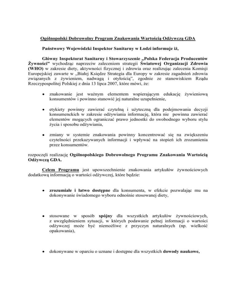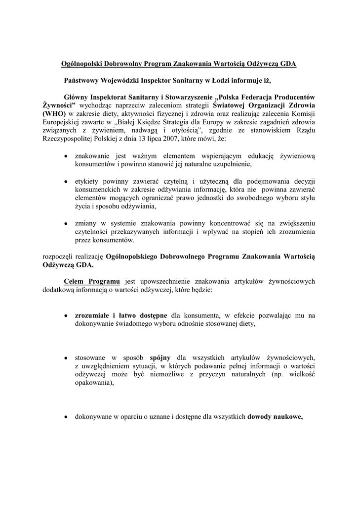 Ogólnopolski Dobrowolny Program Znakowania Wartością Odżywczą GDA Państwowy Wojewódzki Inspektor Sanitarny w Łodzi informuje iż, Główny Inspektorat Sanitarny i Stowarzyszenie „Polska Federacja Producentów Żywności” wychodząc naprzeciw zaleceniom strategii Światowej Organizacji Zdrowia (WHO) w zakresie diety, aktywności fizycznej i zdrowia oraz realizując zalecenia Komisji Europejskiej zawarte w „Białej Księdze Strategia dla Europy w zakresie zagadnień zdrowia związanych z żywieniem, nadwagą i otyłością”, zgodnie ze stanowiskiem Rządu Rzeczypospolitej Polskiej z dnia 13 lipca 2007, które mówi, że: znakowanie jest ważnym elementem wspierającym edukację żywieniową konsumentów i powinno stanowić jej naturalne uzupełnienie, etykiety powinny zawierać czytelną i użyteczną dla podejmowania decyzji konsumenckich w zakresie odżywiania informację, która nie powinna zawierać elementów mogących ograniczać prawo jednostki do swobodnego wyboru stylu życia i sposobu odżywiania, zmiany w systemie znakowania powinny koncentrować się na zwiększeniu czytelności przekazywanych informacji i wpływać na stopień ich zrozumienia przez konsumentów. rozpoczęli realizację Ogólnopolskiego Dobrowolnego Programu Znakowania Wartością Odżywczą GDA. Celem Programu jest upowszechnienie znakowania artykułów żywnościowych dodatkową informacją o wartości odżywczej, które będzie: zrozumiałe i łatwo dostępne dla konsumenta, w efekcie pozwalając mu na dokonywanie świadomego wyboru odnośnie stosowanej diety, stosowane w sposób spójny dla wszystkich artykułów żywnościowych, z uwzględnieniem sytuacji, w których podawanie pełnej informacji o wartości odżywczej może być niemożliwe z przyczyn naturalnych (np. wielkość opakowania), dokonywane w oparciu o uznane i dostępne dla wszystkich dowody naukowe, bazujące na wartościach Wskazanego Dziennego Spożycia (GDA) uzgodnionych przez CIAA i Europejską Platformę ds. Diety Aktywności Fizycznej i Zdrowia, a w przyszłości na wartościach określonych przez EFSA, wspierane przez programy oświatowe dotyczące znakowania wartością odżywczą, które pomogą osiągnąć pozytywne zmiany w zachowaniu konsumentów, a tym samym przyczynić się do zahamowania rozwoju nadwagi i otyłości. Program został opracowany w oparciu o rekomendacje Konfederacji Przemysłu Żywności i Napojów UE (CIAA) i Europejskiej Platformy ds. Diety, Aktywności Fizycznej i Zdrowia. System znakowania GDA – definicja Dobrowolny system znakowania wartością odżywczą GDA polega na oznakowaniu produktu informacją o procentowej zawartości wybranych składników odżywczych i energii w porcji produktu, w odniesieniu do wartości Wskazanego Dziennego Spożycia (Guideline Daily Amounts). GDA - Wskazane Dzienne Spożycie Wskazane Dzienne Spożycie GDA (Guideline Daily Amounts) określa wartości poziomu spożycia poszczególnych składników odżywczych w codziennej diecie, wyznaczone przez naukowców dla przeciętnego dorosłego i zdrowego konsumenta. Składnik odżywczy Wskazane Dzienne Spożycie (GDA) - wartości określone dla kobiet* 2000 kcal Wartość energetyczna 50 g Białko 270 g Węglowodany nie więcej niż 70 g Tłuszcz Kwasy tłuszczowe nasycone nie więcej niż 20 g 25 g Błonnik nie więcej niż 2,4 g (6 g) Sód (sól) nie więcej niż 90 g Cukry - w tym cukry dodane nie więcej niż 50 g Wskazane Dzienne Spożycie (GDA) - wartości określone dla mężczyzn 2500 kcal 60 g 340 g nie więcej niż 80 g nie więcej niż 30 g 25 g nie więcej niż 2,4 g (6 g) nie więcej niż 110 g nie więcej niż 62,5 g * Wartości uzgodnione z Instytutem Żywności i Żywienia Dobrowolny system znakowania wartością odżywczą GDA Nazwa składnika Ilość składnika w porcji produktu % wskazanego dziennego spożycia Przykłady znakowania wg systemu GDA - przód opakowania Przykłady znakowania wg systemu GDA - tył opakowania Wartość odżywcza w 100 g w porcji 18 g % GDA* w 18 g wartość energetyczna 1610 kJ/ 290 kJ/ 4% 384 kcal 69 kcal 3,7 g 0,7 g 1% białko 75,9 g 13,7 g 5% węglowodany 60 g 10,8 g 12% - w tym cukry 9,5 g 1,7 g 3% tłuszcz 9,2 g 1,7 g 9% - w tym nasycony 4,2 g 0,8 g 3% błonnik 0,11 g 0,02 g 1% sód * GDA – Wskazane Dzienne Spożycie dla osoby dorosłej. Zapotrzebowanie na składniki odżywcze poszczególnych osób może być wyższe lub niższe, w zależności od płci, wieku, poziomu aktywności fizycznej oraz innych czynników. Porcja 250 ml dostarcza: kcal Cukry 140 kcal 7% 3,0 3% Tłuszcz g 1,0 g 1% Kwasy Sód tłuszczowe nasycone 0,1 g 0,1 g 1% 4% % Wskazanego Dziennego Spożycia dla osoby dorosłej * Indywidualne zapotrzebowanie na poszczególne składniki odżywcze może być wyższe lub niższe, zależnie od płci, wieku, poziomu aktywności fizycznej i innych czynników. Czemu służy system znakowania GDA? wspiera system edukacji żywieniowej mającej na celu zapobieżenie rozwojowi nadwagi i otyłości gdyż: wspomaga konsumentów w decyzjach dotyczących sposobu odżywiania i stosowaniu zasad zbilansowanej energetycznie i żywieniowo diety, uzupełnia w czytelny i łatwy do zrozumienia sposób obecnie podawane na etykietach produktów spożywczych informacje o wartości odżywczej. Zalety systemu znakowania GDA łatwy do zrozumienia i szybki sposób na dotarcie do informacji żywieniowej, niezbędnej z punktu widzenia zasad zbilansowanej diety, proste i dobrze widoczne symbole graficzne - informacje graficzne są przedstawiane na froncie opakowania, umożliwia szybką ocenę wartości kalorycznej produktu oraz miejsca, jakie należy mu przypisać w zbilansowanej diecie, w pełni oparty na obowiązujących przepisach dotyczących znakowania wartością odżywczą. Udział w Programie jest dobrowolny. Program dotyczy producentów tzw. produktów ogólnego spożycia (nie obejmuje wyrobów specjalnego przeznaczenia żywieniowego). Firmy biorące udział w programie wdrażaj