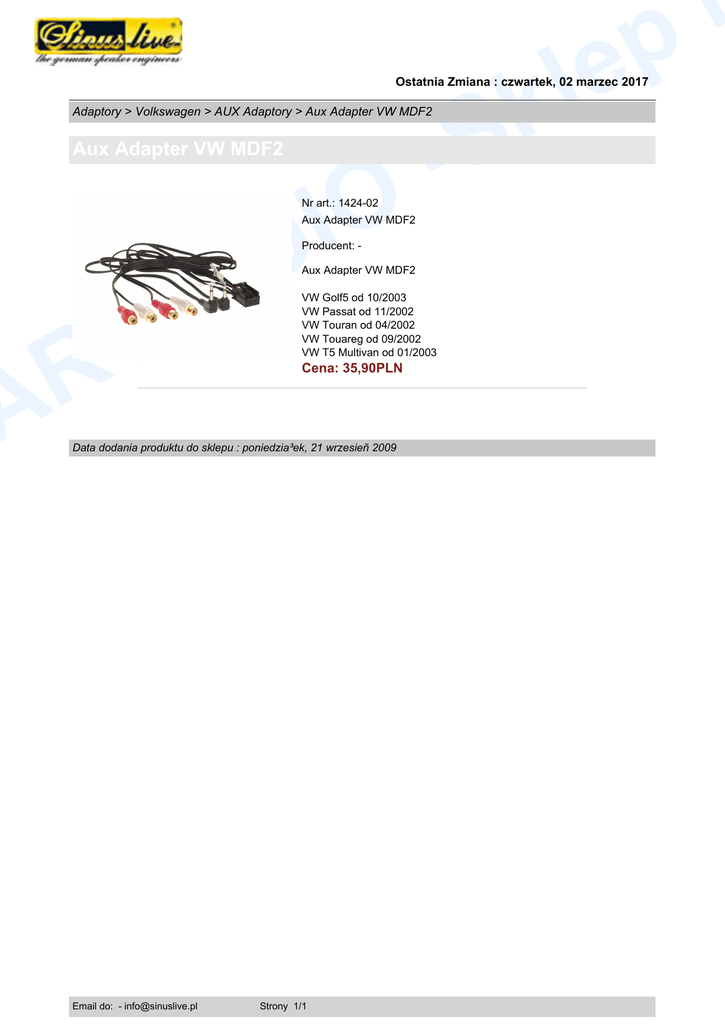 e l k -S i p Ostatnia Zmiana : czwartek, 02 marzec 2017 Adaptory > Volkswagen > AUX Adaptory > Aux Adapter VW MDF2 Aux Adapter VW MDF2 O I D Nr art.: 1424-02 Aux Adapter VW MDF2 Producent: - A U A R Aux Adapter VW MDF2 VW Golf5 od 10/2003 VW Passat od 11/2002 VW Touran od 04/2002 VW Touareg od 09/2002 VW T5 Multivan od 01/2003 Cena: 35,90PLN Data dodania produktu do sklepu : poniedzia³ek, 21 wrzesieñ 2009 Email do: - [email protected] Strony 1/1