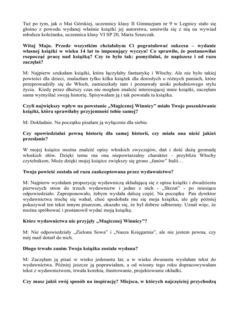 Tuż po tym, jak o Mai Górskiej, uczennicy klasy II Gimnazjum nr 9 w Legnicy stało się głośno z powodu wydanej właśnie książki jej autorstwa, umówiła się z nią na wywiad młodsza koleżanka, uczennica klasy VI SP 20, Maria Szurczak. Witaj Maju. Przede wszystkim chciałabym Ci pogratulować sukcesu – wydanie własnej książki w wieku 14 lat to imponujący wyczyn! Co sprawiło, że postanowiłaś rozpocząć pracę nad książką? Czy to było tak: pomyślałaś, że napiszesz i od razu zaczęłaś? M: Najpierw szukałam książki, która łączyłaby fantastykę i Włochy. Ale nie było takiej powieści dla dzieci, znalazłam tylko kilka książek dla dorosłych o różnych paniach, które przeprowadziły się do Włoch, zamieszkały tam i poznawały uroki południowego stylu życia. Kiedy przez dłuższy czas nie mogłam znaleźć interesującej mnie książki, zaczęłam sama wymyślać swoją historię. Spisywałam ją i tak powstała ta książka. Czyli największy wpływ na powstanie „Magicznej Winnicy” miało Twoje poszukiwanie książki, która sprawiłaby przyjemność tobie samej? M: Dokładnie. Na początku pisałam ją wyłącznie dla siebie. Czy opowiedziałaś pewną historię dla samej historii, czy miała ona nieść jakieś przesłanie? W mojej książce można znaleźć opisy włoskich zwyczajów, dań i dość dużą gromadę włoskich słów. Dzięki temu ma ona niepowtarzalny charakter - przybliża Włochy czytelnikom. Może dzięki mojej książce zwiększy się grono „fanów” Italii… Twoja powieść została od razu zaakceptowana przez wydawnictwo? M: Najpierw wysłałam propozycję wydawniczą składającą się z opisu książki i dwudziestu pierwszych stron do trzech wydawnictw i jedno z nich - „Skrzat” - po miesiącu odpowiedziało. Zaproponowało, żebym wysłała dalszą część. Na początku Pan dyrektor wydawnictwa trochę się wahał, choć spodobała mu się moja książka, ale gdy później pokazywał ten tekst innym pisarzom, okazało się, że był dobrze odbierany. Uznał więc, że można spróbować i postanowił wydać moją książkę. Które wydawnictwa nie przyjęły „Magicznej Winnicy”? M: Nie odpowiedziały „Zielona Sowa” i „Nasza Księgarnia”, ale nie jestem pewna, czy mój mail dotarł do nich. Długo trwało zanim Twoja książka została wydana? M: Zaczęłam ją pisać w wieku jedenastu lat, a w wieku dwunastu wysłałam tekst do wydawnictwa. Później jeszcze ją poprawiałam, a od wiosny tego roku dopracowywałam tekst z wydawnictwem, trwała korekta, ilustrowanie, projektowanie okładki. Czy masz jakiś swój sposób na inspirację? Miejsca, w których najczęściej przychodzą Ci do głowy różne pomysły? M: Raczej nie mam takich miejsc, ani żadnych sposobów. Czasami zastanawiam się nad tym, jak można coś napisać i pomysły same przychodzą mi do głowy. Korzystam też z tego, co kiedyś usłyszałam, czy przeczytałam. Piszę w domu, w podróży, na plaży. Część książki powstała w czasie wycieczki do Włoch. Pisałam wtedy nawet w autokarze. Masz jakieś marzenia, plany w związku z pisaniem? M: Chciałabym zostać pisarką, na której książki czytelnicy czekaliby z niecierpliwieniem. Masz jakieś pomysły na nowe książki? M: Nawet dużo! Spisane pomysły czekają w zeszycie. A druga część „Magicznej winnicy” jest już prawie napisana. Czy w innych książkach, poza tą serią, również chciałabyś przepleść realizm z magią, czy spróbowałabyś innej formy? M: Niektóre moje pomysły na książki są realistyczno – magiczne, a akcje innych rozgrywają się w zwykłym świecie. Fantastyka to Twój ulubiony gatunek literacki? M: Tak, zdecydowanie. W zwykłym świecie trudno zaskoczyć czytelnika niezwykłym wydarzeniem, a w fantasy może dziać się tak naprawdę wszystko. jakimś Czy masz jakieś wskazówki dla tych, którzy chcieliby napisać własną książkę? M: Jeżeli zaczniecie pisać, to nie możecie się poddawać. Praca nad książką trwa długo i czasem można się zniechęcić. Nie zawsze jest tak, że się coś napisze. Raz można w godzinę napisać długi rozdział, a innym razem, w tym samym czasie, ledwie dwa zdania. Miałaś takie chwile, że myślałaś, że i tak Ci się nie uda, że chciałaś przestać pracować nad „Magiczną Winnicą”? M: Czasami, kiedy miałam problem z jakimś fragmentem i wersja początkowa niezbyt mi się podobała, to chciałam (piszę na komputerze) wszystko wykasować, ale na szczęście nigdy tak nie zrobiłam. Kiedy byłaś młodsza planowałaś karierę pisarki? M: W pierwszej klasie szkoły podstawowej napisałam krótkie opowiadanie. Sama je zilustrowałam i zrobiłam sobie malutką książeczkę. Później pisałam inne krótkie opowiadania. Już wtedy myślałam, że może kiedyś wyślę je do jakiegoś wydawnictwa. Więc... od dawna pisanie chodziło mi po głowie. Udało mi się nawet wygrać dwa lata temu legnicki konkurs „Mały literat”. Co lubisz robić oprócz pisania? M: Bardzo lubię tańczyć. Należę do Zespołu Pieśni i Tańca „Legnica”. Oprócz tego chodzę na zajęcia z języka włoskiego. Lubię też czyta książki. Jedną z moich ulubionych lektur jest seria „Baśniobór” Brandona Mull'a. Jak to jest wiedzieć, że inni mają Twoją książkę u siebie i ją czytają? M: Kiedy wysyłałam książkę do wydawnictwa nawet nie wyobrażałam sobie, że ktokolwiek ją przeczyta. Teraz, kiedy wiem, że niektóre osoby mają już tą książkę i ją czytają, wydaje mi się to niezwykłe. To bardzo przyjemne uczucie. Widzisz siebie w przyszłości jako wielką i znaną na całym świecie pisarkę, odbierającą najbardziej prestiżowe nagrody, czy raczej autorkę piszącą dla mniejszej, lecz stałej grupy odbiorców? Oczekujesz, że „Magiczną Winnicą” zainteresujesz wielu czytelników, czy wystarczy Ci ich skromna liczba na początek? M: Jak już mówiłam, na razie wie
