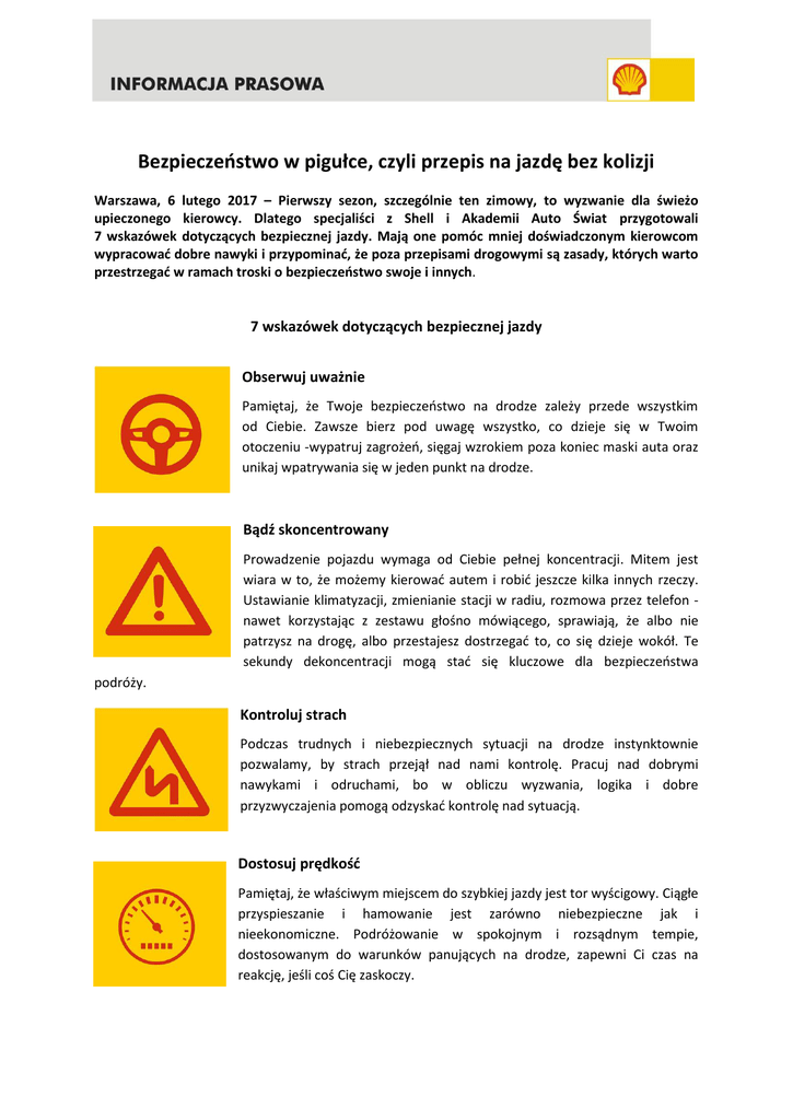 Bezpieczeństwo w pigułce, czyli przepis na jazdę bez kolizji Warszawa, 6 lutego 2017 – Pierwszy sezon, szczególnie ten zimowy, to wyzwanie dla świeżo upieczonego kierowcy. Dlatego specjaliści z Shell i Akademii Auto Świat przygotowali 7 wskazówek dotyczących bezpiecznej jazdy. Mają one pomóc mniej doświadczonym kierowcom wypracować dobre nawyki i przypominać, że poza przepisami drogowymi są zasady, których warto przestrzegać w ramach troski o bezpieczeństwo swoje i innych. 7 wskazówek dotyczących bezpiecznej jazdy Obserwuj uważnie Pamiętaj, że Twoje bezpieczeństwo na drodze zależy przede wszystkim od Ciebie. Zawsze bierz pod uwagę wszystko, co dzieje się w Twoim otoczeniu -wypatruj zagrożeń, sięgaj wzrokiem poza koniec maski auta oraz unikaj wpatrywania się w jeden punkt na drodze. Bądź skoncentrowany Prowadzenie pojazdu wymaga od Ciebie pełnej koncentracji. Mitem jest wiara w to, że możemy kierować autem i robić jeszcze kilka innych rzeczy. Ustawianie klimatyzacji, zmienianie stacji w radiu, rozmowa przez telefon nawet korzystając z zestawu głośno mówiącego, sprawiają, że albo nie patrzysz na drogę, albo przestajesz dostrzegać to, co się dzieje wokół. Te sekundy dekoncentracji mogą stać się kluczowe dla bezpieczeństwa podróży. Kontroluj strach Podczas trudnych i niebezpiecznych sytuacji na drodze instynktownie pozwalamy, by strach przejął nad nami kontrolę. Pracuj nad dobrymi nawykami i odruchami, bo w obliczu wyzwania, logika i dobre przyzwyczajenia pomogą odzyskać kontrolę nad sytuacją. Dostosuj prędkość Pamiętaj, że właściwym miejscem do szybkiej jazdy jest tor wyścigowy. Ciągłe przyspieszanie i hamowanie jest zarówno niebezpieczne jak i nieekonomiczne. Podróżowanie w spokojnym i rozsądnym tempie, dostosowanym do warunków panujących na drodze, zapewni Ci czas na reakcję, jeśli coś Cię zaskoczy. Prowadź samochód płynnie Trzymaj ręce na kierownicy, unikaj gwałtownych ruchów i dostosuj szybkość wykonywanych manewrów do swoich umiejętności. Pamiętaj, że inni nie czytają w Twoich myślach, dlatego sygnalizuj z wyprzedzeniem swoje manewry. Pamiętaj, by zachować dystans do pojazdu przed Tobą. Spodziewaj się niespodziewanego Każdy dzień na drodze jest inny. Unikaj przekonania, że nic Cię nie jest już w stanie zaskoczyć. Zachowaj czujność i patrz na znaki – jazda na pamięć zgubiła już niejednego kierowcę. Twoje doświadczenie i opieranie się na zasadzie ograniczonego zaufania, pomogą skutecznie zapobiegać niebezpiecznym sytuacjom. Korzystaj z pomocy i ucz się Tankowanie auta, sprawdzanie poziomu oleju silnikowego i ciśnienia w oponach czy wjazd na myjnię samochodową, szczególnie na początku motoryzacyjnych doświadczeń, mogą sprawić Ci wiele trudności. Korzystaj z pomocy i ucz się od specjalistów na stacjach Shell. Pamiętaj, że sprawny samochód to wyższy poziom bezpieczeństwa na drodze. Egzamin na prawo jazdy to początek przygody za kierownicą. Może minąć wiele czasu, zanim dobre nawyki wejdą początkującemu kierowcy w krew i staną się codziennością. Dlatego ważne jest, by być świadomym tego, co się umie jako kierowca i nie popadać w brawurę, próbując wychodzić poza bezpieczne granice swojej wiedzy i umiejętności. *** O Shell Grupa Shell to największy na świecie koncern energetyczny wytwarzający najwyższej jakości produkty oraz oferujący kompleksową gamę usług związanych z dostarczaniem paliw i energii, a także rozwiązań dla klientów biznesowych i indywidualnych. W Polsce Shell działa od 1992 roku. Aktualnie Shell Polska Sp. z o.o. to ponad 400 stacji oferujących kierowcom najwyższej jakości paliwa, olej napędowy oraz gaz LPG. Na stacjach paliwowych Shell klienci mogą korzystać z usług myjni samochodowych, z oferty punktów gastronomicznych oraz robić zakupy w sklepie z pełnym asortymentem produktów spożywczych i motoryzacyjnych. Wszyscy klienci tankujący paliwo Shell mogą uczestniczyć w programie lojalnościowym – Shell ClubSmart. Ponadto wśród produktów motoryzacyjnych Shell dysponuje szeroką gamą najwyższej jakości olejów i smarów, a do klientów biznesowych skierowana jest oferta kart paliwowych euroShell. Od roku 2013 na polskim rynku działa także Shell Aviation, światowy lider w sprzedaży produktów dla lotnictwa, a od 2006 roku w Zabierzowie pod Krakowem - Shell Business Operations, jedno z największych centrów usług dla biznesu w Polsce. więcej na www.shell.pl Dodatkowe informacje: Klaudia Skorłutowka, [email protected], tel. 531 693 798 Justyna Goraj, [email protected], tel. 606-670-064
