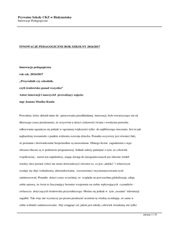 Prywatne Szkoły CKZ w Białymstoku Innowacje Pedagogiczne INNOWACJE PEDAGOGICZNE ROK SZKOLNY 2016/2017 Innowacja pedagogiczna rok szk. 2016/2017 „Przyrodnik czy szkodnik, czyli środowisko ponad wszystko” Autor innowacji i nauczyciel prowadzący zajęcia: mgr Joanna Monika Kunin Powodem, który skłonił mnie do opracowania przedkładanej innowacji, było towarzyszące mi od dłuższego czasu przekonanie, że oczywista u dzieci ciekawość świata i wrodzona potrzeba odkrywania ogranicza się jednak w ogromnej większości tylko do najbliższego otoczenia. Jest to jak najbardziej zrozumiałe z punktu widzenia rozwoju dziecka. Ponadto oczywisty jest również fakt, że poznanie i doświadczenie bezpośrednie są nieocenione. Dlatego liczne zagadnienia z tego obszaru obecne są w podstawie programowej. Jednak należy pamiętać o tym, że człowiek współczesny, nawet ten najmłodszy, mając dostęp do nieograniczonych już obecnie źródeł wiedzy chce poznać (choć nie może doświadczyć) również to, co jest „daleko” i właściwym wydaje się chęć wzbudzenia, ukierunkowania, rozszerzenia i usystematyzowania tych zainteresowań. Ponadto dzieci coraz wcześniej, ze względu na powszechną globalizację, zdają sobie sprawę, że świat to fascynujący bezmiar wzajemnie na siebie wpływających czynników zwłaszcza dotyczących środowiska przyrodniczego. Można się jednak w tym „oceanie’ informacji zagubić. Tak więc nie wystarczy po prostu przekazać uczniom tę wiedzę oczekując, że sama w sobie wzbudzi zainteresowanie. Aby osiągnąć cel, jakim jest młody człowiek świadomy nie tylko strona 1 / 8 Prywatne Szkoły CKZ w Białymstoku Innowacje Pedagogiczne bogactwa i różnorodności świata przyrody, ale też tego jak wszystkie jej elementy nawzajem na siebie oddziałują, konieczne jest nieszablonowe działanie. Tutaj otwiera się pole do działania dla nauczyciela kreatywnego, który „wymyśli” sposób dotarcia do tej naturalnej potrzeby poznawczej i nie stłumi jej szablonowymi metodami podawczymi. Innowacja polega na przygotowywaniu i przeprowadzeniu przez nauczyciela zajęć z zakresu zagadnień przyrodniczych w formie zamkniętych dwuetapowych jednostek tematycznych. Na stronie internetowej szkoły znajdzie się zaprojektowane przez nauczyciela logo, krótki opis innowacji oraz miejsce do sukcesywnego umieszczania informacji o przeprowadzonych zajęciach. Pierwsza godzina danej jednostki to prezentacja multimedialna, która nie jest tylko „wyświetlaniem” slajdów, lecz staje się interaktywnym narzędziem , przy użyciu którego uczeń może aktywnie uczestniczyć w zajęciach samodzielnie odkrywając poszczególne informacje, oglądając filmy, rozwiązując zadania itp. Następnie prezentacja umieszczana będzie na stronie internetowej szkoły w postaci linków systematycznie dodawanych w miarę pojawiania się nowych zagadnień. Dzięki temu po każdych zajęciach przy użyciu tablicy multimedialnej uczniowie mogą przez tydzień sięgać do danej prezentacji (lub w razie nieobecności na zajęciach zapoznać się z nią). Ponadto treści umieszczane w ten sposób dostępne będą również dla wszystkich osób, które zainteresuje określona tematyka. Druga godzina danej jednostki to gra planszowa oparta na założeniach popularnej gry „Węże i drabiny”. Uczniowie grają na dużej, podłogowej wersji planszy przygotowanej przez nauczyciela. W komplecie do planszy wykonane są również pionki do gry i bardzo duża kostka. Uczniowie losowo podzieleni na drużyny grają według trzech zasad: 1) ruch po rzucie kostką można wykonać wyłącznie po udzieleniu odpowiedzi na pytanie nauczyciela, 2) przed wężem może uchronić prawidłowa odpowiedź na pytanie, 3) z drabiny można skorzystać tylko w przypadku właściwej odpowiedzi na pytanie. Nauczyciel do każdej gry przygotowuje również zestaw pytań w oparciu o wcześniejszą prezentację strona 2 / 8 Prywatne Szkoły CKZ w Białymstoku Innowacje Pedagogiczne multimedialną. W każdej drużynie możliwe są konsultacje, lecz odpowiedzi udziela wylosowany wcześniej kapitan lub wskazana przez niego osoba. Pytania mają różny stopień trudności. Odpowiedź na pytanie nie musi mieć tylko formy werbalnej – może to być np. rysunek, odgłos, gestykulacja. Można także uzyskać prawo do dodatkowego rzutu, jeśli dana drużyna wykaże się wiadomościami z danej jednostki tematycznej, których nie zawierała prezentacja multimedialna. Ma to zachęcić uczniów do rozszerzania swojej wiedzy ponad to, co przygotował nauczyciel. Wygrana drużyna otrzymuje miano „Przyrodnika”, zaś przegrana „Szkodnika”. Ilość rozgrywek podczas jednych zajęć jest nieograniczona, jednak do każdej z nich przeprowadzane jest osobne losowanie drużyn. W ten sposób każde dziecko ma szansę znaleźć się w zwycięskiej drużynie. Dzięki uczestniczeniu w zajęciach uczeń wykształci w sobie osobistą postawę wobec przyrody. Poznając jej różnorodność będzie dużo bardziej świadomy, że jest jej integralną częścią. Nie tylko zdobędzie dodatkową wiedzę, lecz także rozwinie własne zainteresowania, zdolności i umiejętność twórczego myślenia i współpracy w grupie, będzie potrafił w sposób konsekwentny i dociekliwy poszukiwać rozwiązań sytuacji problemowej przejawiając inicjatywę i samodzielność. Dzięki zastosowanej metodzie, która łączy ciekawy sposób prezentacji wiadomości z niebanalną weryfikacją stopnia ich opanowania twórcze poznawanie przyrody pogłębi w nim zrozumienie wartości i poszanowanie każdej formy życia. Nauczy się również nie tylko zauważać związki przyczynowo-skutkowe w przyrodzie lecz utrwali się w nim jednolity obraz bytu ułatwiając mu drogę do samopoznania i samotworzenia. Użycie nieszablonowych metod nauczania w połączeniu z interesującymi treściami pozwoli uczniowi pełniej ukształtować holistyczną postawę wobe