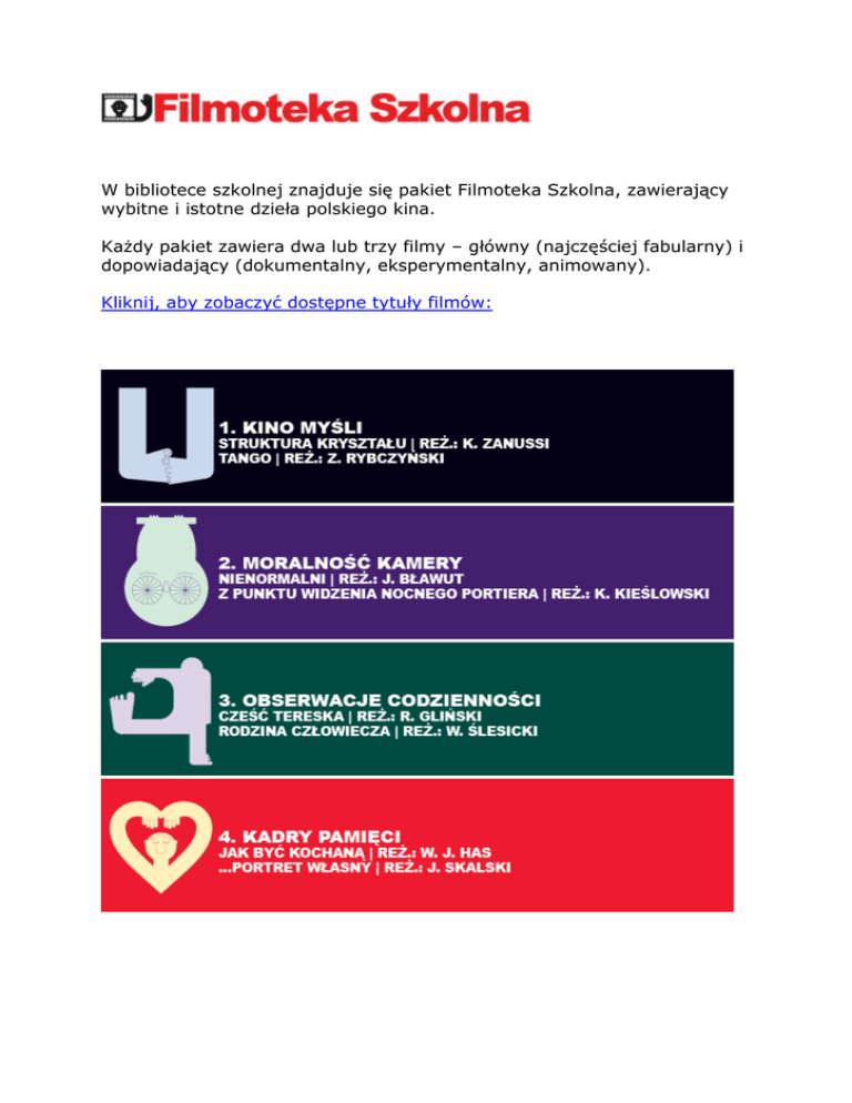 W bibliotece szkolnej znajduje się pakiet Filmoteka Szkolna, zawierający wybitne i istotne dzieła polskiego kina. Każdy pakiet zawiera dwa lub trzy filmy – główny (najczęściej fabularny) i dopowiadający (dokumentalny, eksperymentalny, animowany). Kliknij, aby zobaczyć dostępne tytuły filmów: Więcej informacji można znaleźć na stronie: http://www.filmotekaszkolna.pl/ LINKI DO CIEKAWYCH STRON: Kulturalna Polska http://klp.pl/ JĘZYK POLSKI http://www.polskina5.pl/ JĘZYK ANGIELSKI http://angielski.na6.pl/ HISTORIA http://historia.na6.pl/ WOS http://www.wosna5.pl/ GEOGRAFIA http://geografia.na6.pl/ ENCYKLOPEDIA PWN http://encyklopedia.pwn.pl/ MEGA SŁOWNIK http://megaslownik.pl/home SŁOWNIK WYRAZÓW OBCYCH http://www.slownik-online.pl/index.php Wirtualne galerie malarstwa http://artyzm.com/galeria.php http://www.pinakoteka.zascianek.pl/ http://sztuka.zaprasza.net/ http://www.malarze.com/?&l=pl http://www.malarze.info/ Biblioteka Literatury Polskiej w Internecie http://literat.ug.edu.pl/books.htm Biblioteka NARODOWA http://www.bn.org.pl/ Biblioteka RACZYŃSKICH http://www.bracz.edu.pl/ PEDAGOGICZNA Biblioteka PUBLICZNA http://www.pbp.poznan.pl/