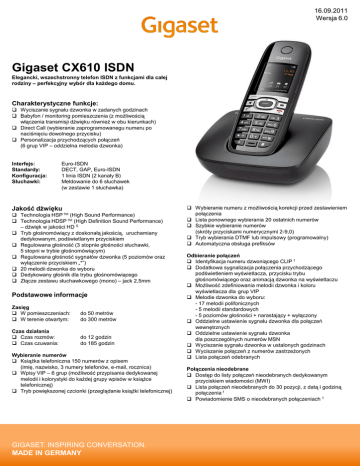 16.09.2011 Wersja 6.0 Gigaset CX610 ISDN Elegancki, wszechstronny telefon ISDN z funkcjami dla całej rodziny – perfekcyjny wybór dla każdego domu. Charakterystyczne funkcje: Wyciszanie sygnału dzwonka w zadanych godzinach Babyfon / monitoring pomieszczenia (z możliwością włączenia transmisji dźwięku również w obu kierunkach) Direct Call (wybieranie zaprogramowanegu numeru po naciśnięciu dowolnego przycisku) Personalizacja przychodzących połączeń (6 grup VIP – oddzielna melodia dzwonka) Interfejs: Standardy: Konfiguracja: Słuchawki: Euro-ISDN DECT, GAP, Euro-ISDN 1 linia ISDN (2 kanały B) Meldowanie do 6 słuchawek (w zestawie 1 słuchawka) Jakość dźwięku Technologia HSP TM (High Sound Performance) Technologia HDSP TM (High Definition Sound Performance) – dźwięk w jakości HD 5 Tryb głośnomówiący z doskonałą jakością, uruchamiany dedykowanym, podświetlanym przyciskiem Regulowana głośność (3 stopnie głośności słuchawki, 5 stopni w trybie głośnomówiącym) Regulowana głośność sygnałów dzwonka (5 poziomów oraz wyłączenie przyciskiem „*”) 20 melodii dzwonka do wyboru Dedykowany głośnik dla trybu głośnomówiącego Złącze zestawu słuchawkowego (mono) – jack 2,5mm Podstawowe informacje Zasięg W pomieszczeniach: W terenie otwartym: do 50 metrów do 300 metrów Czas działania Czas rozmów: Czas czuwania: do 12 godzin do 185 godzin Wybieranie numerów Książka telefoniczna 150 numerów z opisem (imię, nazwisko, 3 numery telefonów, e-mail, rocznica) Wpisy VIP – 6 grup (możliwość przypisania dedykowanej melodii i kolorystyki do każdej grupy wpisów w książce telefonicznej) Tryb powiększonej czcionki (przeglądanie książki telefonicznej) GIGASET. INSPIRING CONVERSATION. MADE IN GERMANY Wybieranie numeru z możliwością korekcji przed zestawieniem połączenia Lista ponownego wybierania 20 ostatnich numerów Szybkie wybieranie numerów (skróty przyciskami numerycznymi 2-9,0) Tryb wybierania DTMF lub impulsowy (programowalny) Automatyczna obsługa prefiksów Odbieranie połączeń Identyfikacja numeru dzwoniącego CLIP 1 Dodatkowa sygnalizacja połączenia przychodzącego podświetleniem wyświetlacza, przycisku trybu głośnomówiącego oraz animacją dzwonka na wyświetlaczu Możliwość zdefiniowania melodii dzwonka i koloru wyświetlacza dla grup VIP Melodie dzwonka do wyboru: - 17 melodii polifonicznych - 5 melodii standardowych - 5 poziomów głośności + narastający + wyłączony Oddzielne ustawienie sygnału dzwonka dla połączeń wewnętrznych Oddzielne ustawienie sygnału dzwonka dla poszczególnych numerów MSN Wyciszanie sygnału dzwonka w ustalonych godzinach Wyciszanie połączeń z numerów zastrzeżonych Lista połączeń odebranych Połączenia nieodebrane Dostęp do listy połączeń nieodebranych dedykowanym przyciskiem wiadomości (MWI) Lista połączeń nieodebranych do 30 pozycji, z datą i godziną połączenia 1 Powiadomienie SMS o nieodebranych połączeniach 1 16.09.2011 Wersja 6.0 Funkcje dodatkowe Plug&Play (rozpakuj, podłącz i rozmawiaj) Asystent konfiguracji ISDN Przypomnienie o urodzinach Budzik z funkcją drzemki Babyfon / monitoring pomieszczenia (z możliwością włączenia transmisji dźwięku również w obu kierunkach) Direct Call (wybieranie zaprogramowanegu numeru po naciśnięciu dowolnego przycisku) Data i czas chronione w przypadku utraty zasilania Możliwość edycji nazwy na liście słuchawek wewnętrznych Możliwość montażu na ścianie Anteny wewnętrzne Wyświetlacz i menu Wyświetlacz Podświetlany kolorowy wyświetlacz graficzny TFT (1,8”, 128x160pikseli, 65 tyś. kolorów) 2 schematy kolorów wyświetlacza Interfejs użytkownika z trybami: uproszczonym i zaawansowanym W trybie czuwania Wyświetlanie daty i godziny jako wygaszacza ekranu W trybie bezczynności Wyświetlanie: - daty i godziny - stanu naładowania akumulatorów - wewnętrznej nazwy słuchawki - siły sygnału i trybu Eco W trakcie rozmowy Wyświetlanie czasu trwania rozmowy Menu Wygodne w użyciu menu w 17 językach Menu oparte o ikony i teksty oraz przyciski funkcyjne wyświetlacza Klawiatura Ergonomiczna klawiatura z materiałów wysokiej jakości (technologia metaldome) 12 przycisków numerycznych oraz 9 przycisków funkcyjnych Pięciokierunkowy przycisk funkcyjny Podświetlana klawiatura (kolor bursztynowy) Podświetlane przyciski trybu głośnomówiącego i zakończenia wiadomości (MWI) Blokada klawiatury (długie naciśnięcie „#”) Wyłączenie dzwonka (długie naciśnięcie „*”) Przycisk Flash (R) – długie przyciśnięcie Pauza (P) GIGASET. INSPIRING CONVERSATION. MADE IN GERMANY Funkcje SMS Obsługa wiadomości SMS do 612 znaków 1 Pamięć na ok. 30 wiadomości SMS (przy 90 znakach na wiadomość) Skrzynki SMS dla poszczególnych numerów MSN Wysyłanie e-mail przez SMS 1 Zapisywanie numerów z wiadomości SMS w książce telefonicznej ECO-DECT Do 60% niższe zużycie energii2 (energooszczędny zasilacz impulsowy na wyposażeniu) Redukcja mocy nadawania prawie do zera po odstawieniu słuchawki do stacji bazowej (tylko przy 1 zalogowanej słuchawce) Tryb ECO – manualna redukcja mocy nadawania o 80% 3 Tryb ECO Plus – redukcja do 100% mocy nadawania dla wszystkich zalogowanych słuchawek4 Płynna redukcja mocy nadawania w zależności od odległości między stacją bazową a słuchawką Funkcje ISDN Obsługa 10 numerów MSN Synchronizacja czasu z linią ISDN Wyświetlanie numeru dzwoniącego / wywoływanego (CLIP / COLP) Blokada wyświetlania numeru dzwoniącego / wywoływanego (CLIR / COLR) Wstrzymywanie/konsultacja/przełączanie rozmowy (HOLD) Konferencja trójstronna (3PTY) Rozmowy oczekujące (CW) Przekierowanie połączeń (CF) Oddzwonienie w przypadku zajętości / braku odpowiedzi (CCBS / CCNR) Identyfikacja połączeń złośliwych (MCID) Informacja o koszcie (AOC-D, -E) Przekazanie wywołania (ECT) Współpracujące akcesoria Słuchawka mono ze złączem ja