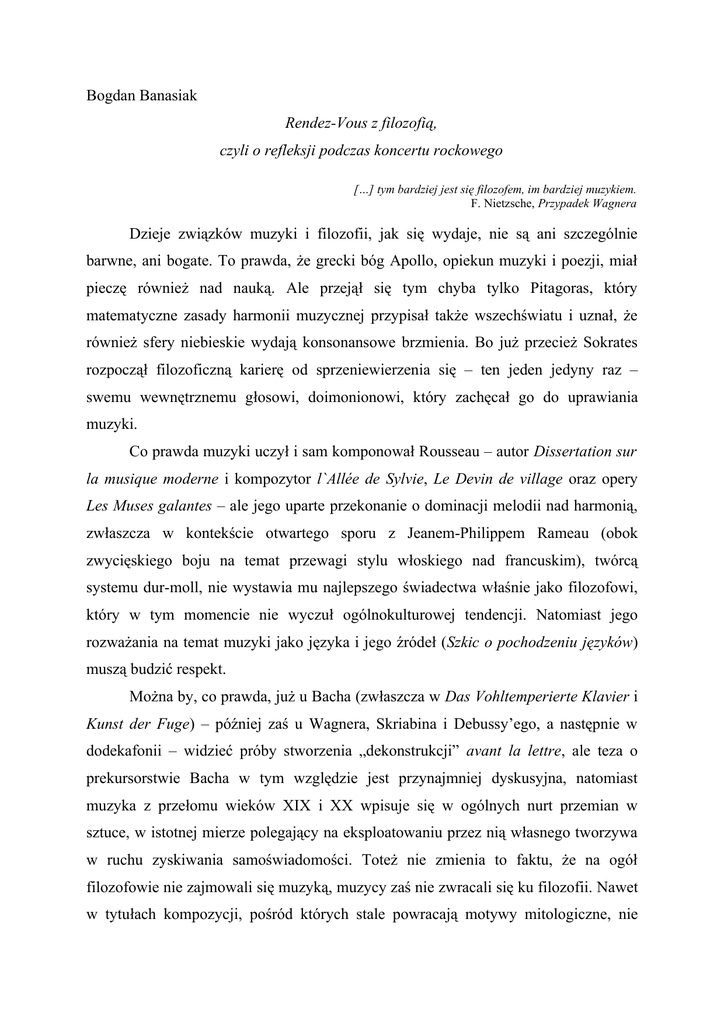 Bogdan Banasiak Rendez-Vous z filozofią, czyli o refleksji podczas koncertu rockowego […] tym bardziej jest się filozofem, im bardziej muzykiem. F. Nietzsche, Przypadek Wagnera Dzieje związków muzyki i filozofii, jak się wydaje, nie są ani szczególnie barwne, ani bogate. To prawda, że grecki bóg Apollo, opiekun muzyki i poezji, miał pieczę również nad nauką. Ale przejął się tym chyba tylko Pitagoras, który matematyczne zasady harmonii muzycznej przypisał także wszechświatu i uznał, że również sfery niebieskie wydają konsonansowe brzmienia. Bo już przecież Sokrates rozpoczął filozoficzną karierę od sprzeniewierzenia się – ten jeden jedyny raz – swemu wewnętrznemu głosowi, doimonionowi, który zachęcał go do uprawiania muzyki. Co prawda muzyki uczył i sam komponował Rousseau – autor Dissertation sur la musique moderne i kompozytor l`Allée de Sylvie, Le Devin de village oraz opery Les Muses galantes – ale jego uparte przekonanie o dominacji melodii nad harmonią, zwłaszcza w kontekście otwartego sporu z Jeanem-Philippem Rameau (obok zwycięskiego boju na temat przewagi stylu włoskiego nad francuskim), twórcą systemu dur-moll, nie wystawia mu najlepszego świadectwa właśnie jako filozofowi, który w tym momencie nie wyczuł ogólnokulturowej tendencji. Natomiast jego rozważania na temat muzyki jako języka i jego źródeł (Szkic o pochodzeniu języków) muszą budzić respekt. Można by, co prawda, już u Bacha (zwłaszcza w Das Vohltemperierte Klavier i Kunst der Fuge) – później zaś u Wagnera, Skriabina i Debussy’ego, a następnie w dodekafonii – widzieć próby stworzenia „dekonstrukcji” avant la lettre, ale teza o prekursorstwie Bacha w tym względzie jest przynajmniej dyskusyjna, natomiast muzyka z przełomu wieków XIX i XX wpisuje się w ogólnych nurt przemian w sztuce, w istotnej mierze polegający na eksploatowaniu przez nią własnego tworzywa w ruchu zyskiwania samoświadomości. Toteż nie zmienia to faktu, że na ogół filozofowie nie zajmowali się muzyką, muzycy zaś nie zwracali się ku filozofii. Nawet w tytułach kompozycji, pośród których stale powracają motywy mitologiczne, nie znajdziemy kategorii należących do systemu pojęciowego filozofii, bo np. Stworzenie świata Milhauda nawiązuje raczej do kosmogonii, a wątki refleksyjne u Messiaena mają walor nie tyle filozoficzny, ile mistyczno-religijny. Pewnym wyjątkiem był może Wagner, którego dramat muzyczny, realizacja dzieła totalnego (Gesamtkunstwerk), stanowił niejako efekt przemyśleń o charakterze filozoficznym. Ale wówczas wszyscy znali się na filozofii, bo w towarzystwie do dobrego tonu należało coś o niej wiedzieć, a poza tym ta wizja dramatu była zakorzeniona raczej w refleksji z zakresu filozofii sztuki. Czyżby zatem dopiero Nietzsche bardziej zbliżył oba regiony? Ale i on – jak Rousseau – wykazał pewną ślepotę: głęboka niechęć do ideowej (by nie rzec, ideologicznej) strony twórczości Wagnera (zrozumiała z powodu osobliwego flirtu kompozytora z chrześcijaństwem) odebrała mu możliwość obiektywnej oceny niedościgłej w warstwie czysto muzycznej twórczości autora Parsifala, toteż Nietzsche uznał, że „Wagner jest wielkim zepsuciem muzyki” (ale niejako mimochodem zauważył, że „w nieskończoność pomnożył możliwości językowe muzyki”). A poza tym, choć Nietzsche sam grywał i komponował, to jednak wartość muzyczna jego pieśni nie jest najwyższa, a dzieła symfoniczne stanowią raczej swoisty wyraz rodzenia się w jego umyśle chaosu (oraz pragnień samorealizacji na niwie muzyki) niż efekt talentu kompozytorskiego. Natomiast Nietzscheańska rewindykacja Dionizosa, boga tańczącego, wydobycie źródłowej dla tragedii roli muzyki, a wreszcie uwagi na jej temat, a nawet szersze analizy (gł. Ryszard Wagner w Bayreuth oraz Przypadek Wagnera) czynią z niego postać szczególną w kontekście relacji tych dwóch dziedzin. Trzeba będzie poczekać na Adorno i jego Filozofię nowej muzyki, choć to bodaj wyjątek (i przecież ograniczony) tylko potwierdzający regułę. Nic bodaj zatem nie zmienia faktu, że na ogół filozofia i muzyka nie idą w parze. Skąd zatem zamysł łączenia wykładu z filozofii z koncertem jazz-rockowym? Wydaje się, że współczesność zmienia nieco tę sytuację nieprzystawalności dwu tak różnych dziedzin. O ile bowiem Beatlesi – jak wprost twierdził Lennon – śpiewali tylko o miłości, to poczynania artystyczne wielu muzyków w jawny sposób przynajmniej ocierają się o wątki refleksyjne. Najlepszym dowodem będzie tutaj działalność Petera Townshenda z The Who, autora muzyki do filmów Tommy oraz Quadrophenia, Roberta Frippa, lidera King Crimson i inicjatora wielu przedsięwzięć muzycznych, czy wreszcie Franka Zappy, wręcz człowieka-instytucji. Na szczególne podkreślenie zasługuje też w tym względzie rola wielu bardów, którzy, korzystając ze skromniejszego instrumentarium, bym bardziej uwypuklają znaczenie przekazu słownego, jak choćby Bob Dylan, Joan Baez czy Tom Waits. Niemal bowiem tradycją dla części sceny rockowej stało się zabieranie głosu w kwestiach nurtujących świat współczesny (choćby wojny, przemoc, AIDS, głód, apartheid), ocena teraźniejszości (np. Ameryka pije i idzie do domu Franka Zappy), refleksja nad zagubieniem i rozterkami człowieka dzisiejszej doby (np. Logical Song Supertramp) czy namysł nad kształtem świata przyszłego (choćby słynny Schizofrenik XXI wieku z repertuaru King Crimson). Zważywszy zaś na medialny kształt naszych czasów i popularność tego rodzaju wykonawców, trudno wręcz przecenić skalę ich oddziaływania i możliwości wpływania na opinię publiczną. To przecież scena muzyczna w znacznej mierze nadawała kształt modom o wymiarze niemal ruchów społecznych, a w każdym razie ogólnych postaw i przekonań (modsi, rockersi, punk), a niektóre utwory 