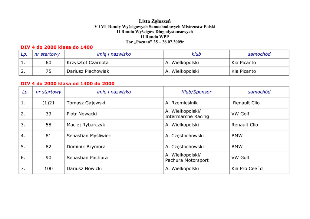 Lista Zgłoszeń V i VI Rundy Wyścigowych Samochodowych Mistrzostw Polski II Runda Wyścigów Długodystansowych II Runda WPP Tor „Poznań” 25 – 26.07.2009r DIV 4 do 2000 klasa do 1400 Lp. nr startowy imię i nazwisko klub samochód 1. 60 Krzysztof Czarnota A. Wielkopolski Kia Picanto 2. 75 Dariusz Piechowiak A. Wielkopolski Kia Picanto DIV 4 do 2000 klasa od 1400 do 2000 Lp. nr startowy 1. (1)21 2. imię i nazwisko Klub/Sponsor samochód Tomasz Gajewski A. Rzemieślnik Renault Clio 33 Piotr Nowacki A. Wielkopolski/ Intermarche Racing VW Golf 3. 58 Maciej Rybarczyk A. Wielkopolski Renault Clio 4. 81 Sebastian Myśliwiec A. Częstochowski BMW 5. 82 Dominik Brymora A. Częstochowski BMW 6. 90 Sebastian Pachura A. Wielkopolski/ Pachura Motorsport VW Golf 7. 100 Dariusz Nowicki A. Wielkopolski Kia Pro Cee`d DIV 4 pow. 2000 klasa do 3500 Lp. nr startowy imię i nazwisko Klub/Sponsor samochód 1. 12 Karolina Lampel-Czapka A. Wielkopolski/ Katrex Karolina Autosport Renault Megane 2. 14 Michał Słomian A. Wielkopolski Lotus Exige 3. 17 Krzysztof Spyra 4. 18 Paweł Szymański A. Rzemieślnik/ Katrex Karolina Autosport A. Rzemieślnik/ Katrex Karolina Autosport Renault Megane Renault Megane DIV 4 pow. 2000 klasa pow. 3500 Lp. nr startowy imię i nazwisko 1. 1 Maciej Stańco 1. 2 Mariusz Miękoś 2. 4 Adam Kornacki 3. 21 Robert Lukas 4. 63 Piotr Zaleski Klub/Sponsor A. Kielecki A. Łódzki/ Lukas Motorsport A. Polski/ otoMoto.pl Racing Team A. Kielecki/ Lukas Motorsport A. Gdański samochód Ferrari 430 Porsche 997 GT 3 Porsche 911 GT 3 Porsche 997 GT 3 Porsche 997 GT 3 Formuła Lp. nr startowy imię i nazwisko Klub/Sponsor samochód 1. 1 Tomas Chabr ACCR Tomis 2. 7 Zbynek Passer ACCR Van Dimen 3. 71 Martin Nowotny ACCR Ligier 4. 73 David Palmi ACCR Renault 5. 72 Jakub Harak ACCR Renault 6. 33 Jiri Jupa ACCR Tatuus DSMP Klasa 1 do 1400 nr Lp. Zespół/sponsor startowy 1. 60 Krzysztof Czarnota 2. 62 Gizelewski/Szcześniak 3. 100 Garstecki/ CzyŜ imię i nazwisko klub Krzysztof Czarnota A.Wielkopolski Gerard Gizelewski Mirosław Szcześniak Maciej Garstecki Artur CzyŜ A. A. A. A. Szczecin Szczecin Wielkopolski Wielkopolski samochód Kia Picanto Suzuki Swift Fiat Panda DSMP Klasa 2 (1400-2000) nr Lp. Zespół/sponsor startowy 1. 25 Nostress Motosport 2. 81 Myśliwiec/Brymora 3. 33 Intermarche Racing 4. 34 Bany/Kołakowski 5. 43 Michałowski 6. 90 Pachura Motorsport 7. 101 Tomaszewski/Wydra DSMP Klasa 3 (2000-3500) nr Lp. Zespół/sponsor startowy 1. 3 2. 12 3. 17 4. 77 GLADYSZ RACING Katrex Karolina Autosport Katrex Karolina Autosport Szwagierczak/ Obuchowski imię i nazwisko klub Marcin Gawarecki Marcin Kiwak Fabio Ghizzi Sebastian Myśliwiec Dominik Brymora Piotr Nowacki Tomasz Nowacki Adam Nowacki Piotr Bany Sebastian Kołakowski Aleksander Michałowski Michał Matuszyk Robert Kosiba Sebastian Pachura Jakub Marcinkiewicz Tomaszewski Maciej Wydra Marcin A. A. A. A. A. A. A. A. A. A. A. A. A. A. A. A. A. imię i nazwisko Gładysz Adam Gładysz Marcin Karolina Lampel-Czapka Mateusz Lisowski Krzysztof Spyra Paweł Szymański Zbigniew Szwagierczak Artur Obuchowski Piotr Magdziarz Rzemieślnik Rzemieślnik Polski Częstochowski Częstochowski Wielkopolski Wielkopolski Wielkopolski Rzemieślnik Rzemieślnik Lubelski Wałbrzyski Małopolski Wielkopolski Polski Polski Radomski klub A. A. A. A. A. A. A. A. A. Kielecki Kielecki Wielkopolski Kielecki Rzemieślnik Kielecki Wielkopolski Wielkopolski Wielkopolski samochód Renault Clio BMW VW Golf Alfa Romeo 156 BMW E 46 VW Golf Alfa Romeo 156 samochód VW Jetta Renault Megane Renault Megane Alfa Romeo GTV DSMP Klasa 4 (pow 3500) nr Lp. Zespół/sponsor startowy imię i nazwisko klub samochód Teodor Myszkowski Stefan Biliński Maciej Stańco Maciej Marcinkiewicz Enrico Buscema Luis Scarpaccio Fabio Ghizzi Matteo Cressoni A. Wielkopolski A. Wielkopolski A. Kielecki A. Rzemieślnik A. Wielkopolski A. Wielkopolski A. Polski A.D. Italia Lukas Motorsport Adam Kornacki A. Polski Porsche 997 GT3 Lukas Motorsport Mariusz Miękoś A. Łódzki Porsche 997 GT 3 1. 1 Lukas Motorsport 2. 2 MP SPORT Fusch StarMoto Racing Partners 3. 6 Nostress Motorsport 4. 21 5. 22 Porsche 997 GT 3 Ferrari 430 GT 3 Ferrari 360 WPP Lp. nr startowy imię i nazwisko klub Klasa samochód 1. 13 Bartosz Knast A. Wielkopolski Fiat Seicento 1 2. 14 Sebastian Karpiński A. Kielecki Fiat Cinquecento 1 3. 15 Bartosz Rybienik A. Rzemieślnik Fiat Seicento Abarth 1 4. 16 Piotr Bany A. Rzemieślnik Fiat Seicento 1 5. 17 Jakub Paczkowski A. Wielkopolski Fiat Cinquecento 1 6. 50 Krzysztof Mencel A. Wielkopolski Fiat Cinquecento 1 7. 69 Łukasz Kosiński A. Wielkopolski Fiat Seicento 1 8. 79 MOP A. Rzemieślnik Fiat Seicento 1 9. 80 Bartosz Kubicki A. Wielkopolski Fiat Seicento 1 10. 57 Piotr Gembicki A. Wielkopolski Honda CRX 2 11. 39 Paweł Grzywacz A. Polski Opel Kadett 3 12. 28 Krzysztof Hellwig A. Wielkopolski BMW Open 13. 53 Marcin Gawarecki A. Rzemieślnik Alfa Romeo Open 14. 62 Józef Dziób A. Wielkopolski Alfa Romeo Open 15. 65 Jarosław Kamiński A. Łódzki BMW Alpinie Open 16. 76 Bartosz Gradowski A. Kielecki Fiat Cinquecento Open