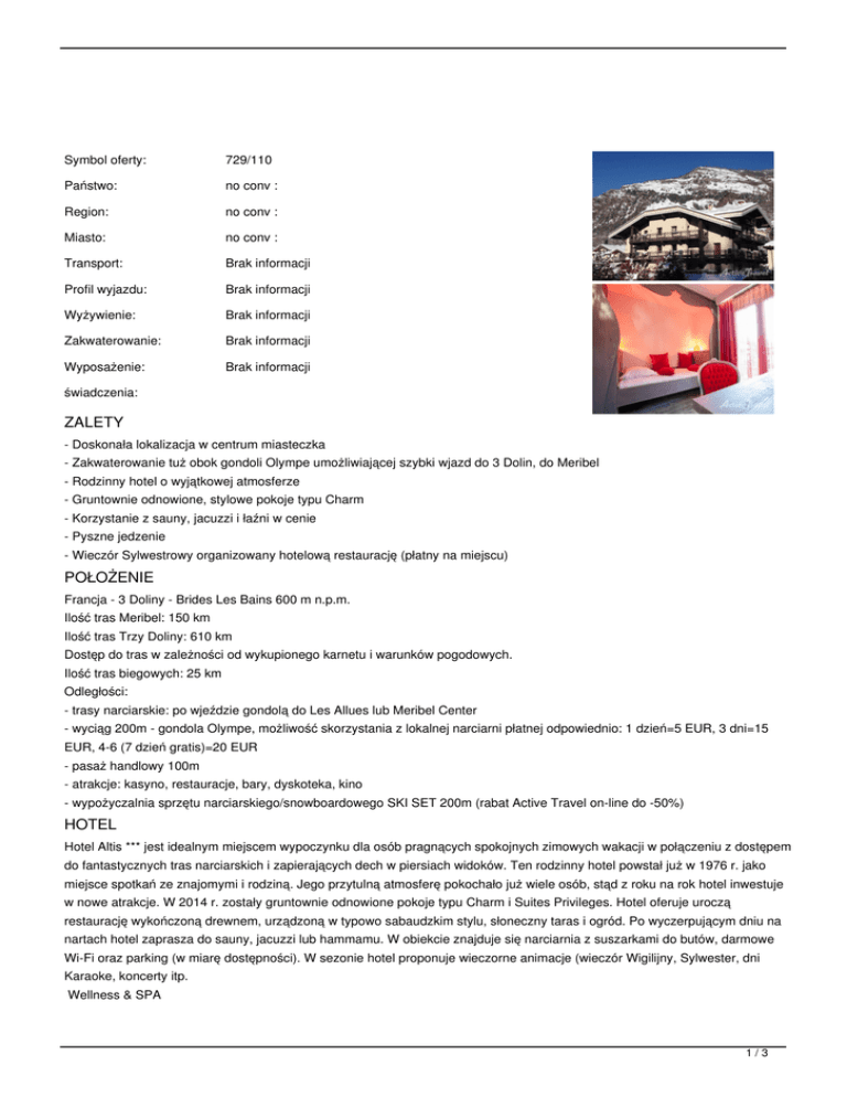 Symbol oferty: 729/110 Państwo: no conv : Region: no conv : Miasto: no conv : Transport: Brak informacji Profil wyjazdu: Brak informacji Wyżywienie: Brak informacji Zakwaterowanie: Brak informacji Wyposażenie: Brak informacji świadczenia: ZALETY - Doskonała lokalizacja w centrum miasteczka - Zakwaterowanie tuż obok gondoli Olympe umożliwiającej szybki wjazd do 3 Dolin, do Meribel - Rodzinny hotel o wyjątkowej atmosferze - Gruntownie odnowione, stylowe pokoje typu Charm - Korzystanie z sauny, jacuzzi i łaźni w cenie - Pyszne jedzenie - Wieczór Sylwestrowy organizowany hotelową restaurację (płatny na miejscu) POŁOŻENIE Francja - 3 Doliny - Brides Les Bains 600 m n.p.m. Ilość tras Meribel: 150 km Ilość tras Trzy Doliny: 610 km Dostęp do tras w zależności od wykupionego karnetu i warunków pogodowych. Ilość tras biegowych: 25 km Odległości: - trasy narciarskie: po wjeździe gondolą do Les Allues lub Meribel Center - wyciąg 200m - gondola Olympe, możliwość skorzystania z lokalnej narciarni płatnej odpowiednio: 1 dzień=5 EUR, 3 dni=15 EUR, 4-6 (7 dzień gratis)=20 EUR - pasaż handlowy 100m - atrakcje: kasyno, restauracje, bary, dyskoteka, kino - wypożyczalnia sprzętu narciarskiego/snowboardowego SKI SET 200m (rabat Active Travel on-line do -50%) HOTEL Hotel Altis *** jest idealnym miejscem wypoczynku dla osób pragnących spokojnych zimowych wakacji w połączeniu z dostępem do fantastycznych tras narciarskich i zapierających dech w piersiach widoków. Ten rodzinny hotel powstał już w 1976 r. jako miejsce spotkań ze znajomymi i rodziną. Jego przytulną atmosferę pokochało już wiele osób, stąd z roku na rok hotel inwestuje w nowe atrakcje. W 2014 r. zostały gruntownie odnowione pokoje typu Charm i Suites Privileges. Hotel oferuje uroczą restaurację wykończoną drewnem, urządzoną w typowo sabaudzkim stylu, słoneczny taras i ogród. Po wyczerpującym dniu na nartach hotel zaprasza do sauny, jacuzzi lub hammamu. W obiekcie znajduje się narciarnia z suszarkami do butów, darmowe Wi-Fi oraz parking (w miarę dostępności). W sezonie hotel proponuje wieczorne animacje (wieczór Wigilijny, Sylwester, dni Karaoke, koncerty itp. Wellness & SPA 1/3 - sauna, hammam, prysznice, jacuzzi - otwarte codziennie bez dodatkowych opłat dla gości hotelowych - seans refleksologii na zamówienie - masaże na zamówienie za dodatkową opłatą Restauracja Hotelowa restauracja Vel Vert czynna jest codziennie od godziny 19.00 i zaprasza do swoich uroczych drewnianych wnętrz lub na słoneczny taras. Szef kuchni oferuje zdrowe, lekkie dania oraz wyrafinowane smaki i aromaty tradycyjnej kuchni sabaudzkiej. Restauracja oferuje również specjalne menu dietetyczne nadzorowane przez dietetyka składające się z okresowo występujących i regionalnych produktów. Bar Hotelowy bar posiada bogatą ofertę koktajli, napoi alkoholowych i bezalkoholowych, aperitif. Wszystko to w otoczeniu widoków na Masyw Grand Bec. Bar czynny od 16.00 Recepcja Czynna od 8.00 do 22.00 Zakwatowanie od 14.00 Wykwaterowanie do 10.00 POKOJE Hotel dysponuje 28 komfortowymi pokojami, w większości z balkonami, zlokalizowanymi w głównym budynku (pokoje Charm, Privilege, Cocoon) lub w chalet (pokoje Standard). DBL Standard (12-14 m2)- pokój 2 osobowy DBL Charm (12-16 m2) - pokój 2 osobowy Familiales Coccon (21-30 m2) - pokój dla 2-4 osób Suites Privilege Duplex (40-50 m2) - pokój dla 3-5 osób SGL - pokój typu Standard do wykorzystania dla 1 osoby. Wszystkie pokoje posiadają balkon. Wyposażone są w łóżka podwójne (małżeńskie) lub łóżka pojedyncze, a także pogrubione ściany dla komfortu akustycznego. Łazienki posiadają wannę lub prysznic, WC, suszarkę do włosów. W pokojach sejf, telefon, TV z Canal +, dostęp do Wi-Fi. Przy 2 pełnopłatnych rodzicach dzieci do 4 lat bezpłatnie na łóżeczku dla dzieci. Dzieci od 5 do 10 lat na dostawce -50%. Zwierzęta są akceptowane w hotelu i płatne 9 EUR za dzień. WYŻYWIENIE Hotelowa restauracja zaprasza do swoich uroczych drewnianych wnętrz lub na słoneczny taras. Szef kuchni oferuje zdrowe, lekkie dania oraz wyrafinowane smaki i aromaty tradycyjnej kuchni sabaudzkiej. Restauracja oferuje również specjalne menu dietetyczne nadzorowane przez dietetyka składające się z okresowo występujących i regionalnych produktów. Wyżywienie HB w cenie (śniadania i kolacje) - śniadania w formie bufetów serwowane od 7.00 do 9.30, kolacje serwowane od 19.00 z menu na dany dzień lub z karty restauracyjnej. Możliwość zamówienia dań wegetariańskich, bezglutenowych, bez mięsa wieprzowego). Kolacja Sylwestrowa - w dniu 31 grudnia hotelowa restauracja proponuje specjalne menu sylwestrowe. Prosimy o wcześniejszą rezerwację miejsc w restauracji na ten szczególny wieczór. Kolacja sylwestrowa płatna jest na miejscu w recepcji. CENA Cena zawiera: - zakwaterowanie w wybranym pokoju - nielimitowany wstęp do sauny, hammamu, jacuzzi, - wyżywienie HB (śniadania i obiadokolacje), - obowiązkowe podstawowe ubezpieczenie KL, NNW, - korzystanie z narciarni, - korzystanie z TV, - Internet WIFI w pokojach (limitowany), 2/3 - opiekę pilota lub rezydenta - miejsce parkingowe (w miarę dostępności miejsc, nie ma możliwości rezerwacji) - Samolot: przelot w obie strony Warszawa-Genewa z przesiadką w Zurichu, bagaż rejestrowany, bagaż sportowy (1 zestaw narciarski/snowboardowy), bagaż podręczny, transfer, opłaty lotniskowe i paliwowe Cena nie zawiera dopłat obowiązkowych: - opłaty klimatycznej 0,93 EUR/osoba/dzień, - kolacji Sylwestrowej płatnej na miejscu Cena nie zawiera dopłat opcjonalnych: - napoi do obiadokolacji, - pobytu małych zwierząt 9 EUR/dzień, - karnetu narciarskiego, - ubezpieczenia narciarskiego SKI 50 PLN/os/6 dni - ubezpieczenia od kosztów rezygnacji 3% AXA (wariant zwrotu 100% zgnodnie z warunkami ubezpieczyciela), - ubezpieczenia od chorób przewlekłych, - transportu w przypadku opcji na dojazd w