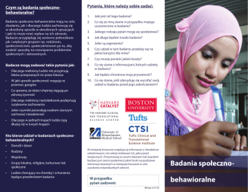 Czym są badania społecznobehawioralne? Pytania, które należy sobie zadać: 1. Jaki jest cel tego badania? Badania społeczno-behawioralne mają na celu zbadanie, jak i dlaczego ludzie zachowują się w określony sposób w określonych sytuacjach i jaki to może mieć wpływ na ich zdrowie. Badacze przyglądają się zarówno jednostkom jak i większym grupom np. rodzinom, społecznościom, społeczeństwom po to, aby znaleźć sposoby na rozwiązanie problemów społecznych i zdrowotnych. 2. Co się ze mną stanie w przypadku mojego uczestnictwa w badaniu? 3. Jakiego rodzaju pytań mogę się spodziewać? 4. Jak długo będzie trwało badanie? 5. Jakie są zagrożenia? 6. Czy udział w tym badaniu przełoży się na jakieś korzyści dla mnie? 7. Czy muszę ponieść jakieś koszty? 8. Co się stanie z informacjami, których udzielę w badaniu? Jak będzie chroniona moja prywatność? Badacze mogą zadawać takie pytania jak: • Dlaczego niektórzy ludzie nie przyjmują leków przepisanych im przez lekarza 9. • W jaki sposób społeczność reagują na przemoc gangów 10. Co się stanie, jeśli zdecyduję się wycofać swój udział w badaniu przed jego zakończeniem? • Co sprawia, że dzieci chętniej sięgają po zdrową żywność • Dlaczego niektórzy nastolatkowie podejmują ryzykowne zachowania • Jakie czynniki pozwalają osobom starszym zachować niezależność • Dlaczego w jednych krajach ludzie żyją dłużej niż w innych krajach Kto bierze udział w badaniach społecznobehawioralnych? • Dorośli i dzieci • Rodziny • Wspólnoty • Grupy lokalne, religijne, kulturowe lub społeczne • Ludzie chorujący na choroby i schorzenia będące przedmiotem badania W niniejszej broszurze znajdują się informacje o charakterze szkoleniowym; nie należy traktować ich, jako porad medycznych. Porozmawiaj ze swoim lekarzem lub zespołem badawczym zanim podejmiesz jakieś kroki na podstawie informacji zawartych w niniejszej broszurze w celu uzyskania indywidualnych zaleceń. Badania społecznobehawioralne W przypadku pytań zadzwoń: Wersja nr (v1.0) w Formularzu świadomej zgody. Zespół wytłumaczy ci cele badania oraz możliwe zagrożenia oraz korzyści wynikające z udziału. Jeśli czegoś nie rozumiesz, poproś o pomoc. Nikt nie powinien wywierać na ciebie presji lub ciebie popędzać. Uczestnictwo w badaniu klinicznym jest zupełnie dobrowolne – to twoja decyzja. Jakie ryzyko związane jest z uczestnictwem w badaniach społeczno-behawioralnych? To ty decydujesz o swoim udziale w badaniu klinicznym. Uzyskaj niezbędne informacje. Zadawaj pytania. Oczekuj odpowiedzi na zadane pytania. Z czym wiąże się udział w badaniach społeczno-behawioralnych? Udział w badaniach społeczno-behawioralnych często oznacza udzielanie odpowiedzi na pytania zawarte w ankiecie, na które należy udzielić odpowiedzi (kwestionariusze) lub też udzielenie odpowiedzi na pytania zadawane przez badacza przez telefon. W niektórych badaniach badacze mogą chcieć z tobą porozmawiać lub zadać ci pytania, tak aby uzyskać odpowiedź na temat twoich odczuć na wybrane tematy. W innych badaniach badacze obserwują pacjentów, którzy wykonują określone czynności. Jeszcze inne badania mogą polegać na pozyskiwaniu danych z twojej karty choroby. Niektóre badania nie przełożą się na żadne korzyści dla ciebie jako jednostki, ale mogą pomóc innym ludziom w przyszłości. Badacze mogą poprawić zdrowie mieszkańców społeczności lub pomóc grupie osób z określonymi chorobami. Zanim zdecydujesz się na udział w tym badaniu musisz zrozumieć jego cel. Musisz wiedzieć jakie są oczekiwania wobec ciebie oraz ile czasu zajmie ci udział w badaniu oraz czy uzyskasz z tego tytułu jakieś wynagrodzenie. Uczestnictwo w badaniu klinicznym wymaga zgody. Wprowadzono szereg środków zabezpieczających, które mają na celu zapewnienie bezpieczeństwa ochotnikom biorącym udział w badaniu (zwanymi również „uczestnikami badania”) oraz zapewnienie im traktowania z należnym szacunkiem. Zespół badawczy omówi z tobą informacje zawarte Najczęstszym zagrożeniem związanym z udziałem w badaniach społecznobehawioralnych jest to, że informacje prywatne, które przekażesz badaczom mogą trafić przypadkiem w niepowołane ręce. Badacze poinformują ciebie, w jaki sposób będą chronić poufność twoich danych. Zazwyczaj badacze w swoich publikacjach nie zdradzają tożsamości uczestników badań. Niektóre pytania zadawane przez badaczy mogą wydawać ci się kłopotliwe. To ty podejmujesz decyzję czy chcesz odpowiedzieć na pytanie, które wydaje ci się kłopotliwe. Możesz zakończyć rozmowę w każdej chwili. Szczególne zagrożenia zostały przedstawione bardziej szczegółowo w Formularzu świadomej zgody. Zanim zdecydujesz się na udział w badaniu musisz znać ryzyko związane z udziałem.