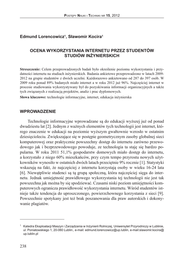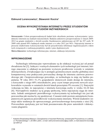 Postępy Nauki i Techniki nr 15, 2012 Edmund Lorencowicz1, Sławomir Kocira1 OCENA WYKORZYSTANIA INTERNETU PRZEZ STUDENTÓW STUDIÓW INŻYNIERSKICH Streszczenie: Celem przeprowadzonych badań było określenie poziomu wykorzystania i przydatności internetu na studiach inżynierskich. Badania ankietowe przeprowadzono w latach 20092012 na grupie studentów z dwóch uczelni. Każdorazowo ankietowano od 287 do 397 osób. W 2009 roku ponad 89% badanych miało internet a w roku 2012 już 96%. Najczęściej internet w procesie studiowania wykorzystywany był do pozyskiwania informacji organizacyjnych a także tych związanych z realizacją projektów, analiz i prac dyplomowych. Słowa kluczowe: technologie informacyjne, internet, edukacja inżynierska WPROWADZENIE Technologie informacyjne wprowadzane są do edukacji wyższej już od ponad dwudziestu lat [2]. Jednym z ważnych elementów tych technologii jest internet, którego znaczenie w edukacji na poziomie wyższym gwałtownie wzrosło w ostatnim dziesięcioleciu. Zwiększające się w postępie geometrycznym zasoby globalnej sieci komputerowej oraz praktycznie powszechny dostęp do internetu zarówno przewodowego jak i bezprzewodowego powoduje, ze technologia ta staję się bardzo popularna. W roku 2011 51,1% gospodarstw domowych miało dostęp do internetu, a korzystało z niego 60% mieszkańców, przy czym tempo przyrostu nowych użytkowników wynosiło w ostatnich dwóch latach przeciętnie 9% rocznie [1]. Statystyki wskazują na fakt, że najczęściej z internetu korzystają osoby w wieku 16-24 lata [6]. Niewątpliwie studenci są tą grupą społeczną, która najczęściej sięga do internetu. Jednak umiejętność prawidłowego wykorzystania tej technologii nie jest tak powszechna jak można by się spodziewać. Czasami niski poziom umiejętności komputerowych ogranicza prawidłowość wykorzystania internetu. Wśród studentów istnieje także tendencja do uproszczonego, powierzchownego korzystania z sieci [9]. Powszechnie spotykany jest też brak poszanowania dla praw autorskich i dokonywanie plagiatów. 1 Katedra Eksploatacji Maszyn i Zarządzania w Inżynierii Rolniczej, Uniwersytet Przyrodniczy w Lublinie, ul. Poniatowskiego 1, 20-060 Lublin:, e-mail: [email protected], e-mail:slawomir.kocira@ up.lublin.pl 238 Postępy Nauki i Techniki nr 15, 2012 METODYKA BADAŃ Celem przeprowadzonych badań była ocena przydatności internetu w trakcie studiów oraz zaangażowania nauczycieli akademickich w stosowanie technologii informacyjnych w procesie kształcenia. Ocenę oparto o opinie studentów zebrane w trakcie badań przeprowadzonych w latach 2010, 2011 i 2012 na przełomie roku na grupie od 300 do 400 studentów z Uniwersytetu Przyrodniczego w Lublinie oraz Państwowej Wyższej Szkoły Zawodowej w Chełmie [4, 5]. Badaniami ankietowymi objęto słuchaczy studiów pierwszego stopnia z kierunków inżynierskich: edukacja techniczno-informatyczna, rolnictwo, technika rolnicza i leśna, transport oraz zarządzanie i inżynieria produkcji. Ankieta zawierała pytania pogrupowane w trzy bloki dotyczące użytkowanego sprzętu komputerowego i sposobu jego wykorzystania; dostępu do internetu, rodzaju informacji i częstotliwości korzystania z zasobów internetowych oraz wykorzystania technologii informacyjnych przez studentów i nauczycieli akademickich w procesie kształcenia. Zebrane dane po weryfikacji i sprawdzeniu kompletności zestawiono w arkuszu Excel, za pomocą którego wykonano analizę. CHARAKTERYSTYKA BADANEJ POPULACJI W badaniach prowadzonych w okresie 2009-2012 przeważali studenci z kierunku „zarządzanie i inżynieria produkcji” – 43% oraz „rolnictwo” – 36%. Najwięcej było studentów z drugiego – 40% i pierwszego roku studiów – 34%. Udział studentów studiów niestacjonarnych wynosił jedynie 2% (rys. 1). Rys. 1. Struktura ankietowanych według kierunku i roku studiów Fig. 1. Structure of surveyed students according course and year of study Źródło: Badania własne W latach badań wzrastała dostępność do internetu. W roku 2009/10 bezpośredni dostęp do internetu miało 84,9% ankietowanych a w roku 2011/12 już udział ten wynosił 96,5% (rys. 2). 239 Postępy Nauki i Techniki nr 15, 2012 Rys. 2. Dostępność do internetu w badanych populacjach studentów Fig. 2. Internet access in surveyed students population Źródło: Badania własne Należy też podkreślić fakt, że pomimo powszechności technologii informacyjnych nie każdy badany student dysponował własnym komputerem. W roku 2009/10 było to 18 studentów, którzy stanowili 6,3% populacji, w 2010/11 – 16 studentów (5%) a w ostatnim roku badań 17 studentów (4,3%). Byli to głównie studenci pierwszych lat i analiza wskazuje, że w kolejnych latach blisko 100% badanych dysponowało komputerami. Jest to zgodne z wynikami uzyskanymi w badaniach przeprowadzonych przez firmę Samsung Electronics, gdzie udział studentów nie posiadających komputera wahał się od 6 (duże miasta) do 9% (małe miasta) [7]. WYKORZYSTANIE INTERNETU W kolejnych latach badań wzrastał udział osób korzystających z internetu codziennie z 63,5% w badaniach 2009/10 do 74,1% w roku 201/12 (rys.3). Kilka razy w tygodniu korzystało z internetu około 20% ankietowanych, a jedynie 4,8% raz w tygodniu lub rzadziej. Rozwój technologii i coraz powszechniejsza dostępność do sieci, m.in. poprzez telefony komórkowe powoduje, że zaczyna zacierać się różnica w częstotliwości i prawdopodobnie w najbliższym okresie studenci będą korzystać z internetu tak samo często jak z telefonów komórkowych, a jedynie nieliczne osoby będą unikać tej technologii. Nie stwierdzono przypadków nieskorzystania z internetu, choć jest to prawdopodobne i z innych badań wynika, że udział takich studentów wynosił 0,8% [9]. Można sądzić, że nie dotyczy to kierunków inżynierskich. Już teraz 90,6% ankietowanych określiła wysoką przydatność internetu w stu