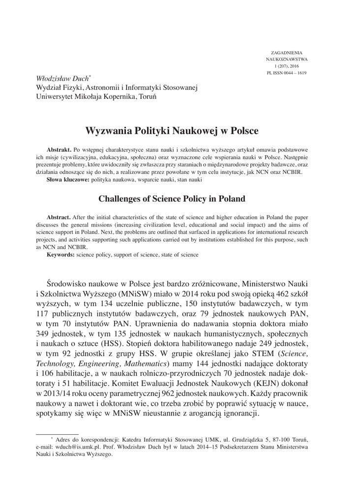 Włodzisław Duch* Wydział Fizyki, Astronomii i Informatyki Stosowanej Uniwersytet Mikołaja Kopernika, Toruń ZAGADNIENIA NAUKOZNAWSTWA 1 (207), 2016 PL ISSN 0044 – 1619 Wyzwania Polityki Naukowej w Polsce Abstrakt. Po wstępnej charakterystyce stanu nauki i szkolnictwa wyższego artykuł omawia podstawowe ich misje (cywilizacyjna, edukacyjna, społeczna) oraz wyznaczone cele wspierania nauki w Polsce. Następnie prezentuje problemy, które uwidoczniły się zwłaszcza przy staraniach o międzynarodowe projekty badawcze, oraz działania odnoszące się do nich, a realizowane przez powołane w tym celu instytucje, jak NCN oraz NCBIR. Słowa kluczowe: polityka naukowa, wsparcie nauki, stan nauki Challenges of Science Policy in Poland Abstract. After the initial characteristics of the state of science and higher education in Poland the paper discusses the general missions (increasing civilization level, educational and social impact) and the aims of science support in Poland. Next, the problems are outlined that surfaced in applications for international research projects, and activities supporting such applications carried out by institutions established for this purpose, such as NCN and NCBIR. Keywords: science policy, support of science, state of science Środowisko naukowe w Polsce jest bardzo zróżnicowane, Ministerstwo Nauki i Szkolnictwa Wyższego (MNiSW) miało w 2014 roku pod swoją opieką 462 szkół wyższych, w tym 134 uczelnie publiczne, 150 instytutów badawczych, w tym 117 publicznych instytutów badawczych, oraz 79 jednostek naukowych PAN, w tym 70 instytutów PAN. Uprawnienia do nadawania stopnia doktora miało 349 jednostek, w tym 135 jednostek w naukach humanistycznych, społecznych i naukach o sztuce (HSS). Stopień doktora habilitowanego nadaje 249 jednostek, w tym 92 jednostki z grupy HSS. W grupie określanej jako STEM (Science, Technology, Engineering, Mathematics) mamy 144 jednostki nadające doktoraty i 106 habilitacje, a w naukach rolniczo-przyrodniczych 70 jednostek nadaje doktoraty i 51 habilitacje. Komitet Ewaluacji Jednostek Naukowych (KEJN) dokonał w 2013/14 roku oceny parametrycznej 962 jednostek naukowych. Każdy pracownik naukowy a nawet i doktorant wie, co trzeba zrobić by poprawić sytuację w nauce, spotykamy się więc w MNiSW nieustannie z arogancją ignorancji. * Adres do korespondencji: Katedra Informatyki Stosowanej UMK, ul. Grudziądzka 5, 87-100 Toruń, e-mail: [email protected]. Prof. Włodzisław Duch był w latach 2014–15 Podsekretarzem Stanu Ministerstwa Nauki i Szkolnictwa Wyższego. 140 WŁODZISŁAW DUCH Pomimo wielkiego zróżnicowania jednostek naukowych możemy liczyć na dość powszechną zgodę co do misji i celów wspierania nauki. Za misję nauki uznać można 3 główne kierunki, związane z badaniami podstawowymi, kształceniem i badaniami stosowanymi. Są to następujące misje: 1. Cywilizacyjna – badania naukowe to fundament rozwoju najbogatszych i najbardziej zaawansowanych cywilizacyjnie krajów. 2. Edukacyjna – kształcenie kompetentnych kadr, kreatywnych absolwentów. 3. Społeczna – upowszechnianie wyników badań naukowych, kształtowanie racjonalnych postaw społecznych, zastosowanie zdobyczy nauki w praktyce: w gospodarce, kulturze i oświacie oraz administracji i usługach publicznych. Nauka zamienia pieniądze w wiedzę, a innowacje wiedzę w pieniądze. Naukowcy nie lubią mówić o pieniądzach, ale bez rozwoju gospodarki nie będzie nas stać na finansowanie nauki. Szersza zgoda możliwa jest również w dziedzinie ogólnych celów, które chcemy osiągnąć. 1. Podwyższenie poziomu kadry naukowej i badań prowadzonych w jednostkach naukowych; w porównaniu z najbardziej rozwiniętymi krajami nasz wkład do światowej nauki jest nadal skromny. 2. Poprawa funkcjonowania systemu nauki i szkolnictwa wyższego w Polsce. Potrzebna jest bardziej przemyślana polityka naukowa, ocena różnorakich korzyści z finansowania całego systemu, barier rozwoju i możliwej optymalizacji działań. 3. Zwiększenie oddziaływania nauki z otoczeniem społecznym, gospodarczym i międzynarodowym, zwiększenie wpływu naszych badań naukowych na gospodarkę w globalizującym się świecie, wprowadzanie innowacji społecznych i większe oddziaływania na naukę światową. Spróbuję tu rozwiać kilka mitów, które powielają media i w ten sposób utrwalają się w pamięci naukowców, ale też i polityków. W zależności od sposobu oceny w szeroko rozumianej nauce w ekwiwalentach pełnego czasu pracy (EPC) pracuje u nas około 71,5 tysiąca osób ze stopniem doktora lub wyższym (Eurostat 2013), o 4,5 tysiąca więcej niż w 2012 roku. W sumie w systemie POLON zarejestrowanych jest nieco ponad 103 tysięcy osób. Raport GUS ocenia liczbę osób zajmujących się działalnością badawczo-rozwojową w 2014 roku na 153,5 tysiąca (wzrost w ciągu roku o 7,8 tysiąca), z czego 60,3 tys. to kobiety. Ta liczba obejmuje różne laboratoria prowadzące prace dla przemysłu, prace projektowe lub czysto usługowe. Są to głównie osoby z wykształceniem w naukach technicznych, ścisłych i przyrodniczych. Duże firmy przemysłowe, które tworzą dochód narodowy, takie jak Intel, zatrudniają również humanistów, ale jest to około 1% wszystkich pracowników tych firm. 141 WYZWANIA POLITYKI NAUKOWEJ W POLSCE Rysunek 1. Uprawienia uczelni do nadawania stopni naukowych ϳϬ ϲϲ ƵƉƌĂǁŶŝĞŶŝĂĚŽŶĂĚĂǁĂŶŝĂƐƚŽƉŶŝĂĚŽŬƚŽƌĂ ƵƉƌĂǁŶŝĞŶŝĂĚŽŶĂĚĂǁĂŶŝĂƐƚŽƉŶŝĂĚŽŬƚŽƌĂŚĂďŝůŝƚŽǁĂŶĞŐŽ ϲϬ ϱϰ ϰϵ ϱϬ ϰϯ ϰϬ ϰϬ ϯϳ ϯϱ ϯϰ ϯϰ ϯϬ Ϯϵ ϯϬ ϯϵ ϯϳ Ϯϲ ϮϮ Ϯϭ ϮϬ ϭϬ Ϭ ŚƵŵĂŶŝƐƚLJĐnjŶĞ ƐƉŽųĞĐnjŶĞ ƉƌnjLJƌŽĚŶŝĐnjĞ ƑĐŝƐųĞ ƚĞĐŚŶŝĐnjŶĞ ƌŽůŶŝĐnjĞ ŵĞĚLJĐnjŶĞ ŽƐnjƚƵĐĞ Źródło: opracowanie własne. Uczelni wyższych mamy trzy razy więcej niż Wielka Brytania. Po okresie szybkiego wzrost