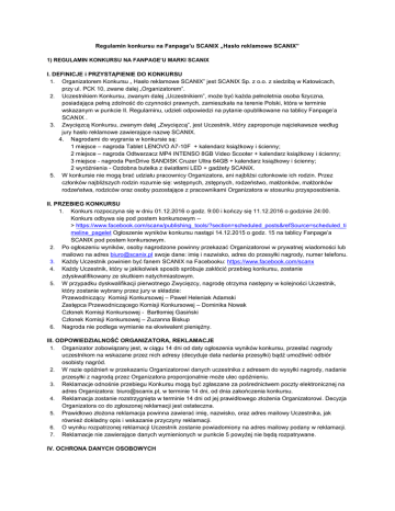 Regulamin konkursu na Fanpage'u SCANIX „Hasło reklamowe SCANIX” 1) REGULAMIN KONKURSU NA FANPAGE’U MARKI SCANIX I. DEFINICJE i PRZYSTĄPIENIE DO KONKURSU 1. Organizatorem Konkursu „ Hasło reklamowe SCANIX” jest SCANIX Sp. z o.o. z siedzibą w Katowicach, przy ul. PCK 10, zwane dalej „Organizatorem”. 2. Uczestnikiem Konkursu, zwanym dalej „Uczestnikiem”, może być każda pełnoletnia osoba fizyczna, posiadająca pełną zdolność do czynności prawnych, zamieszkała na terenie Polski, która w terminie wskazanym w punkcie II. Regulaminu, udzieli odpowiedzi na pytanie opublikowane na tablicy Fanpage’a SCANIX . 3. Zwycięzcą Konkursu, zwanym dalej „Zwycięzcą”, jest Uczestnik, który zaproponuje najciekawsze według jury hasło reklamowe zawierające nazwę SCANIX. 4. Nagrodami do wygrania w konkursie są: 1 miejsce – nagroda Tablet LENOVO A7-10F + kalendarz książkowy i ścienny; 2 miejsce – nagroda Odtwarzacz MP4 INTENSO 8GB Video Scooter + kalendarz książkowy i ścienny; 3 miejsce - nagroda PenDrive SANDISK Cruzer Ultra 64GB + kalendarz książkowy i ścienny; 2 wyróżnienia - Ozdobna butelka z światłami LED + gadżety SCANiX. 5. W konkursie nie mogą brać udziału pracownicy Organizatora, ani najbliżsi członkowie ich rodzin. Przez członków najbliższych rodzin rozumie się: wstępnych, zstępnych, rodzeństwo, małżonków, małżonków rodzeństwa, rodziców oraz osoby pozostające z pracownikami Organizatora w stosunku przysposobienia. II. PRZEBIEG KONKURSU 1. Konkurs rozpoczyna się w dniu 01.12.2016 o godz. 9:00 i kończy się 11.12.2016 o godzinie 24:00. Konkurs odbywa się pod postem konkursowym -> https://www.facebook.com/scanx/publishing_tools/?section=scheduled_posts&refSource=scheduled_ti meline_pagelet Ogłoszenie wyników konkursu nastąpi 14.12.2015 o godz. 15 na tablicy Fanpage’a SCANIX pod postem konkursowym. 2. Po ogłoszeniu wyników, osoby nagrodzone powinny przekazać Organizatorowi w prywatnej wiadomości lub mailowo na adres [email protected] swoje dane: imię i nazwisko, adres do przesyłki nagrody, numer telefonu. 3. Każdy Uczestnik powinien być fanem SCANIX na Facebooku: https://www.facebook.com/scanx 4. Każdy Uczestnik, który w jakikolwiek sposób spróbuje zakłócić przebieg konkursu, zostanie zdyskwalifikowany ze skutkiem natychmiastowym. 5. W przypadku dyskwalifikacji pierwotnego Zwycięzcy, nagrodę otrzyma następny w kolejności Uczestnik, który zostanie wybrany przez jury w składzie: Przewodniczący Komisji Konkursowej – Paweł Heleniak Adamski Zastępca Przewodniczącego Komisji Konkursowej – Dominika Nowak Członek Komisji Konkursowej - Bartłomiej Gasiński Członek Komisji Konkursowej – Zuzanna Biskup 6. Nagroda nie podlega wymianie na ekwiwalent pieniężny. III. ODPOWIEDZIALNOŚĆ ORGANIZATORA, REKLAMACJE 1. Organizator zobowiązany jest, w ciągu 14 dni od daty ogłoszenia wyników konkursu, przesłać nagrody uczestnikom na wskazane przez nich adresy (decyduje data nadania przesyłki) bądź umożliwić odbiór osobisty nagród. 2. W razie opóźnień w przekazaniu Organizatorowi danych uczestnika z adresem do wysyłki nagrody, nadanie przesyłki z nagrodą przez Organizatora proporcjonalnie może ulec opóźnieniu. 3. Reklamacje odnośnie przebiegu Konkursu mogą być zgłaszane za pośrednictwem poczty elektronicznej na adres Organizatora: [email protected], w terminie 14 dni, od dnia zakończenia konkursu. 4. Reklamacja zostanie rozstrzygnięta w terminie 14 dni od jej prawidłowego złożenia Organizatorowi. Decyzja Organizatora co do zgłoszonej reklamacji jest ostateczna. 5. Prawidłowo złożona reklamacja powinna zawierać imię, nazwisko, oraz adres mailowy Uczestnika, jak również dokładny opis i wskazanie przyczyny reklamacji. 6. O wyniku rozpatrzonej reklamacji Uczestnik zostanie powiadomiony na adres mailowy podany w reklamacji. 7. Reklamacje nie zawierające danych wymienionych w punkcie 5 powyżej nie będą rozpatrywane. IV. OCHRONA DANYCH OSOBOWYCH 1. 2. 3. 4. 5. 6. 7. Uczestnik wyraża zgodę na przetwarzanie danych osobowych Uczestnika w celu realizacji Konkursu i w zakresie wskazanym w niniejszym Regulaminie zgodnie z ustawą z dnia 29 sierpnia 1997 r. o ochronie danych osobowych (Dz. U. z 2002 r. nr 101 poz. 926) oraz w celach marketingowych. Administratorem danych osobowych jest Organizator Konkursu. Uczestnik ma prawo wglądu do swoich danych oraz możliwość poprawiania swoich danych poprzez przesłanie odpowiedniej informacji za pośrednictwem poczty elektronicznej na adres mailowy Organizatora: [email protected]. Uczestnik ma prawo do usunięcia swoich danych poprzez przesłanie odpowiedniej informacji za pośrednictwem poczty elektronicznej na adres mailowy Organizatora: [email protected]. Dane zostaną usunięte w ciągu 14 dni od otrzymania stosownej prośby. Podawanie danych osobowych przez Uczestnika jest dobrowolne. Dane gromadzone podczas realizacji Konkursu będą wykorzystywane jedynie przez Administratora Danych. Nie będą udostępniane żadnej innej organizacji, osobom fizycznym lub innym podmiotom trzecim bez zgody Uczestnika. Uczestnictwo w Konkursie oznacza wyrażenie zgody na powyższe warunki i zasady ochrony danych osobowych. V. POSTANOWIENIA KOŃCOWE 1. Uczestnictwa w Konkursie, praw oraz obowiązków z nim związanych, w tym także prawo do żądania wydania Nagrody, Uczestnik nie może przenosić na osoby trzecie. 2. Konkurs nie jest grą losową w rozumieniu ustawy z dnia 29 lipca 1992 roku o grach losowych i zakładach wzajemnych. 3. Konkurs nie jest organizowany z udziałem ani też wpierany przez właściciela serwisu Facebook. 4. Regulamin jest dostępny w siedzibie Organizatora oraz na stronie internetowej http://www.scanix.pl/. 5. Organizator zastrzega sobie prawo do dokonania modyfikacji postanowień Regulaminu.