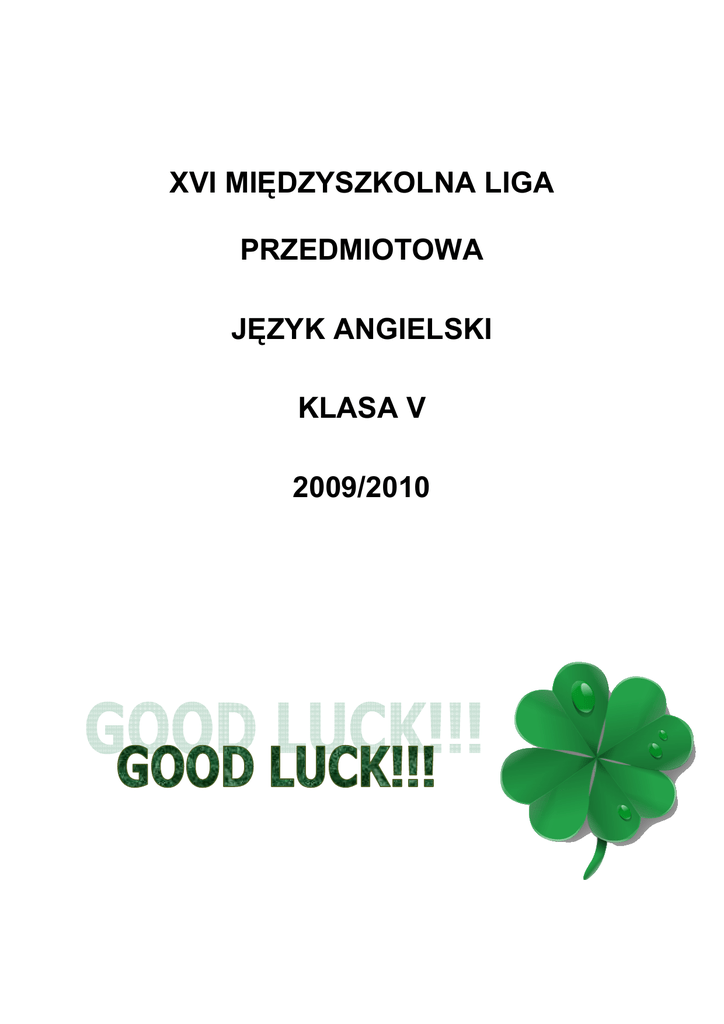 XVI MIĘDZYSZKOLNA LIGA PRZEDMIOTOWA JĘZYK ANGIELSKI KLASA V 2009/2010 I. Napisz właściwe formy czasowników podanych w nawiasach. Użyj czasu Present Simple. Example: My parents like (like) dancing rock and roll. 1. Ann ___________ (write) e-mails to her friends in Great Britain. 2. Tom and Kate __________ (go) to school by bike. 3. Andrew _________ (go) to school on foot. 4. My sister and I ___________ (help) our Mum in the kitchen. 5. The children ___________ (play) in the garden. II. Ustaw wyrazy w zdaniach we właściwej kolejności. Example: attack / sometimes/ Polar bears/ people Polar bears sometimes attack people. 1. lunch/ My brother/ at McDonald’s/ often/ has _____________________________________________ 2. sometimes/ for school/ am/ late/ I _____________________________________________ 3. at seven/ Frank/ o’clock/ gets up _____________________________________________ 4. to the mountains/ go/ Every year/ my parents _____________________________________________ 5. his homework/ always/ in the afternoon/ does/ Harry _____________________________________________ III. Wybierz właściwą formę zaimka. Example: I/ Me like it/ its. 1. You/ Your must do it/its. 2. She/ her often meets he/him after school. 3. We/ Us have got Valentine cards from they/them. 4. You/ Your cat doesn’t like I/ me. 5. He/ Him always goes to the mountains with I/me. IV.Uzupełnij pytania wstawiając: How, What, Where, When, Who. A następnie odpowiedz na nie pełnym zdaniem. Example: What is your name? My name is Mark. 1. ______are you from? ______________________________ 2. ______old are you? _______________________________ 3. ______is your birthday? ___________________________ 4. ______is your phone number? ______________________ 5. ______is your favourite singer? ______________________ V. Przeczytaj tekst i odpowiedz na pytania. Amazing Spider by Ann Smith Peter Parker is a quiet teenager. He lives in a small house in New York City with his Aunt May. Peter hasn’t got many friends. His best friend is Mary Jane. One day, a spider bites Peter in a science lab. Now he’s got special powers! He is strong and fast and he can climb walls, just like a spider! People love him, but he’s got an enemy, the evil Green Goblin. Can Spider-Man stop him? Watch this brilliant film to find out! 1. Where is Spider-Man from? _______________________________________________ 2. Who does he live with? _______________________________________________ 3. Who’s his best friend? _______________________________________________ 4. How does Spider-Man get his special power? _______________________________________________ 5. What can Spider-Man do? _______________________________________________ 6. Who is his enemy? _______________________________________________ VI.Gdzie znajdują się poniższe przedmioty? Uzupełnij je w poniższych kategoriach: sofa, wardrobe, lamp, washbasin, bookcase, sink, fridge, TV, bed, cooker, coffee table, bath, cupboards, toilet, shower, pillows. BEDROOM LIVING ROOM BATHROOM KTCHEN VII. 1. 2. 3. 4. 5. 6. Połącz frazy Learn Go Surf Play Watch Hang out with A. B. C. D. E. F. The Net A DVD Foreign languages Friends Computer games To the library VIII. Jak wygląda Twój dzień? Opisz go. Praca powinna zawierać 5070 słów.